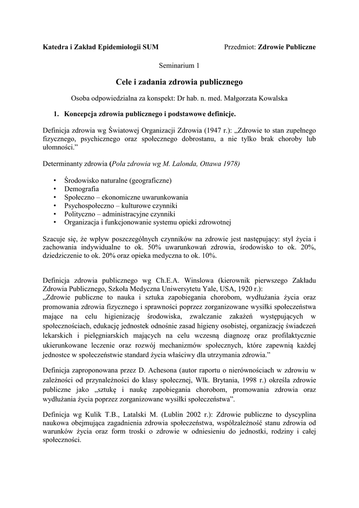 Katedra i Zakład Epidemiologii SUM Przedmiot: Zdrowie Publiczne Seminarium 1 Cele i zadania zdrowia publicznego Osoba odpowiedzialna za konspekt: Dr hab. n. med. Małgorzata Kowalska 1. Koncepcja zdrowia publicznego i podstawowe definicje. Definicja zdrowia wg Światowej Organizacji Zdrowia (1947 r.): „Zdrowie to stan zupełnego fizycznego, psychicznego oraz społecznego dobrostanu, a nie tylko brak choroby lub ułomności.” Determinanty zdrowia (Pola zdrowia wg M. Lalonda, Ottawa 1978) • • • • • • Środowisko naturalne (geograficzne) Demografia Społeczno – ekonomiczne uwarunkowania Psychospołeczno – kulturowe czynniki Polityczno – administracyjne czynniki Organizacja i funkcjonowanie systemu opieki zdrowotnej Szacuje się, że wpływ poszczególnych czynników na zdrowie jest następujący: styl życia i zachowania indywidualne to ok. 50% uwarunkowań zdrowia, środowisko to ok. 20%, dziedziczenie to ok. 20% oraz opieka medyczna to ok. 10%. Definicja zdrowia publicznego wg Ch.E.A. Winslowa (kierownik pierwszego Zakładu Zdrowia Publicznego, Szkoła Medyczna Uniwersytetu Yale, USA, 1920 r.): „Zdrowie publiczne to nauka i sztuka zapobiegania chorobom, wydłużania życia oraz promowania zdrowia fizycznego i sprawności poprzez zorganizowane wysiłki społeczeństwa mające na celu higienizację środowiska, zwalczanie zakażeń występujących w społecznościach, edukację jednostek odnośnie zasad higieny osobistej, organizację świadczeń lekarskich i pielęgniarskich mających na celu wczesną diagnozę oraz profilaktycznie ukierunkowane leczenie oraz rozwój mechanizmów społecznych, które zapewnią każdej jednostce w społeczeństwie standard życia właściwy dla utrzymania zdrowia.” Definicja zaproponowana przez D. Achesona (autor raportu o nierównościach w zdrowiu w zależności od przynależności do klasy społecznej, Wlk. Brytania, 1998 r.) określa zdrowie publiczne jako „sztukę i naukę zapobiegania chorobom, promowania zdrowia oraz wydłużania życia poprzez zorganizowane wysiłki społeczeństwa”. Definicja wg Kulik T.B., Latalski M. (Lublin 2002 r.): Zdrowie publiczne to dyscyplina naukowa obejmująca zagadnienia zdrowia społeczeństwa, współzależność stanu zdrowia od warunków życia oraz form troski o zdrowie w odniesieniu do jednostki, rodziny i całej społeczności. Definicja wg J. Nosko (Szkoła Zdrowia Publicznego, Instytut Medycyny Pracy w Łodzi, 2005 r.): „Zdrowie publiczne jest to troska o zachowanie i umacnianie zdrowia w wymiarze makrospołecznym, lokalnym i środowiskowym, polegająca na naukowym rozpoznawaniu stanu zdrowia i potrzeb zdrowotnych zbiorowości oraz inicjowaniu skoordynowanych wysiłków instytucji rządowych, samorządowych i pozarządowych w celu osiągnięcia pożądanych standardów zdrowia. Cel ten uzyskuje się przez kontrolę czynników ekologicznych, tworzenie sprzyjających zdrowiu warunków społeczno-ekonomicznych, zapobieganie zakaźnym i niezakaźnym chorobom społecznym, powszechny i równy dostęp do opieki medycznej, a przede wszystkim w wyniku kształtowania nawyków zdrowego stylu życia w ramach edukacji przedszkolnej i szkolnej oraz realizacji programów promocji zdrowia w środowisku ludzi dorosłych.” Nowe zdrowie publiczne w definicji M. Miller i M.J. Wysockiego (IZP PZH w Warszawie, 2003 r.): „Nowe zdrowie publiczne (NZP) jest nauką i kompleksowym postępowaniem zmierzającym do zachowania i umacniania zdrowia ludności w wymiarze makrospołecznym i lokalnym. Podstawą tego postępowania jest naukowe rozpoznawanie zdrowia i potrzeb zdrowotnych zbiorowości oraz inicjowanie i organizowanie skoordynowanych wysiłków instytucji rządowych, samorządowych i pozarządowych w celu osiągania pożądanych standardów zdrowia. Cel ten uzyskuje się poprzez wdrażanie podstawowych funkcji zdrowia publicznego, a zwłaszcza przez kształtowanie nawyków zdrowego stylu życia, realizację programów promocji zdrowia, zapobieganie zakaźnym i niezakaźnym chorobom o znaczeniu społecznym, kontrolę czynników ekologicznych, tworzenie sprzyjających zdrowiu warunków społecznoekonomicznych oraz zapewnienie powszechnego i równego dostępu do opieki medycznej.” Koncepcja zdrowia publicznego wg C.Włodarczyka (Instytut Zdrowia Publicznego UJ Collegium Medicum, Kraków, 2000r.): ZDROWIE PUBLICZNE wg WŁODARCZYK C. KRAKÓW 2000 POLITYKA SPOŁECZNA TEORIA ORGANIZACJI ADMINISTRACJA INFORMATYKA MED ZP PSYCHOLOGIA EKONOMIA SOCJOLOGIA HIGIENA EPIDEMIOLOGIA PEDAGOGIKA DEMOGRAFIA PRAWO ETYKA Koncepcja zdrowia publicznego a polityka zdrowotna wg Oxford Textbook of Public Health 2001 r. - ZDROWIE PUBLICZNE - działania racjonalne profesjonaliści zaplecze naukowe EBM stałe wartości – sprawiedliwość w dostępności stałe cele zmienne priorytety - POLITYKA ZDROWOTNA - sfera gry politycznej zmienność celów fasadowość wartości – deklaracje w zależności od społecznych nastrojów zaplecze naukowe – instrumentalne wykorzystywanie Miejsce zdrowia publicznego w systemie ochrony zdrowia ( wg Leowski J. 2001) KOSZTY OPIEKI ZDROWOTNEJ OPIEKA TERMINALNA 3 POZIOM REFERENC. TU KONCENTRU JE SIĘ UWAGA POLITYKÓW OPIEKA SPECJALIST. POZ – MEDYCYNA RODZINNA MIN.KOSZTY ZDROWIE PUBLICZNE 2. Historia zdrowia publicznego – wybrane fakty Hipokrates (400-377p.n.e.) – traktat ‘O powietrzu, wodach i klimatach’ – ojciec medycyny Bernardino Ramazzini (1653-1714) – traktat ‘De morbis artificium diatriba’ – prekursor medycyny pracy Antony Leeuwenhoek (1632-1723) – szlifierz, wynalazca mikroskopu, opisał krwinki, plemniki, strukturę kości i mięśni Gotfryd Wilhelm Leibnitz (1646-1716) – filozof, matematyk i prawnik, domagał się stworzenia systemu publicznej opieki zdrowotnej John Graunt (1620-1674) – prekursor epidemiologii i demografii, analizował zmiany stanu zdrowia brytyjczyków w oparciu o sprawozdania o urodzeniach i zgonach William Farr (1807-1883) – uporządko