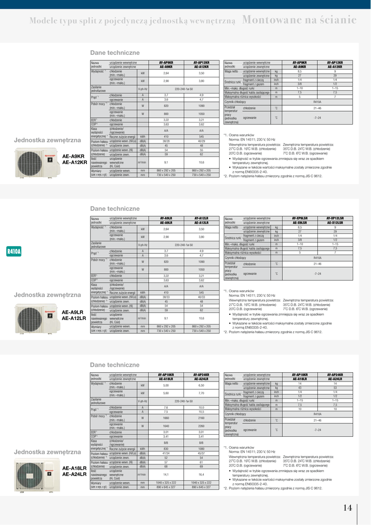 Modele t y pu split z pojedyncz� jednostk� wewn�trzn� Montowane na �cianie Dane techniczne Nazwa jednostki Wydajność *1 urządzenie wewnętrzne urządzenie zewnętrzne chłodzenie (min.–maks.) ogrzewanie (min.–maks.) Zasilanie jednofazowe Jednostka zewnętrzna AE-A9KR AE-A12KR AY-AP12KR AE-A12KR kW 2,64 3,50 kW 2,90 3,80 V-ph-Hz Prąd *1 Pobór mocy AY-AP9KR AE-A9KR *1 EER*1 COP*1 Klasa wydajności energetycznej *1 Poziom hałasu (chłodzenie) *2 Poziom hałasu (chłodzenie) Ilość nawiewanego powietrza Wymiary (szer. x wys. x gł.) A chłodzenie A ogrzewanie chłodzenie W (min.–maks.) ogrzewanie W (min.–maks.) chłodzenie ogrzewanie (chłodzenie/ /ogrzewanie) Roczne zużycie energii kWh urządzenie wewn. (Hi/Lo) dB(A) dB(A) urządzenie zewn. dB(A) urządzenie wewn. (Hi) dB(A) urządzenie zewn. urządzenie m3/min wewnętrzne (Hi, Cool) mm urządzenie wewn. mm urządzenie zewn. 220-240-1ø-50 3,7 3,6 4,9 4,7 820 1090 800 1050 3,22 3,63 3,21 3,62 A/A A/A 410 38/28 45 54 59 545 40/29 48 55 62 9,1 10,6 860 x 292 x 205 730 x 540 x 250 860 x 292 x 205 730 x 540 x 250 AY-A9LR AE-A9LR AY-A12LR AE-A12LR urządzenie wewnętrzne urządzenie zewnętrzne urządzenie wewnętrzne urządzenie zewnętrzne fragment z cieczą Średnica rurki fragment z gazem Min.–maks. długość rurki Maksymalna długość kabla zasilającego Maksymalna różnica wysokości Nazwa jednostki Waga netto kg kg inch inch m m m AY-AP9KR AE-A9KR AY-AP12KR AE-A12KR 8,5 27 1/4 3/8 1–10 7,5 5 9 29 1/4 1/2 1–15 7,5 7 Czynnik chłodzący Przedział temperatur pracy (jednostka zewnętrzna) R410A chłodzenie ˚C 21–46 ogrzewanie ˚C -7–24 *1. Ocena warunków Norma: EN 14511; 230 V, 50 Hz Wewnętrzna temperatura powietrza: Zewnętrzna temperatura powietrza: 35˚C D.B. 24˚C W.B. (chłodzenie) 27˚C D.B. 19˚C W.B. (chłodzenie) 7˚C D.B. 6˚C W.B. (ogrzewanie) 20˚C D.B. (ogrzewanie) • Wydajność w trybie ogrzewania zmniejsza się wraz ze spadkiem temperatury zewnętrznej. • Wykazane w tekście wartości maksymalne zostały zmierzone zgodnie z normą EN60335-2-40. *2. Poziom natężenia hałasu zmierzony zgodnie z normą JIS C 9612. Dane techniczne Nazwa jednostki Wydajność *1 urządzenie wewnętrzne urządzenie zewnętrzne chłodzenie (min.–maks.) ogrzewanie (min.–maks.) Zasilanie jednofazowe kW 2,64 kW 2,90 V-ph-Hz A chłodzenie A ogrzewanie Pobór mocy *1 chłodzenie W (min.–maks.) ogrzewanie W (min.–maks.) *1 EER chłodzenie COP*1 ogrzewanie Klasa (chłodzenie/ wydajności /ogrzewanie) energetycznej *1 Roczne zużycie energii kWh Poziom hałasu urządzenie wewn. (Hi/Lo) dB(A) (chłodzenie) *2 urządzenie zewn. dB(A) dB(A) Poziom hałasu urządzenie wewn. (Hi) (chłodzenie) urządzenie zewn. dB(A) Ilość urządzenie m3/min nawiewanego wewnętrzne powietrza (Hi, Cool) mm urządzenie wewn. Wymiary (szer. x wys. x gł.) urządzenie zewn. mm Prąd *1 Jednostka zewnętrzna AE-A9LR AE-A12LR 3,50 3,80 220-240-1ø-50 3,7 3,6 4,9 4,7 820 1090 800 1050 3,22 3,63 3,21 3,62 A/A A/A 410 38/33 45 54 59 545 40/33 48 54 62 9,1 10,6 860 x 292 x 205 730 x 540 x 250 860 x 292 x 205 730 x 540 x 250 AY-AP18KR AE-A18LR AY-AP24KR AE-A24LR kW 5,00 6,50 kW 5,60 urządzenie wewnętrzne urządzenie zewnętrzne urządzenie wewnętrzne urządzenie zewnętrzne fragment z cieczą Średnica rurki fragment z gazem Min.–maks. długość rurki Maksymalna długość kabla zasilającego Maksymalna różnica wysokości Nazwa jednostki Waga netto kg kg inch inch m m m AY-XP9LSR AE-X9LSR AY-XP12LSR AE-X12LSR 8,5 27 1/4 3/8 1–10 7,5 5 9 29 1/4 1/2 1–15 7,5 7 Czynnik chłodzący Przedział temperatur pracy (jednostka zewnętrzna) R410A chłodzenie ˚C 21–46 ogrzewanie ˚C -7–24 *1. Ocena warunków Norma: EN 14511; 230 V, 50 Hz Wewnętrzna temperatura powietrza: Zewnętrzna temperatura powietrza: 35˚C D.B. 24˚C W.B. (chłodzenie) 27˚C D.B. 19˚C W.B. (chłodzenie) 7˚C D.B. 6˚C W.B. (ogrzewanie) 20˚C D.B. (ogrzewanie) • Wydajność w trybie ogrzewania zmniejsza się wraz ze spadkiem temperatury zewnętrznej. • Wykazane w tekście wartości maksymalne zostały zmierzone zgodnie z normą EN60335-2-40. *2. Poziom natężenia hałasu zmierzony zgodnie z normą JIS C 9612. Dane techniczne Nazwa jednostki Wydajność *1 Zasilanie jednofazowe V-ph-Hz Prąd *1 Pobór mocy Jednostka zewnętrzna AE-A18LR AE-A24LR urządzenie wewnętrzne urządzenie zewnętrzne chłodzenie (min.–maks.) ogrzewanie (min.–maks.) *1 EER*1 COP*1 Klasa wydajności energetycznej *1 Poziom hałasu (chłodzenie) *2 Poziom hałasu (chłodzenie) Ilość nawiewanego powietrza Wymiary (szer. x wys. x gł.) A chłodzenie A ogrzewanie chłodzenie W (min.–maks.) ogrzewanie W (min.–maks.) chłodzenie ogrzewanie (chłodzenie/ /ogrzewanie) Roczne zużycie energii kWh urządzenie wewn. (Hi/Lo) dB(A) dB(A) urządzenie zewn. dB(A) urządzenie wewn. (Hi) dB(A) urządzenie zewn. urządzenie m3/min wewnętrzne (Hi, Cool) mm urządzenie wewn. mm urządzenie zewn. 7,70 220-240-1ø-50 7,6 7,5 10,0 10,5 1660 2160 1640 2260 3,01 3,41 3,01 3,41 B/B B/B 830 41/34 52 57 68 1080 45/37 54 61 69 14,1 16,4 1040 x 325 x 222 890 x 645 x 327 1040 x 325 x 222 890 x 645 x 327 urządzenie wewnętrzne urządzenie zewnętrzne urządzenie wewnętrzne urządzenie zewnętrzne fragment z cieczą Średnica rurki fragment z gazem Min.–maks. długość rurki Maksymalna długość kabla zasilającego Maksymalna różnica wysokości Nazwa jednostki Waga netto kg kg inch inch m m m Czynnik chłodzący Przedział temperatur pracy (jednostka zewnętrzna) AY-AP18KR AE-A18LR AY-AP24KR AE-A24LR 14 43 1/4 1/2 1–15 7,5 10 14 53 1/4 1/2 1–15 7,5 10 R410A chłodzenie ˚C 21–46 ogrzewanie ˚C -7–24 *1. Ocena warunków Norma: EN 14511; 230 V, 50 Hz Wewnętrzna temperatura powietrza: Zewnętrzna temperatura powietrza: 35˚C D.B. 24˚C W.B. (chłodzenie) 27˚C D.B. 19˚C W.B. (chłodzenie) 7˚C D.B. 6˚C W.B. (ogrzewanie) 20˚C D.B. (ogrzewanie) • Wydajność w trybie ogrzewania zmniej