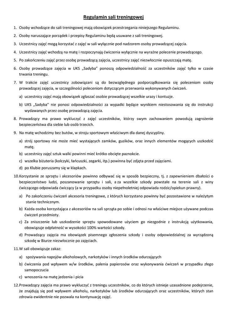 Regulamin sali treningowej 1. Osoby wchodzące do sali treningowej mają obowiązek przestrzegania niniejszego Regulaminu. 2. Osoby naruszające porządek i przepisy Regulaminu będą usuwane z sali treningowej. 3. Uczestnicy zajęć mogą korzystać z zajęć w sali wyłącznie pod nadzorem osoby prowadzącej zajęcia. 4. Uczestnicy zajęć wchodzą na matę i rozpoczynają ćwiczenia wyłącznie na wyraźne polecenie prowadzącego. 5. Po zakończeniu zajęć przez osobę prowadzącą zajęcia, uczestnicy zajęć niezwłocznie opuszczają matę. 6. Osoby prowadzące zajęcia w UKS „Sadyba” ponoszą odpowiedzialność za uczestników zajęć tylko w czasie trwania treningu. 7. W trakcie zajęć uczestnicy zobowiązani są do bezwzględnego podporządkowania się poleceniom osoby prowadzącej zajęcia, w szczególności poleceniom dotyczącym przerwania wykonywanych ćwiczeń. a) uczestnicy zajęć mają obowiązek zgłaszać osobie prowadzącej wszelkie urazy i kontuzje. b) UKS „Sadyba” nie ponosi odpowiedzialności za wypadki będące wynikiem niestosowania się do instrukcji wydawanych przez osobę prowadzącą zajęcia. 8. Prowadzący ma prawo wykluczyć z zajęć uczestników, którzy swym zachowaniem powodują zagrożenie bezpieczeństwa dla siebie lub osób trzecich. 9. Na matę wchodzimy bez butów, w stroju sportowym właściwym dla danej dyscypliny. a) strój sportowy nie może mieć wystających zamków, guzików, oraz innych elementów mogących uszkodzić matę. b) uczestnicy zajęć sztuk walki powinni mieć krótko obcięte paznokcie. c) wszelka biżuteria (kolczyki, łańcuszki, zegarki, itp.) powinna być zdjęta przed zajęciami. d) po Klubie poruszamy się w klapkach. 10.Korzystanie ze sprzętu i akcesoriów powinno odbywać się w sposób bezpieczny, tj. z zapewnieniem dbałości o bezpieczeństwo ludzi, poszanowanie sprzętu i sali, a za wszelkie szkody powstałe na terenie sali z winy ćwiczącego odpowiada ćwiczący (a w przypadku osoby niepełnoletniej odpowiada rodzic/opiekun prawny). a) Po zakończeniu ćwiczeń akcesoria treningowe, z których korzystano powinny być pozostawione w należytym stanie technicznym. b) Każda osoba korzystająca z akcesoriów na sali sprząta po sobie i odnosi na właściwe miejsce używane podczas ćwiczeń przedmioty. c) Za zniszczenie lub uszkodzenie sprzętu spowodowane użyciem go niezgodnie z instrukcją użytkowania, obowiązuje odpłatność w wysokości 100% wartości szkody. d) Prowadzący zajęcia ma obowiązek pisemnego zgłoszenia szkody i osoby odpowiedzialnej za wyrządzoną szkodę w Biurze niezwłocznie po zajęciach. 11.W sali obowiązuje zakaz: a) spożywania napojów alkoholowych, narkotyków i innych środków odurzających b) ćwiczenia pod wpływem w/w środków, palenia papierosów oraz wykonywania ćwiczeń w przypadku złego samopoczucia c) wnoszenia na matę jedzenia i picia 12.Prowadzący zajęcia ma prawo wykluczyć z treningu uczestników, co do których istnieje uzasadnione podejrzenie, że znajdują się pod wpływem alkoholu, narkotyków lub środków odurzających oraz uczestników, których stan zdrowia ewidentnie nie pozwala na kontynuację zajęć.