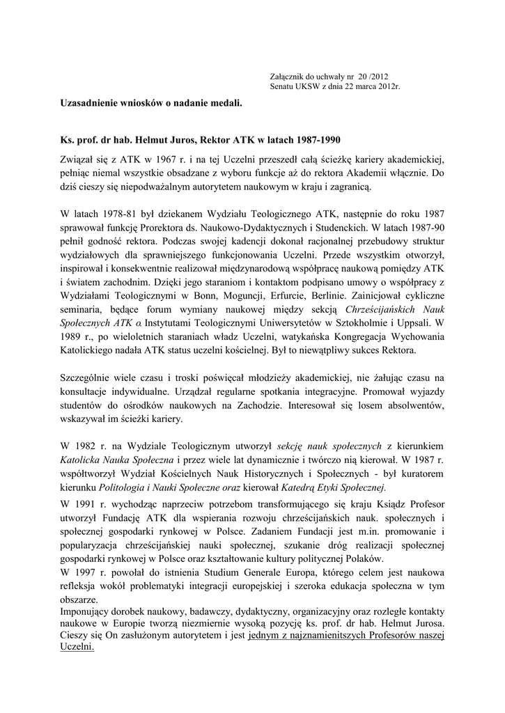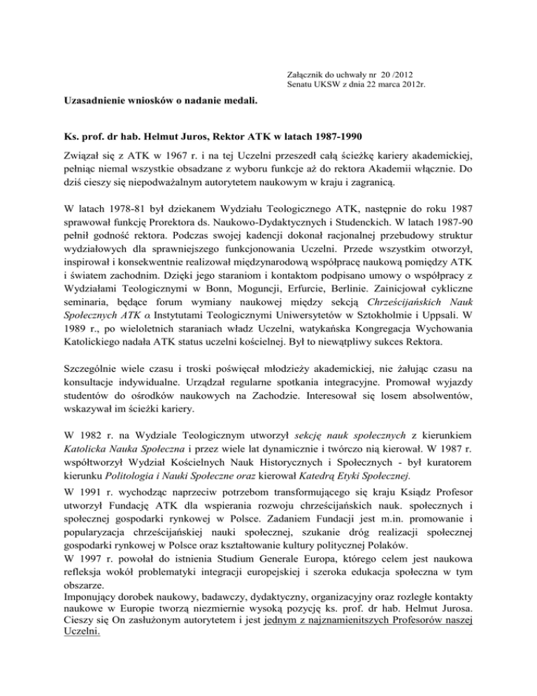 Załącznik do uchwały nr 20 /2012 Senatu UKSW z dnia 22 marca 2012r. Uzasadnienie wniosków o nadanie medali. Ks. prof. dr hab. Helmut Juros, Rektor ATK w latach 1987-1990 Związał się z ATK w 1967 r. i na tej Uczelni przeszedł całą ścieżkę kariery akademickiej, pełniąc niemal wszystkie obsadzane z wyboru funkcje aż do rektora Akademii włącznie. Do dziś cieszy się niepodważalnym autorytetem naukowym w kraju i zagranicą. W latach 1978-81 był dziekanem Wydziału Teologicznego ATK, następnie do roku 1987 sprawował funkcję Prorektora ds. Naukowo-Dydaktycznych i Studenckich. W latach 1987-90 pełnił godność rektora. Podczas swojej kadencji dokonał racjonalnej przebudowy struktur wydziałowych dla sprawniejszego funkcjonowania Uczelni. Przede wszystkim otworzył, inspirował i konsekwentnie realizował międzynarodową współpracę naukową pomiędzy ATK i światem zachodnim. Dzięki jego staraniom i kontaktom podpisano umowy o współpracy z Wydziałami Teologicznymi w Bonn, Moguncji, Erfurcie, Berlinie. Zainicjował cykliczne seminaria, będące forum wymiany naukowej między sekcją Chrześcijańskich Nauk Społecznych ATK o. Instytutami Teologicznymi Uniwersytetów w Sztokholmie i Uppsali. W 1989 r., po wieloletnich staraniach władz Uczelni, watykańska Kongregacja Wychowania Katolickiego nadała ATK status uczelni kościelnej. Był to niewątpliwy sukces Rektora. Szczególnie wiele czasu i troski poświęcał młodzieży akademickiej, nie żałując czasu na konsultacje indywidualne. Urządzał regularne spotkania integracyjne. Promował wyjazdy studentów do ośrodków naukowych na Zachodzie. Interesował się losem absolwentów, wskazywał im ścieżki kariery. W 1982 r. na Wydziale Teologicznym utworzył sekcję nauk społecznych z kierunkiem Katolicka Nauka Społeczna i przez wiele lat dynamicznie i twórczo nią kierował. W 1987 r. współtworzył Wydział Kościelnych Nauk Historycznych i Społecznych - był kuratorem kierunku Politologia i Nauki Społeczne oraz kierował Katedrą Etyki Społecznej. W 1991 r. wychodząc naprzeciw potrzebom transformującego się kraju Ksiądz Profesor utworzył Fundację ATK dla wspierania rozwoju chrześcijańskich nauk. społecznych i społecznej gospodarki rynkowej w Polsce. Zadaniem Fundacji jest m.in. promowanie i popularyzacja chrześcijańskiej nauki społecznej, szukanie dróg realizacji społecznej gospodarki rynkowej w Polsce oraz kształtowanie kultury politycznej Polaków. W 1997 r. powołał do istnienia Studium Generale Europa, którego celem jest naukowa refleksja wokół problematyki integracji europejskiej i szeroka edukacja społeczna w tym obszarze. Imponujący dorobek naukowy, badawczy, dydaktyczny, organizacyjny oraz rozległe kontakty naukowe w Europie tworzą niezmiernie wysoką pozycję ks. prof. dr hab. Helmut Jurosa. Cieszy się On zasłużonym autorytetem i jest jednym z najznamienitszych Profesorów naszej Uczelni. Ks. prof. dr hab. Edmund Morawiec, Prorektor ATK w latach 1987-1993. Związany jest z ATK/UKSW od 1964 r. i przeszedł tu całą drogę naukową od asystenta do profesora zwyczajnego. Wybitny i ceniony naukowiec oraz dydaktyk. Od samego początku bardzo aktywny i zaangażowany, ma ogromne zasługi w budowaniu prestiżu Uczelni. W latach 1972-1978 był prodziekanem Wydziału Filozofii Chrześcijańskiej. W latach 19871993 pełnił funkcję prorektora ATK odpowiadając za byt materialny Uczelni oraz sprawy dotyczące organizacji studiów. Z wielkim zaangażowaniem podjął się tych obowiązków. Brał czynny i inspirujący udział w procesie wydzierżawienia terenu pod nowy gmach dydaktyczny ATK przy ul. Dewajtis, uzyskania pozwolenia na budowę i rozpoczęcia inwestycji. Zabiegał i doprowadził do przekształcenia specjalności w kierunek psychologii na Wydziale Filozofii Chrześcijańskiej, czego najbardziej doniosłym skutkiem było uzyskane prawo przyznawania absolwentom dyplomu magistra. Intensywnie uczestniczył w pracach nad nowym statutem i przygotowaniem dokumentacji dla Stolicy Apostolskiej w celu uznania ATK jako uczelni państwowej i kościelnej. Doprowadził do przyjęcia przez Ministerstwo Szkolnictwa Wyższego bilansu finansowego ATK, przełamując w tej sprawie wieloletni impas. Uzyskał znaczące zwiększenie liczby etatów na Uczelni, zarówno dla pracowników naukowodydaktycznych, jak i administracyjnych. Aktywnie i twórczo uczestniczył w Rektorskim Zespole Doradczym do spraw Przekształcenia ATK w UKSW. Jego znaczącą rolę w tym procesie ujawnił b. rektor UKSW ksiądz prof. Roman Bartnicki w Księdze Pamiątkowej, dedykowanej ks. profesorowi Morawcowi z okazji 70. rocznicy urodzin: „Szczególne zasługi położył o. prof. Edmund Morawiec dla sprawy przekształcenia ATK w uniwersytet. Od samego początku pojawienia się tej idei był jej gorącym zwolennikiem. Służył radą i wspierał moralnie rektora ATK, ks. prof. dr hab. Jana Łacha. Także następny rektor zaprosił ks. prof. Morawca do współpracy w staraniach o uniwersytet i zasięgał jego opinii. W pewnym momencie ks. prof. E. Morawiec zadecydował o losach starań o uniwersytet. Był to okres impasu. Gdy wydawało się, że wyczerpane zostały możliwości dalszych negocjacji ks. Morawiec podczas spotkania grupy zaangażowanej w tę ideę, zwrócił się do przedstawicieli władz rektorskich z wezwaniem: „skoro ks. Prymas zalecił zasięgnąć opinii Kongregacji, jedźcie natychmiast do Rzymu i w bezpośrednich rozmowach na pewno znajdziecie pozytywne rozwiązanie ". Zgodnie z tą sugestią do Rzymu udali się ks. rektor R. Bartnicki i ks. dziekan W. Góralski i ich wizyta w wiecznym mieście była przełomem w staraniach. Jeszcze nie zdążyli wrócić z Rzymu, a z Kongregacji przyszło już pozytywne rozwiązanie." Prof. dr hab. Edward Nieznański, Prorektor UKSW w latach 1999-2002. Związany jest z ATK/UKSW od roku 1957, kiedy to rozpoczął studia w zakresie logiki na Wydziale Filozofii