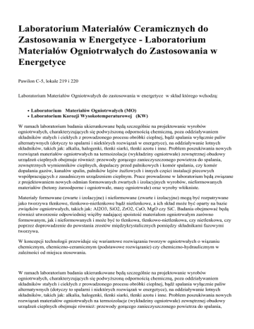 Laboratorium Materiałów Ceramicznych do Zastosowania w Energetyce - Laboratorium Materiałów Ogniotrwałych do Zastosowania w Energetyce Pawilon C-5, lokale 219 i 220 Laboratorium Materiałów Ogniotrwałych do zastosowania w energetyce w skład którego wchodzą: Laboratorium Materiałów Ogniotrwałych (MO) Laboratorium Korozji Wysokotemperaturowej (KW) W ramach laboratorium badania ukierunkowane będą szczególnie na projektowanie wyrobów ogniotrwałych, charakteryzujących się podwyższoną odpornością chemiczną, poza oddziaływaniem składników stałych i ciekłych z prowadzonego procesu obróbki cieplnej, bądź spalania wyłącznie paliw alternatywnych (dotyczy to spalarni i niektórych rozwiązań w energetyce), na oddziaływanie lotnych składników, takich jak: alkalia, halogenki, tlenki siarki, tlenki azotu i inne. Problem poszukiwania nowych rozwiązań materiałów ogniotrwałych na termoizolacje (wykładziny ogniotrwałe) zewnętrznej obudowy urządzeń cieplnych obejmuje również: przewody gorącego zanieczyszczonego powietrza do spalania, zewnętrznych wymienników cieplnych, dopalaczy przed palnikowych i komór spalania, czy komór dopalania gazów, kanałów spalin, palników lejów żużlowych i innych części instalacji piecowych współpracujących z zasadniczym urządzeniem cieplnym. Prace prowadzone w laboratorium będą związane z projektowaniem nowych odmian formowanych zwartych i izolacyjnych wyrobów, nieformowanych materiałów (betony żaroodporne i ogniotrwałe, masy ogniotrwałe) oraz wyroby włókniste. Materiały formowane (zwarte i izolacyjne) i nieformowane (zwarte i izolacyjne) mogą być rozpatrywane jako tworzywa tlenkowe, tlenkowo-nietlenkowe bądź nietlenkowe, a ich skład może być oparty na bazie związków ogniotrwałych, takich jak: Al2O3, SiO2, ZrO2, CaO, MgO czy SiC. Badania obejmować będą również utworzenie odpowiedniej więźby nadającej spoistość materiałom ogniotrwałym zarówno formowanym, jak i nieformowanych i może być to tlenkowa, tlenkowo-nietlenkowa, czy nietlenkowa, czy poprzez doprowadzenie do powstania zrostów międzykrystalicznych pomiędzy składnikami fazowymi tworzywa. W koncepcji technologii przewiduje się wariantowe rozwiązania tworzyw ogniotrwałych o wiązaniu chemicznym, chemiczno-ceramicznym (podstawowe rozwiązanie) czy chemiczno-hydraulicznym w zależności od miejsca stosowania. W ramach laboratorium badania ukierunkowane będą szczególnie na projektowanie wyrobów ogniotrwałych, charakteryzujących się podwyższoną odpornością chemiczną, poza oddziaływaniem składników stałych i ciekłych z prowadzonego procesu obróbki cieplnej, bądź spalania wyłącznie paliw alternatywnych (dotyczy to spalarni i niektórych rozwiązań w energetyce), na oddziaływanie lotnych składników, takich jak: alkalia, halogenki, tlenki siarki, tlenki azotu i inne. Problem poszukiwania nowych rozwiązań materiałów ogniotrwałych na termoizolacje (wykładziny ogniotrwałe) zewnętrznej obudowy urządzeń cieplnych obejmuje również: przewody gorącego zanieczyszczonego powietrza do spalania, składników, takich jak: alkalia, halogenki, tlenki siarki, tlenki azotu i inne. Problem poszukiwania nowych rozwiązań materiałów ogniotrwałych na termoizolacje (wykładziny ogniotrwałe) zewnętrznej obudowy urządzeń cieplnych obejmuje również: przewody gorącego zanieczyszczonego powietrza do spalania, zewnętrznych wymienników cieplnych, dopalaczy przed palnikowych i komór spalania, czy komór dopalania gazów, kanałów spalin, palników lejów żużlowych i innych części instalacji piecowych współpracujących z zasadniczym urządzeniem cieplnym. Prace prowadzone w laboratorium będą związane z projektowaniem nowych odmian formowanych zwartych i izolacyjnych wyrobów, nieformowanych materiałów (betony żaroodporne i ogniotrwałe, masy ogniotrwałe) oraz wyroby włókniste. Materiały formowane (zwarte i izolacyjne) i nieformowane (zwarte i izolacyjne) mogą być rozpatrywane jako tworzywa tlenkowe, tlenkowo-nietlenkowe bądź nietlenkowe, a ich skład może być oparty na bazie związków ogniotrwałych, takich jak: Al2O3, SiO2, ZrO2, CaO, MgO czy SiC. Badania obejmować będą również utworzenie odpowiedniej więźby nadającej spoistość materiałom ogniotrwałym zarówno formowanym, jak i nieformowanych i może być to tlenkowa, tlenkowo-nietlenkowa, czy nietlenkowa, czy poprzez doprowadzenie do powstania zrostów międzykrystalicznych pomiędzy składnikami fazowymi tworzywa. W koncepcji technologii przewiduje się wariantowe rozwiązania tworzyw ogniotrwałych o wiązaniu chemicznym, chemiczno-ceramicznym (podstawowe rozwiązanie) czy chemiczno-hydraulicznym w zależności od miejsca stosowania. Użytkownicy laboratorium dr inż. Mirosław Bućko tel. 12 617 35 72; tel. 601-954-500 e-mail: [email protected] ; [email protected] Miejsce pracy: WIMiC, Katedra Ceramiki i Materiałów Ogniotrwałych, B-4, ul. Akademicka 2, I p, 13