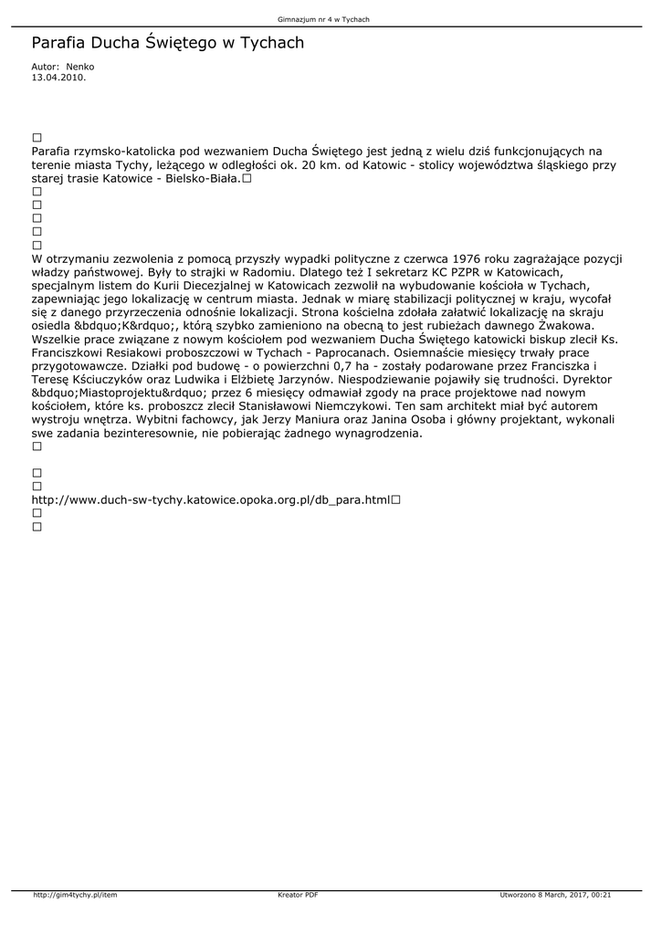 Gimnazjum nr 4 w Tychach Parafia Ducha Świętego w Tychach Autor: Nenko 13.04.2010. Parafia rzymsko-katolicka pod wezwaniem Ducha Świętego jest jedną z wielu dziś funkcjonujących na terenie miasta Tychy, leżącego w odległości ok. 20 km. od Katowic - stolicy województwa śląskiego przy starej trasie Katowice - Bielsko-Biała. W otrzymaniu zezwolenia z pomocą przyszły wypadki polityczne z czerwca 1976 roku zagrażające pozycji władzy państwowej. Były to strajki w Radomiu. Dlatego też I sekretarz KC PZPR w Katowicach, specjalnym listem do Kurii Diecezjalnej w Katowicach zezwolił na wybudowanie kościoła w Tychach, zapewniając jego lokalizację w centrum miasta. Jednak w miarę stabilizacji politycznej w kraju, wycofał się z danego przyrzeczenia odnośnie lokalizacji. Strona kościelna zdołała załatwić lokalizację na skraju osiedla „K”, którą szybko zamieniono na obecną to jest rubieżach dawnego Żwakowa. Wszelkie prace związane z nowym kościołem pod wezwaniem Ducha Świętego katowicki biskup zlecił Ks. Franciszkowi Resiakowi proboszczowi w Tychach - Paprocanach. Osiemnaście miesięcy trwały prace przygotowawcze. Działki pod budowę - o powierzchni 0,7 ha - zostały podarowane przez Franciszka i Teresę Kściuczyków oraz Ludwika i Elżbietę Jarzynów. Niespodziewanie pojawiły się trudności. Dyrektor „Miastoprojektu” przez 6 miesięcy odmawiał zgody na prace projektowe nad nowym kościołem, które ks. proboszcz zlecił Stanisławowi Niemczykowi. Ten sam architekt miał być autorem wystroju wnętrza. Wybitni fachowcy, jak Jerzy Maniura oraz Janina Osoba i główny projektant, wykonali swe zadania bezinteresownie, nie pobierając żadnego wynagrodzenia. http://www.duch-sw-tychy.katowice.opoka.org.pl/db_para.html http://gim4tychy.pl/item Kreator PDF Utworzono 8 March, 2017, 00:21