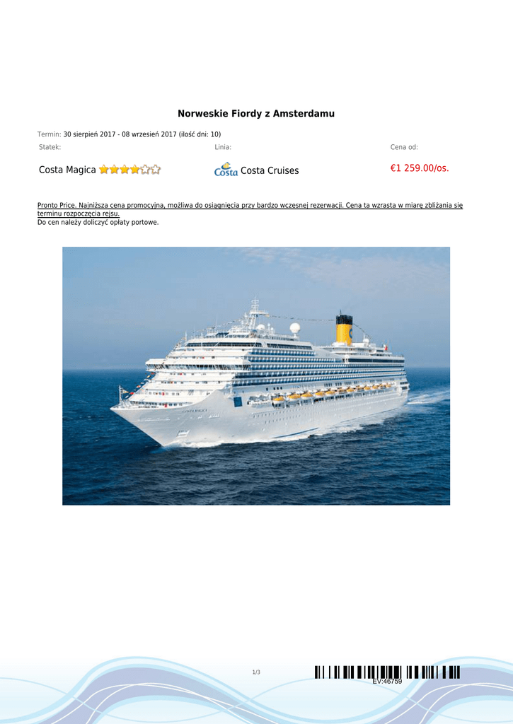 Norweskie Fiordy z Amsterdamu Termin: 30 sierpień 2017 - 08 wrzesień 2017 (ilość dni: 10) Statek: Costa Magica Linia: Cena od: Costa Cruises €1 259.00/os. Pronto Price. Najniższa cena promocyjna, możliwa do osiągnięcia przy bardzo wczesnej rezerwacji. Cena ta wzrasta w miarę zbliżania się terminu rozpoczęcia rejsu. Do cen należy doliczyć opłaty portowe. 1/3 EV:46759 TRASA REJSU Data Port Wpłynięcie Wypłynięcie środa 30.08.2017 Amsterdam --:-- 17:00 dzień 2 czwartek 31.08.2017 Dzień na morzu --:-- --:-- dzień 3 piątek 01.09.2017 Bergen 08:00 17:00 Norwegia sobota 02.09.2017 09:00 18:00 Norwegia 07:00 17:00 07:00 14:00 16:00 17:00 10:00 20:00 dzień 1 dzień 4 Holandia Olden niedziela 03.09.2017 Andalsnes poniedziałek 04.09.2017 Geiranger poniedziałek 04.09.2017 Hellesylt wtorek 05.09.2017 Stavanger dzień 8 środa 06.09.2017 Dzień na morzu --:-- --:-- dzień 9 czwartek 07.09.2017 Bremerhaven 08:00 14:00 piątek 08.09.2017 Amsterdam 08:00 --:-- dzień 5 dzień 6 dzień 6 dzień 7 dzień 10 Legenda Norwegia Norwegia Norwegia Norwegia Niemcy Holandia CENNIK Kabina wewnętrzna Cena katalogowa Cena promocyjna na zapytanie od €1 259.00 2/3 EV:46759 Kabina zewnętrzna z oknem na zapytanie od €1 579.00 Kabina zewnętrzna z balkonem na zapytanie od €1 859.00 Suite (apartament) na zapytanie Kabina jednoosobowa na zapytanie 3 i 4 osoba dorosła w kabinie na zapytanie dziecko do 18 lat jako 3 i 4 osoba w kabinie Opłaty portowe tylko opłaty portowe €150.00 Uwaga! Ceny za osobę w kabinie dwuosobowej. Cena zawiera: zakwaterowanie w kabinie wybranej kategorii; wyżywienie - 3 główne posiłki, przekąski między posiłkami; napoje serwowane do śniadania i w bufetach samoobsługowych; serwis bagażowy podczas wejścia i zejścia ze statku; serwis kabinowy; korzystanie ze wszystkich urządzeń sportowo - rekreacyjnych znajdujących się na pokładzie statku (basen, jacuzzi, sala fitness, itp.); udział we wszystkich imprezach organizowanych na statku (przedstawienia w teatrze, koncerty, programy animacyjne itp.). Cena nie zawiera: kosztów dojazdu do portu; opłat portowych; ewentualnych noclegów w hotelu przed/po rejsie i transferów; wycieczek fakultatywnych w trakcie rejsu; korzystania z barów, mini baru w kabinie oraz napojów zamawianych w restauracji; korzystania z punktów usługowych (fryzjer, pralnia, fotograf, salon piękności i odnowy biologicznej, internet) i wydatków osobistych; napiwków dla obsługi na statku (kwota uzależniona od długości rejsu); ubezpieczenia KL, NNW i bagaż, kosztów wiz (tam gdzie wymagane). Uwagi: Od 01.12.2015 na wszystkich rejsach Costa Cruises (z min. 5 noclegów) można zarezerwować następujące pakiety all inclusive: dla dzieci 4-17 lat Giovani od 15.99€/os./dzień, dla dorosłych: Brindiamo od 24.99€/os./dzień, Piu Gusto od 27.99€/os./dzień, Intenditore od 45.99€/os./dzień (pakiet musi być wykupiony przez każdą osobę zakwaterowaną w kabinie - można zakupić w biurze przed rejsem). Na Państwa życzenie zarezerwujemy przelot, transfery do/z portu, parking, dodatkowe noclegi oraz zadbamy o odpowiednie ubezpieczenie podróżne. 3/3 EV:46759