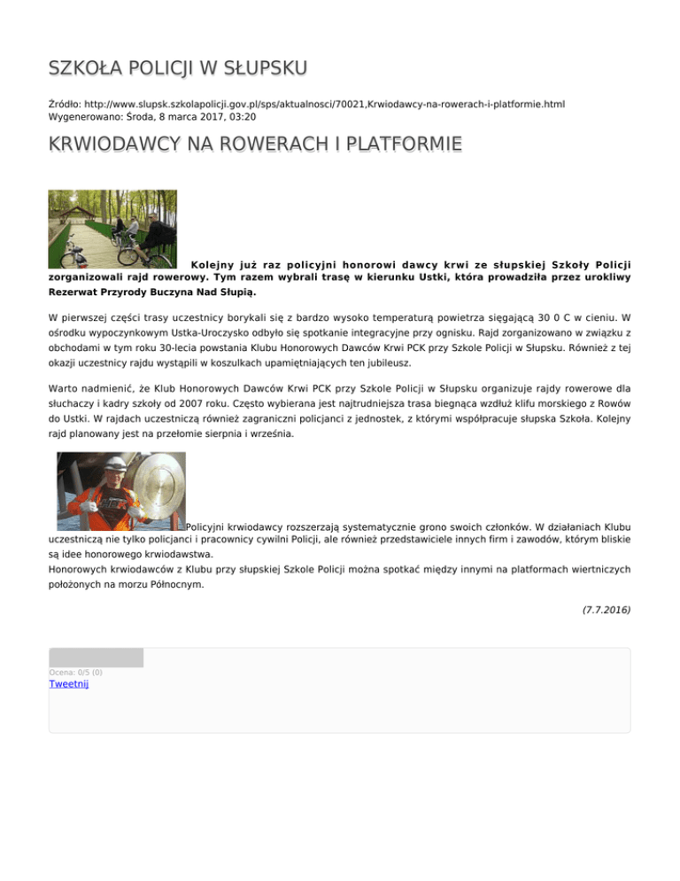 SZKOŁA POLICJI W SŁUPSKU Źródło: http://www.slupsk.szkolapolicji.gov.pl/sps/aktualnosci/70021,Krwiodawcy-na-rowerach-i-platformie.html Wygenerowano: Środa, 8 marca 2017, 03:20 KRWIODAWCY NA ROWERACH I PLATFORMIE Kolejny już raz policyjni honorowi dawcy krwi ze słupskiej Szkoły Policji zorganizowali rajd rowerowy. Tym razem wybrali trasę w kierunku Ustki, która prowadziła przez urokliwy Rezerwat Przyrody Buczyna Nad Słupią. W pierwszej części trasy uczestnicy borykali się z bardzo wysoko temperaturą powietrza sięgającą 30 0 C w cieniu. W ośrodku wypoczynkowym Ustka-Uroczysko odbyło się spotkanie integracyjne przy ognisku. Rajd zorganizowano w związku z obchodami w tym roku 30-lecia powstania Klubu Honorowych Dawców Krwi PCK przy Szkole Policji w Słupsku. Również z tej okazji uczestnicy rajdu wystąpili w koszulkach upamiętniających ten jubileusz. Warto nadmienić, że Klub Honorowych Dawców Krwi PCK przy Szkole Policji w Słupsku organizuje rajdy rowerowe dla słuchaczy i kadry szkoły od 2007 roku. Często wybierana jest najtrudniejsza trasa biegnąca wzdłuż klifu morskiego z Rowów do Ustki. W rajdach uczestniczą również zagraniczni policjanci z jednostek, z którymi współpracuje słupska Szkoła. Kolejny rajd planowany jest na przełomie sierpnia i września. Policyjni krwiodawcy rozszerzają systematycznie grono swoich członków. W działaniach Klubu uczestniczą nie tylko policjanci i pracownicy cywilni Policji, ale również przedstawiciele innych firm i zawodów, którym bliskie są idee honorowego krwiodawstwa. Honorowych krwiodawców z Klubu przy słupskiej Szkole Policji można spotkać między innymi na platformach wiertniczych położonych na morzu Północnym. (7.7.2016) Ocena: 0/5 (0) Tweetnij