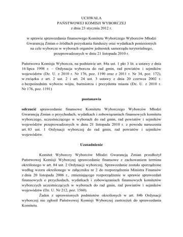 UCHWAŁA PAŃSTWOWEJ KOMISJI WYBORCZEJ z dnia 23 stycznia 2012 r. w sprawie sprawozdania finansowego Komitetu Wyborczego Wyborców Młodzi Gwarancją Zmian o źródłach pozyskania funduszy oraz wydatkach poniesionych na cele wyborcze w wyborach organów jednostek samorządu terytorialnego, przeprowadzonych w dniu 21 listopada 2010 r. Państwowa Komisja Wyborcza, na podstawie art. 84a ust. 1 pkt 3 lit. a ustawy z dnia 16 lipca 1998 r. – Ordynacja wyborcza do rad gmin, rad powiatów i sejmików województw (Dz. U. z 2010 r. Nr 176, poz. 1190 oraz z 2011 r. Nr 34, poz. 172), w związku z art. 2 ust. 2 i art. 24 ust. 3 ustawy z dnia 20 czerwca 2002 r. o bezpośrednim wyborze wójta, burmistrza i prezydenta miasta (Dz. U. z 2010 r. Nr 176, poz. 1191) postanawia odrzucić sprawozdanie finansowe Komitetu Wyborczego Wyborców Młodzi Gwarancją Zmian o przychodach, wydatkach i zobowiązaniach finansowych komitetu wyborczego, uczestniczącego w wyborach do rad gmin, rad powiatów i sejmików województw przeprowadzonych w dniu 21 listopada 2010 r. z powodu naruszenia art. 83 ust. 1 Ordynacji wyborczej do rad gmin, rad powiatów i sejmików województw. Uzasadnienie Komitet Wyborczy Wyborców Młodzi Gwarancją Zmian przedłożył Państwowej Komisji Wyborczej sprawozdanie finansowe z zachowaniem terminu określonego w art. 84 ust. 2 Ordynacji wyborczej. Sprawozdanie zostało sporządzone według wzoru określonego w załączniku nr 2 do rozporządzenia Ministra Finansów z dnia 20 listopada 2006 r., zmieniającego rozporządzenie w sprawie sprawozdań finansowych o przychodach, wydatkach i zobowiązaniach finansowych komitetów wyborczych uczestniczących w wyborach do rad gmin, rad powiatów i sejmików województw (Dz. U. Nr 212, poz. 1560). Żaden z uprawnionych podmiotów określonych w art. 84b Ordynacji wyborczej nie zgłosił Państwowej Komisji Wyborczej zastrzeżeń do sprawozdania Komitetu. 2 Komitet Wyborczy Wyborców Młodzi Gwarancją Zmian po uzyskaniu postanowienia potwierdzającego jego utworzenie, zarejestrował 17 kandydatów na radnych w wyborach do sejmików województw i 2 kandydatów na radnych w wyborach do rad gmin. Sprawozdanie, które zostało złożone przez Komitet, zawiera nieścisłości oraz braki. Nie podano w nim: okresu za jaki sprawozdanie zostało złożone, kwot niektórych wpływów lub wydatków i wykazu gmin w których Komitet zarejestrował kandydatów. W sprawozdaniu wykazano wysokość prowizji bankowych w kwocie 132,00 zł w części II „informacje szczegółowe”, poz.4 – Kredyty bankowe. Komitet nie zaciągnął kredytu bankowego, a kwota opłat za prowadzenie rachunku bankowego powinna być umieszczona w części I „Informacje ogólne” lit. C wydatki/koszty poz. I.4 „pozostałe wydatki pieniężne”. Niezgodne ze stanem faktycznym sporządzenie sprawozdania narusza obowiązek sprawozdawczy, określony w art. 84 ust 2 Ordynacji wyborczej do rad gmin, rad powiatów i sejmików województw. Uchybienie to, w świetle art. 84a Ordynacji wyborczej, nie stanowi przesłanki do odrzucenia sprawozdania. Do sprawozdania nie dołączono dokumentów potwierdzających poniesienie niektórych wydatków. Państwowa Komisja Wyborcza w trybie art. 84a ust. 2 Ordynacji wyborczej zwróciła się do Komitetu o wyjaśnienie nieścisłości i uzupełnienie braków. Pytania zostały wysłane listem poleconym odebranym przez pełnomocnika finansowego w dniu 17.11.2011 r. Do dnia podjęcia niniejszej uchwały pełnomocnik finansowy Komitetu nie udzielił odpowiedzi na pytania Państwowej Komisji Wyborczej. W sprawozdaniu finansowym Komitet wykazał, że pozyskał środki w kwocie 430,00 zł. Pochodziły one, zgodnie z art. 83c ust. 3 Ordynacji wyborczej, z wpłat od osób fizycznych. Środki finansowe Komitetu były gromadzone na rachunku bankowym nr 95 1500 1445 1214 4007 9510 0000, prowadzonym w Kredyt Bank SA. Komitet wykazał wydatki w wysokości 430,00 zł. Kwota ta nie znajduje jednak potwierdzenia w przedstawionych dokumentach. Do sprawozdania dołączono fakturę zakupową na kwotę 219,48 zł oraz dokumenty potwierdzające poniesienie kosztów na opłaty bankowe w wysokości 132,00 zł. W pozycji „pozostałe wydatki pieniężne” wpisano specyfikację wydatków „oficjalna korespondencja K.W.W.”, jednak nie podano kwoty tych wydatków; nie zostały one również udokumentowane. Niedostarczenie dokumentów potwierdzających wydatki uniemożliwia stwierdzenie, że wydatki te zostały dokonane na cele związane z wyborami, co rodzi domniemanie faktyczne naruszenia art. 83 ust. 1 Ordynacji wyborczej. (zob. postanowienie Sądu Najwyższego z dnia 14 października 2008 r., sygn. akt. III SW 10/08). 3 Naruszenie art. 83 ust. 1 Ordynacji wyborczej, na podstawie jej art. 84a ust. 1 pkt 3 lit. a, powoduje odrzucenie sprawozdania finansowego komitetu. Koszty kampanii wyborczej nie przekroczyły limitu obliczonego na podstawie art. 83e ust. 2 i 3 Ordynacji wyborczej oraz art. 24 ust. 5 ustawy o bezpośrednim wyborcze wójta, burmistrza i prezydenta miasta, wynoszącego 113 000,00 zł. Państwowa Komisja Wyborcza, po zapoznaniu się ze sprawozdaniem finansowym Komitetu Wyborczego Wyborców Młodzi Gwarancją Zmian, postanowiła jak w sentencji. Od niniejszego postanowienia pełnomocnikowi finansowemu Komitetu Wyborczego Wyborców Młodzi Gwarancją Zmian przysługuje prawo wniesienia skargi do Sądu Najwyższego, w terminie 14 dni od dnia doręczenia postanowienia. Przewodniczący Państwowej Komisji Wyborczej: Stefan J. Jaworski Zastępcy Przewodniczącego Państwowej Komisji Wyborczej: Andrzej Kisielewicz, Stanisław Kosmal Członkowie Państwowej Komisji Wyborczej: Bogusław Dauter, Andrzej Mączyński, Janusz Niemcewicz, Włodzimierz Ryms, Stanisław Zabłocki