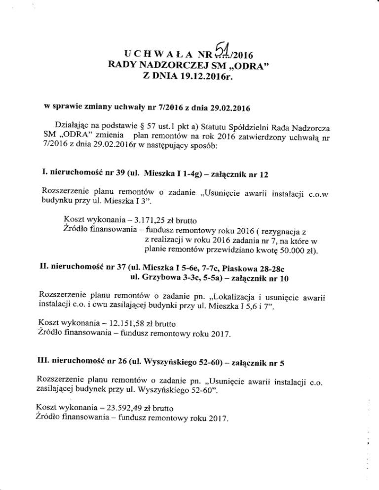 ucHwAŁA NR 5L.,roru RADY NADZORCZEJ sM,,oDRA,o Z DNIA 19.12.2016r. w sprawie zmiany uchwaĘ nr 7l20t6 z dnia 29.02.2016 Działając na podstawie § 57 ust.l pkt a) Statufu Spółdzielni Rada Nadzorcza SM ,,ODRA" zmienia plan remontów na rok 2016 zatwierdzony uchwałą nr 712016 z dnia29.02.2016r w następujący sposób: _ I. nieruchomość nr 39 (uI. Mieszka I Lag - załączniknr 12 Rozszętzęnię planu remontów o zadanie ,,usunięcie awarii instalacji c.o.w budylku przy uL. Mieszka I 3''. Koszt wykonania - 3.I7 1,25 zł brutto Zródło ftnansowania - fundusz remontowy roku 201 6 ( rezygnacja z z realizacji w roku 2016 zadania nr 7 , na które w planie remontów przewidziano kwotę 50.000 zł). II. nieruchomość nr 37 (ul. Mieszka I5-6e,7-7c, Piaskowa 28-28c ul. Grzybowa 3-3c, 5-5a) - załącznik nr 10 Rozszerzęnie planu remontów o zadanię pn. ,,Lokalizacja i usunięcie awarii instalacji c.o. i cwu zasilalącej budynki przy uL Mieszka l Ś,e i r . Koszt wykonania- I2.15t,58 zł brutto Zródło finansowania - fundusz remontowy roku2017. III. nieruchomośćnr 26 (ut. Wyszyńskiego 52-60) załącznik nr 5 Rozszerzenie planu remontów o zadanie pn. ,,usunięcie awarii instalacji c.o. zasil,ającej budynek przy ul, Wyszyński ego 52-60''. Koszt wykonania - 23.592,49 złbrutto Zródło finansowania - fundusz remontowy roku2017. IV. nieruchomośćnr22 (ul. Wyszyńskiego 2-10) załącznik nr 1) Rozszerzęnie planu remontów o zadanie pn. ,,usunięcia awarii instalacji c.o. przed budynkiem ul. Wyszyńskiego 10'', Koszt wykonania - 21 ,549,86 złbrutto Zródło finansowania - fundusz remontowy roku20l7. V. nieruchomość nr 32 (ul. Piaskowa 72-104) Rozszęrzenie planu remont ów - załączniknr 9 o zadanie pn. ,,usunięcie awarii kanalizacji deszczowej w budynku przy ul. Piaskowej 84'' Koszt wykonania - 1.17 0,24 zł brutto Zródło finansowania - fundusz remontowy roku 2016. W. nieruchomość nr 39 (uI. Mieszka I 1,2,3 i 4) - zalącznik nr t2 zwiększenie nakładów na zadaniu nr 9 pn. ,, Remont pomieszczeń ogólnego użytku. . " z kwoĘ 6.800 zł do kwoty 1 1. 1 60, l 9 zł tj. o 4.360,19 zt. . Źródło finansowania - fundusz remontowv roku 2016. V[I. nieruchomość nr 29 (uI. Wyszyńskiego 33-59) - załącznik nr 6 Rozszerzenie planu remontów o zadanie pn. ,,wymiana drzwi wejściowych do boksu śmietnikowego przy u\. Wyszyńskiego 33''. Koszt wykonania - 3.020 zł brutto Zródło finansowania - fundusz remontowy roku 2016 VIII. nieruchomość nr 36(ut. Piłsudsklego 26-32)- załącznik nr 19 Rozszerzenie planu remontów o zadanie pn. ,,Wykonanie montż krat metalowych przed wejściamido klatek schodowych budynku przy ul. Piłsudskiego 26,28 i 32". Koszt wykonania - 1 .715,00 złbrutto Zródło finansowania - fundusz remontowy roku 20-16. IX. nieruchomość nr 25 (ul. Wyszyńskieg o 42-50) - załącznik nr 4 Rozszerzenie planu remontów o zadanie ,,usunięcie awarii instalacji ccw piwnicy budynku przy ul. Wyszyńskiego 44''. 5oszt wykonania- 5.013,24 złbrutto Zródło finansowania - fundusz remontowy roku 2016 X. nieruchomość nr 12 (ul. Przybora 1-5, Bankowa 51-57, ul. Piłsudskiego 22-24) - załącznik nr 18 Rozszerzenie planu remontów o zadanie pn. ,,Naprawa nieszczelnościtarasu w mieszkaniu przy ll.Przybora 5l9". Koszt wykonania- 1.674 złbrutto Zródło finansowania - fundusz remontowy roku 2016. Uchwała wchodzi w Ęcie z dniem jej podjęcia. Za przyjęciemuchwaĘ głosowało.?. osób Przeciw uchwale głosowało .9.. osób SEKRETARZ RADY NADZORCZEJ ę\=_l "e ......._-=_',,:.11 LESZEKPIECHOCKI PRZEWODMCZĄCY RADY N doźbp,czr,s '-""1[-""^ NADZORCZA l|L*łł;t;*"at ił, POLICĄCl-i RADA Spółdzieiniff;:o'Ę,uol"*'; RoCcg