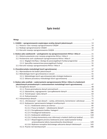 Spis treści Wstęp ............................................................................................................................................... 7 1. CAQDA – oprogramowanie wspierające analizę danych jakościowych .................................... 13 1.1. Historia i stan rozwoju oprogramowania CAQDA ............................................................... 14 1.2. Rodzaje oprogramowania CAQDA ...................................................................................... 16 1.3. Kierunki rozwoju oprogramowania CAQDA ........................................................................ 17 2. Badacz jako użytkownik – posługiwanie się oprogramowaniem NVivo i Atlas.ti .................... 21 2.1. Historia powstania oraz rozwoju programów NVivo i Atlas.ti ............................................. 21 2.2. Porównanie cech użytkowych oprogramowania NVivo i Atlas.ti ........................................ 24 2.2.1. Wygląd interfejsu i dostęp do poszczególnych funkcji programów ......................... 24 2.2.2. Specyfika nazewnictwa poszczególnych funkcji ...................................................... 31 2.3. Kierunki rozwoju oprogramowania NVivo i Atlas.ti ............................................................ 32 3. Charakterystyka metodologii teorii ugruntowanej ................................................................... 37 3.1. Wprowadzenie do badań jakościowych .............................................................................. 37 3.2. Metodologia teorii ugruntowanej w zarysie ....................................................................... 41 3.2.1. Metodologia teorii ugruntowanej jako strategia badawcza ..................................... 42 3.2.2. Główne procedury metodologii teorii ugruntowanej .............................................. 43 4. Badacz jako analityk – wykorzystanie oprogramowania NVivo i Atlas.ti w badaniach jakościowych prowadzonych z zastosowaniem metodologii teorii ugruntowanej ................. 47 4.1. Zarządzanie danymi ............................................................................................................ 48 4.1.1. Proces gromadzenia danych pierwotnych ................................................................ 49 4.1.2. Edytowanie, segregowanie i porządkowanie danych ............................................... 56 4.1.3. Transkrypcje i opisy danych ...................................................................................... 63 4.1.4. Podsumowanie ......................................................................................................... 71 4.2. Interpretacja danych ........................................................................................................... 71 4.2.1. „Tematyzacja” i opis danych – cytaty, odniesienia, komentarze i adnotacje ............ 72 4.2.2. Kodowanie i generowanie kategorii analitycznych .................................................. 84 4.2.2.1. Kodowanie wiersz po wierszu ..................................................................... 85 4.2.2.2. Praca na kodach – rekodowanie danych ..................................................... 97 4.2.2.3. Porządkowanie kodów i kategorii .............................................................. 100 4.2.2.4. Paradygmat kodowania ............................................................................. 106 4.2.2.5. Kodowanie selektywne ............................................................................. 118 4.2.2.6. Funkcja komentarzy oraz informacji o kodach (definicje kodów) ............. 121 4.2.2.7. Wspomaganie procesu kodowania przez wykorzystanie funkcji przeszukiwania tekstu (wyszukiwarka słownikowa) ................................. 129 4.2.2.8. Wybrane narzędzia ilościowego zaliczania danych tekstowych ............... 142 4.2.3. Pisanie not teoretycznych ...................................................................................... 146 6 4.2.4. Metoda ciągłego porównywania ............................................................................ 156 4.2.4.1. Przeglądanie zawartości kategorii ............................................................. 158 4.2.4.2. Tworzenie matryc ...................................................................................... 161 4.2.4.2.1. NVivo – narzędzia do tworzenia matryc ................................... 162 4.2.4.2.2. Atlas.ti – funkcje odpowiadające za generowanie matryc ........ 171 4.2.4.3. Narzędzia przeszukiwania – kwerenda danych ......................................... 176 4.2.4.3.1. Opcje zapytań w programie NVivo ........................................... 177 4.2.4.3.2. Narzędzia zapytań w programie Atlas.ti ................................... 195 4.2.4.4. Podsumowanie .......................................................................................... 212 4.2.5. Budowanie i ugruntowywanie hipotez ................................................................... 213 4.2.6. Tworzenie modeli i diagramów integrujących ........................................................ 217 4.2.7. Pisanie raportu z badań i eksportowanie danych .................................................. 246 5. Stosowanie oprogramowania CAQDA w kontekście realizacji badań opartych na MTU – możliwości i ograniczenia .................................................................................................... 269 Zakończenie ................................................................................................................................. 273 Bibliografia ................................................................................................................................... 277 Summary ...................................................................................................................................... 281