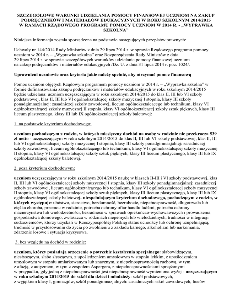 SZCZEGÓŁOWE WARUNKI UDZIELANIA POMOCY FINANSOWEJ UCZNIOM NA ZAKUP PODRĘCZNIKÓW I MATERIAŁÓW EDUKACYJNYCH W ROKU SZKOLNYM 2014/2015 W RAMACH RZĄDOWEGO PROGRAMU POMOCY UCZNIOM W 2014 R. - „WYPRAWKA SZKOLNA” Niniejsza informacja została sporządzona na podstawie następujących przepisów prawnych: Uchwały nr 144/2014 Rady Ministrów z dnia 29 lipca 2014 r. w sprawie Rządowego programu pomocy uczniom w 2014 r. – „Wyprawka szkolna” oraz Rozporządzenia Rady Ministrów z dnia 29 lipca 2014 r. w sprawie szczegółowych warunków udzielania pomocy finansowej uczniom na zakup podręczników i materiałów edukacyjnych /Dz. U. z dnia 31 lipca 2014 r. poz. 1024/. Uprawnieni uczniowie oraz kryteria jakie należy spełnić, aby otrzymać pomoc finansową Pomoc uczniom objętych Rządowym programem pomocy uczniom w 2014 r. – „Wyprawka szkolna” w formie dofinansowania zakupu podręczników i materiałów edukacyjnych w roku szkolnym 2014/2015 będzie udzielana: uczniom uczęszczającym w roku szkolnym 2014/2015 do klas II, III lub VI szkoły podstawowej, klas II, III lub VI ogólnokształcącej szkoły muzycznej I stopnia, klasy III szkoły ponadgimnazjalnej: zasadniczej szkoły zawodowej, liceum ogólnokształcącego lub technikum, klasy VI ogólnokształcącej szkoły muzycznej II stopnia, klasy VI ogólnokształcącej szkoły sztuk pięknych, klasy III liceum plastycznego, klasy III lub IX ogólnokształcącej szkoły baletowej: 1. na podstawie kryterium dochodowego: uczniom pochodzącym z rodzin, w których miesięczny dochód na osobę w rodzinie nie przekracza 539 zł netto - uczęszczającym w roku szkolnym 2014/2015 do klas II, III lub VI szkoły podstawowej, klas II, III lub VI ogólnokształcącej szkoły muzycznej I stopnia, klasy III szkoły ponadgimnazjalnej: zasadniczej szkoły zawodowej, liceum ogólnokształcącego lub technikum, klasy VI ogólnokształcącej szkoły muzycznej II stopnia, klasy VI ogólnokształcącej szkoły sztuk pięknych, klasy III liceum plastycznego, klasy III lub IX ogólnokształcącej szkoły baletowej. 2. poza kryterium dochodowym: uczniom uczęszczającym w roku szkolnym 2014/2015 naukę w klasach II-III i VI szkoły podstawowej, klas II, III lub VI ogólnokształcącej szkoły muzycznej I stopnia, klasy III szkoły ponadgimnazjalnej: zasadniczej szkoły zawodowej, liceum ogólnokształcącego lub technikum, klasy VI ogólnokształcącej szkoły muzycznej II stopnia, klasy VI ogólnokształcącej szkoły sztuk pięknych, klasy III liceum plastycznego, klasy III lub IX ogólnokształcącej szkoły baletowej- niespełniającym kryterium dochodowego, pochodzącym z rodzin, w których występuje: ubóstwo, sieroctwo, bezdomność, bezrobocie, niepełnosprawność, długotrwała lub ciężka choroba, przemoc w rodzinie, potrzeba ochrony ofiar handlu ludźmi, potrzeba ochrony macierzyństwa lub wielodzietności, bezradność w sprawach opiekuńczo-wychowawczych i prowadzenia gospodarstwa domowego, zwłaszcza w rodzinach niepełnych lub wielodzietnych, trudności w integracji cudzoziemców, którzy uzyskali w Rzeczypospolitej Polskiej status uchodźcy lub ochronę uzupełniającą, trudność w przystosowaniu do życia po zwolnieniu z zakładu karnego, alkoholizm lub narkomania, zdarzenie losowe i sytuacja kryzysowa. 3. bez względu na dochód w rodzinie: uczniom, którzy posiadają orzeczenie o potrzebie kształcenia specjalnego: słabowidzącym, niesłyszącym, słabo słyszącym, z upośledzeniem umysłowym w stopniu lekkim, z upośledzeniem umysłowym w stopniu umiarkowanym lub znacznym, z niepełnosprawnością ruchową, w tym z afazją, z autyzmem, w tym z zespołem Aspergera, z niepełnosprawnościami sprzężonymi w przypadku, gdy jedną z niepełnosprawności jest niepełnosprawność wymieniona wyżej - uczęszczającym w roku szkolnym 2014/2015 do szkół dla dzieci i młodzieży: szkół podstawowych, z wyjątkiem klasy I, gimnazjów, szkół ponadgimnazjalnych: zasadniczych szkół zawodowych, liceów ogólnokształcących, techników lub szkół specjalnych przysposabiających do pracy dla uczniów z upośledzeniem umysłowym w stopniu umiarkowanym lub znacznym oraz dla uczniów z niepełnosprawnościami sprzężonymi, lub do ogólnokształcących szkół muzycznych I stopnia , z wyjątkiem klasy I, ogólnokształcących szkół muzycznych II stopnia, ogólnokształcących szkół sztuk pięknych, liceów plastycznych lub ogólnokształcących szkół baletowych – pomoc w formie dofinansowania udzielana będzie na zakupu podręczników do kształcenia ogólnego, w tym podręczników do kształcenia specjalnego lub podręczników do kształcenia w zawodach Uczniom, którzy posiadają orzeczenie o potrzebie kształcenia specjalnego z upośledzeniem umysłowym w stopniu umiarkowanym lub znacznym oraz uczniów z niepełnosprawnościami sprzężonymi, w przypadku gdy jedną z niepełnosprawności jest upośledzenie umysłowe w stopniu umiarkowanym lub znacznympomoc w formie dofinansowania udzielana będzie również na zakup materiałów edukacyjnych. Nie dotyczy to uczniów z upośledzeniem umysłowym lub znacznym oraz uczniów z niepełno sprawnościami sprzężonymi, w przypadku gdy jedną z niepełnosprawności jest upośledzenie umysłowe w stopniu umiarkowanym lub znacznym, uczęszczającym w roku szkolnym 2014/2015 do klasy I szkoły podstawowej, w przypadku gdy uczniowie ci korzystają z darmowego podręcznika do zajęć z zakresu edukacji wczesnoszkolnej „Nasz elementarz” zapewnionego przez Ministerstwo Edukacji Narodowej. W roku szkolnym 2014/2015 z „Wyprawki szkolnej” zostali wyłączeni pierwszoklasiści szkół podstawowych, którzy 1 września otrzymają rządowy podręcznik do edukacji wczesnoszkolnej „Nasz elementarz” zapewniony przez Ministerstwo Edukacji Narodowej. Wysokość pomocy finansowej w formie dofinansowania zakupu podręczników i materiałów edukacyjnych będzie wynosić: Dla ucznia spe