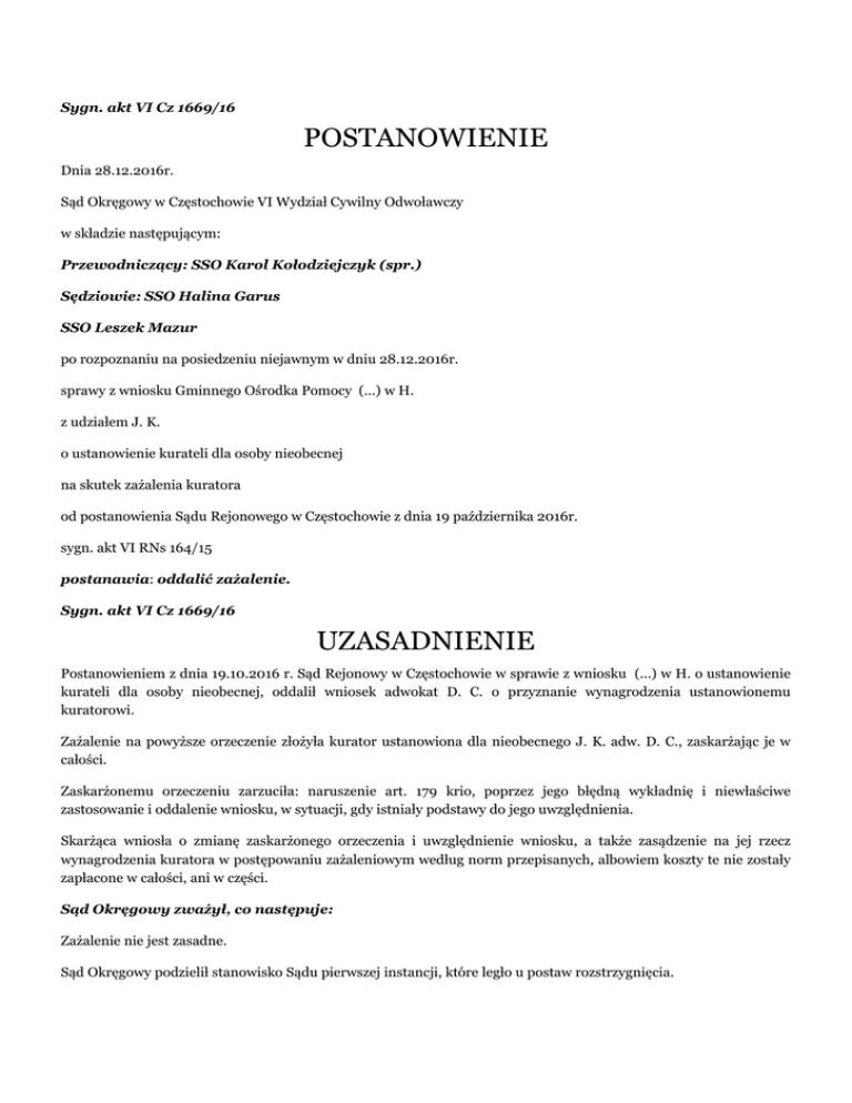 Sygn. akt VI Cz 1669/16 POSTANOWIENIE Dnia 28.12.2016r. Sąd Okręgowy w Częstochowie VI Wydział Cywilny Odwoławczy w składzie następującym: Przewodniczący: SSO Karol Kołodziejczyk (spr.) Sędziowie: SSO Halina Garus SSO Leszek Mazur po rozpoznaniu na posiedzeniu niejawnym w dniu 28.12.2016r. sprawy z wniosku Gminnego Ośrodka Pomocy (...) w H. z udziałem J. K. o ustanowienie kurateli dla osoby nieobecnej na skutek zażalenia kuratora od postanowienia Sądu Rejonowego w Częstochowie z dnia 19 października 2016r. sygn. akt VI RNs 164/15 postanawia: oddalić zażalenie. Sygn. akt VI Cz 1669/16 UZASADNIENIE Postanowieniem z dnia 19.10.2016 r. Sąd Rejonowy w Częstochowie w sprawie z wniosku (...) w H. o ustanowienie kurateli dla osoby nieobecnej, oddalił wniosek adwokat D. C. o przyznanie wynagrodzenia ustanowionemu kuratorowi. Zażalenie na powyższe orzeczenie złożyła kurator ustanowiona dla nieobecnego J. K. adw. D. C., zaskarżając je w całości. Zaskarżonemu orzeczeniu zarzuciła: naruszenie art. 179 krio, poprzez jego błędną wykładnię i niewłaściwe zastosowanie i oddalenie wniosku, w sytuacji, gdy istniały podstawy do jego uwzględnienia. Skarżąca wniosła o zmianę zaskarżonego orzeczenia i uwzględnienie wniosku, a także zasądzenie na jej rzecz wynagrodzenia kuratora w postępowaniu zażaleniowym według norm przepisanych, albowiem koszty te nie zostały zapłacone w całości, ani w części. Sąd Okręgowy zważył, co następuje: Zażalenie nie jest zasadne. Sąd Okręgowy podzielił stanowisko Sądu pierwszej instancji, które legło u postaw rozstrzygnięcia. Wypada zwrócić uwagę, że kurator ustanowiony przez Sąd na podstawie art. 184 § 1 krio do zastępowania strony w postępowaniu administracyjnym, nie jest kuratorem prawa materialnego, zatem do wynagrodzenia kuratora, będącego przedstawicielem strony w postępowaniu administracyjnym, nie mają zastosowania przepisy rozporządzenia Ministra Sprawiedliwości w sprawie stawek i warunków przyznawania i wypłaty ryczałtu przysługującemu sędziom i pracownikom sądowym za dokonanie oględzin oraz stawek za należności kuratora, przepisy rozporządzenia Ministra Sprawiedliwości w sprawie opłat za czynności adwokackie, ani też przepis art. 179 krio. Zgodnie z art. 179 zd. 1 krio, organ państwowy, który ustanowił kuratora, przyzna mu na jego żądanie stosowne wynagrodzenie za sprawowanie kurateli. Taka zasada faktycznie obowiązuje w postępowaniu sądowym, jednakże jeżeli kurator dla osoby nieobecnej był wyznaczony do działania w postępowaniu administracyjnym, jak w niniejszej sprawie, Sąd powszechny nie jest organem właściwym do przyznania wynagrodzenia. W takiej sytuacji wynagrodzenie przyznaje organ administracyjny. Należy mieć na względzie, iż wynagrodzenie przedstawiciela dla nieobecnej strony postępowania administracyjnego, ustanowionego na wniosek organu administracyjnego zgłoszony na podstawie art. 34 § 1 k.p.a., należy do kosztów postępowania administracyjnego (por. uchwała SN z dnia 09.02.1989 r., III CZP 117/88, OSNC 1990/1/11; wyrok NSA w Warszawie z dnia 19.12.2013 r., I OSK 2636/12, LEX nr 1529034). Zgodnie ze stanowiskiem judykatury, Przyznanie wynagrodzenia przedstawicielowi strony, ustanowionemu w trybie art. 34 § 1 k.p.a. stanowi akt z zakresu administracji publicznej w rozumieniu art. 3 § 1 pkt 4 p..p.s.a., dotyczący uprawnień wynikających z przepisów prawa, inny, niż decyzja lub postanowienie. Przyznane mu wynagrodzenie nie podlega kontroli sądu powszechnego. Właściwym do rozpoznania skargi w tym zakresie jest wojewódzki sąd administracyjny (por. wyrok SA w Katowicach z dnia 23.02.2016 r., III AUa 161/15, LEX nr 2039671). Mając na względzie wskazane argumenty, Sąd odwoławczy na podstawie art. 385 k.p.c. w zw. z art. 397 § 2 k.p.c., orzekł jak w sentencji.