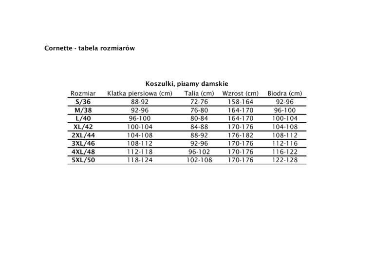 Cornette - tabela rozmiarów Koszulki, piżamy damskie Rozmiar S/36 M/38 L/40 XL/42 2XL/44 3XL/46 4XL/48 5XL/50 Klatka piersiowa (cm) 88-92 92-96 96-100 100-104 104-108 108-112 112-118 118-124 Talia (cm) 72-76 76-80 80-84 84-88 88-92 92-96 96-102 102-108 Wzrost (cm) 158-164 164-170 164-170 170-176 176-182 170-176 170-176 170-176 Biodra (cm) 92-96 96-100 100-104 104-108 108-112 112-116 116-122 122-128