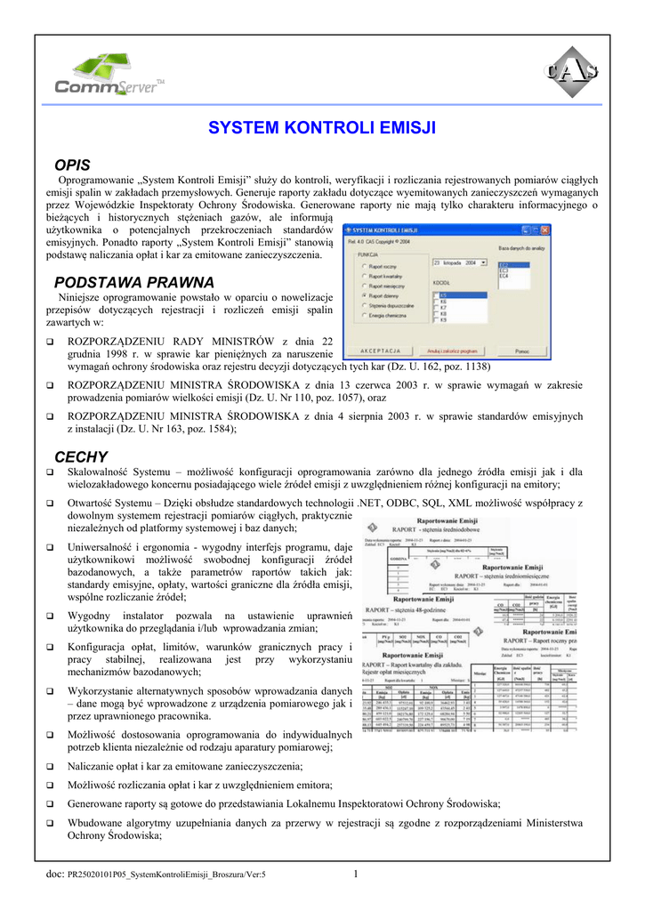 SYSTEM KONTROLI EMISJI OPIS Oprogramowanie „System Kontroli Emisji” służy do kontroli, weryfikacji i rozliczania rejestrowanych pomiarów ciągłych emisji spalin w zakładach przemysłowych. Generuje raporty zakładu dotyczące wyemitowanych zanieczyszczeń wymaganych przez Wojewódzkie Inspektoraty Ochrony Środowiska. Generowane raporty nie mają tylko charakteru informacyjnego o bieżących i historycznych stężeniach gazów, ale informują użytkownika o potencjalnych przekroczeniach standardów emisyjnych. Ponadto raporty „System Kontroli Emisji” stanowią podstawę naliczania opłat i kar za emitowane zanieczyszczenia. PODSTAWA PRAWNA Niniejsze oprogramowanie powstało w oparciu o nowelizacje przepisów dotyczących rejestracji i rozliczeń emisji spalin zawartych w: ROZPORZĄDZENIU RADY MINISTRÓW z dnia 22 grudnia 1998 r. w sprawie kar pieniężnych za naruszenie wymagań ochrony środowiska oraz rejestru decyzji dotyczących tych kar (Dz. U. 162, poz. 1138) ROZPORZĄDZENIU MINISTRA ŚRODOWISKA z dnia 13 czerwca 2003 r. w sprawie wymagań w zakresie prowadzenia pomiarów wielkości emisji (Dz. U. Nr 110, poz. 1057), oraz ROZPORZĄDZENIU MINISTRA ŚRODOWISKA z dnia 4 sierpnia 2003 r. w sprawie standardów emisyjnych z instalacji (Dz. U. Nr 163, poz. 1584); CECHY Skalowalność Systemu – możliwość konfiguracji oprogramowania zarówno dla jednego źródła emisji jak i dla wielozakładowego koncernu posiadającego wiele źródeł emisji z uwzględnieniem różnej konfiguracji na emitory; Otwartość Systemu – Dzięki obsłudze standardowych technologii .NET, ODBC, SQL, XML możliwość współpracy z dowolnym systemem rejestracji pomiarów ciągłych, praktycznie niezależnych od platformy systemowej i baz danych; Uniwersalność i ergonomia - wygodny interfejs programu, daje użytkownikowi możliwość swobodnej konfiguracji źródeł bazodanowych, a także parametrów raportów takich jak: standardy emisyjne, opłaty, wartości graniczne dla źródła emisji, wspólne rozliczanie źródeł; Wygodny instalator pozwala na ustawienie uprawnień użytkownika do przeglądania i/lub wprowadzania zmian; Konfiguracja opłat, limitów, warunków granicznych pracy i pracy stabilnej, realizowana jest przy wykorzystaniu mechanizmów bazodanowych; Wykorzystanie alternatywnych sposobów wprowadzania danych – dane mogą być wprowadzone z urządzenia pomiarowego jak i przez uprawnionego pracownika. Możliwość dostosowania oprogramowania do indywidualnych potrzeb klienta niezależnie od rodzaju aparatury pomiarowej; Naliczanie opłat i kar za emitowane zanieczyszczenia; Możliwość rozliczania opłat i kar z uwzględnieniem emitora; Generowane raporty są gotowe do przedstawiania Lokalnemu Inspektoratowi Ochrony Środowiska; Wbudowane algorytmy uzupełniania danych za przerwy w rejestracji są zgodne z rozporządzeniami Ministerstwa Ochrony Środowiska; doc: PR25020101P05_SystemKontroliEmisji_Broszura/Ver:5 1 GENEROWANE RAPORTY RAPORT DOBOWY - rejestruje stężenie w każdej godzinie w ciągu doby. Wyświetlany w dwóch trybach: pełnym (wszystkie godziny rejestracji) oraz pracy stabilnej (źródło pracowało zgodnie z ustawionymi parametrami). Podaje wartość minimalną i maksymalną oraz wartość dopuszczalną stężenia każdego z zanieczyszczeń dla danego źródła; RAPORT MIESIĘCZNY - wartości średnio dobowe ważone ilością rodzin rejestracji w każdej dobie dają wartość średnio miesięczną , która porównywana jest z wartością dopuszczalną; RAPORT WARTOŚCI 48-GODZINNYCH porównywany z wartością 110% wartości dopuszczalnej w każdym zdarzeniu, biorąc za podstawę dzień bieżący i poprzedni w sposób ciągły i rozliczenie tych zdarzeń po roku kalendarzowym zgodnie z rozporządzeniem MŚ; RAPORT KWARTALNY – wartości średnio kwartalne wyliczane są z wartości średnio miesięcznych, w oparciu o te średnie są wyliczane kary za przekroczenia. Możliwe jest również rozliczenie wartości kwartalnych ważonych względem natężenia przepływu spalin dla wspólnego emitora i rozliczenie przekroczeń po roku kalendarzowym zgodnie z rozporządzeniem MŚ; RAPORT ROCZNY - Raport roczny przekroczeń. - generuje rejestr zdarzeń i nalicza kary za niedotrzymanie standardów emisyjnych przekroczeń miesięcznych i zdarzeń 48-godzinnych w rozliczeniu rocznym. Możliwe jest również rozliczenie po roku kalendarzowym wartości ważonych względem natężenia przepływu spalin dla wspólnego emitora, zgodnie z rozporządzeniem MŚ; REFERENCJE System został pomyślnie wdrożony w Zakładzie Elektrociepłowni S.A. w Łodzi. Jest on podstawą naliczania opłat i ew. kar za emitowane zanieczyszczenia. ZEC S.A. w Łodzi to trzy elektrociepłownie o łącznej mocy cieplnej 2500 MW oraz 500 MW elektrycznej. DODATKOWE INFORMACJE Kategoria Program użytkowy; Docelowy użytkownik Użytkownik końcowy; System Operacyjny Windows 2000 Windows 2003 Windows 2008 Windows XP Windows Vista Windows 7 .NET Framework ODBC ORACLE Crystal Reports XML Wykorzystywane technologie www.commsvr.com www.cas.eu [email protected] doc: PR25020101P05_SystemKontroliEmisji_Broszura/Ver:5 2