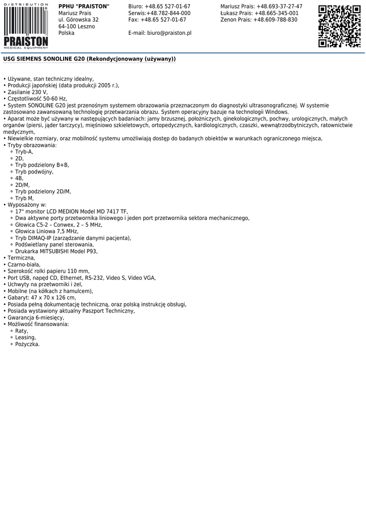PPHU "PRAISTON" Mariusz Prais ul. Górowska 32 64-100 Leszno Polska Biuro: +48.65 527-01-67 Serwis:+48.782-844-000 Fax: +48.65 527-01-67 Mariusz Prais: +48.693-37-27-47 Łukasz Prais: +48.665-345-001 Zenon Prais: +48.609-788-830 E-mail: [email protected] USG SIEMENS SONOLINE G20 (Rekondycjonowany (używany)) • Używane, stan techniczny idealny, • Produkcji japońskiej (data produkcji 2005 r.), • Zasilanie 230 V, • Częstotliwość 50-60 Hz, • System SONOLINE G20 jest przenośnym systemem obrazowania przeznaczonym do diagnostyki ultrasonograficznej. W systemie zastosowano zawansowaną technologię przetwarzania obrazu. System operacyjny bazuje na technologii Windows. • Aparat może być używany w następujących badaniach: jamy brzusznej, położniczych, ginekologicznych, pochwy, urologicznych, małych organów (piersi, jąder tarczycy), mięśniowo szkieletowych, ortopedycznych, kardiologicznych, czaszki, wewnątrzodbytniczych, ratownictwie medycznym, • Niewielkie rozmiary, oraz mobilność systemu umożliwiają dostęp do badanych obiektów w warunkach ograniczonego miejsca, • Tryby obrazowania: ⚬ Tryb-A, ⚬ 2D, ⚬ Tryb podzielony B+B, ⚬ Tryb podwójny, ⚬ 4B, ⚬ 2D/M, ⚬ Tryb podzielony 2D/M, ⚬ Tryb M, • Wyposażony w: ⚬ 17" monitor LCD MEDION Model MD 7417 TF, ⚬ Dwa aktywne porty przetwornika liniowego i jeden port przetwornika sektora mechanicznego, ⚬ Głowica C5-2 – Conwex, 2 – 5 MHz, ⚬ Głowica Liniowa 7,5 MHz, ⚬ Tryb DIMAQ-IP (zarządzanie danymi pacjenta), ⚬ Podświetlany panel sterowania, ⚬ Drukarka MITSUBISHI Model P93, • Termiczna, • Czarno-biała, • Szerokość rolki papieru 110 mm, • Port USB, napęd CD, Ethernet, RS-232, Video S, Video VGA, • Uchwyty na przetworniki i żel, • Mobilne (na kółkach z hamulcem), • Gabaryt: 47 x 70 x 126 cm, • Posiada pełną dokumentację techniczną, oraz polską instrukcję obsługi, • Posiada wystawiony aktualny Paszport Techniczny, • Gwarancja 6-miesięcy, • Możliwość finansowania: ⚬ Raty, ⚬ Leasing, ⚬ Pożyczka. www.praiston.pl 06-09-2013, 9:47:13