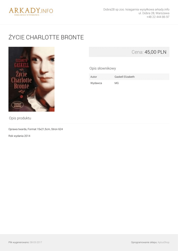 Dobra28 sp zoo. księgarnia wysyłkowa arkady.info ul. Dobra 28, Warszawa +48 22 444 86 97 ŻYCIE CHARLOTTE BRONTE Cena: 45,00 PLN Opis słownikowy Autor Gaskell Elizabeth Wydawca MG Opis produktu Oprawa twarda, Format 15x21,5cm, Stron 624 Rok wydania 2014 Plik wygenerowano: 08-03-2017 Powered by TCPDF (www.tcpdf.org) Oprogramowanie sklepu: AptusShop