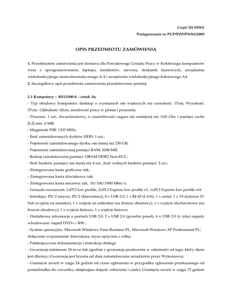 Część III SIWZ Postępowanie nr PUP/PZP/PN/01/2009 OPIS PRZEDMIOTU ZAMÓWIENIA 1. Przedmiotem zamówienia jest dostawa dla Powiatowego Urzędu Pracy w Kołobrzegu komputerów wraz z oprogramowaniem, laptopa, monitorów, serwera, drukarek laserowych, urządzenia wielofunkcyjnego monochromatycznego A-4 i urządzenia wielofunkcyjnego kolorowego A4. 2. Szczegółowy opis przedmiotu zamówienia przedstawiono poniżej: 2.1 Komputery – 30213300-8 – sztuk 16; - Typ obudowy komputera: desktop o wymiarach nie większych niż szerokość: 17cm; Wysokość: 37cm; Głębokość: 42cm, możliwość pracy w pionie i poziomie; - Procesor: 1 szt., dwurdzeniowy, o częstotliwości zegara nie mniejszej niż 3,00 Ghz i pamięci cache [L2] min. 6 MB; - Magistrala FSB: 1333 MHz; - Ilość zainstalowanych dysków HDD: 1 szt.; - Pojemność zainstalowanego dysku: nie mniej niż 250 GB; - Pojemność zainstalowanej pamięci RAM: 2048 MB; - Rodzaj zainstalowanej pamięci: DRAM DDR2 Non-ECC; - Ilość banków pamięci: nie mniej niż 4 szt., ilość wolnych banków pamięci: 2 szt.; - Zintegrowana karta graficzna: tak; - Zintegrowana karta dźwiękowa: tak; - Zintegrowana karta sieciowa: tak, 10/100/1000 Mbit/s; - Gniazda rozszerzeń: 1xPCI low profile, 2xPCI Express low profile x1, 1xPCI Express low profile x16 - Interfejsy: PS/2 (mysz), PS/2 (klawiatura), 8 x USB 2.0, 1 x RJ-45 (LAN), 1 x serial, 1 x 15-stykowe DSub (wyjście na monitor), 1 x wejście na mikrofon (na froncie obudowy), 1 x wyjście słuchawkowe (na froncie obudowy), 1 x wyjście liniowe, 1 x wejście liniowe; - Dodatkowe informacje o portach USB 2.0: 2 x USB 2.0 (przedni panel), 6 x USB 2.0 (z tyłu) napędy wbudowane: napęd DVD+/-RW ; - System operacyjny: Microsoft Windows Vista Business PL, Microsoft Windows XP Professional PL; dołączone wyposażenie: klawiatura, mysz optyczna z rolką; - Polskojęzyczna dokumentacja i instrukcja obsługi; - Gwarancja minimum 24 m-ce lub zgodnie z gwarancją producenta w zależności od tego, który okres jest dłuższy; Gwarancja jest liczona od dnia zainstalowania urządzenia przez Wykonawcę; - Usunięcie awarii w ciągu 24 godzin od czasu zgłoszenia w przypadku zgłoszenia przekazanego od poniedziałku do czwartku, obejmujące dojazd, robociznę i części; Usunięcie awarii w ciągu 72 godzin od czasu zgłoszenia w przypadku zgłoszenia przekazanego w piątek, obejmujące dojazd, robociznę i części; - W przypadku niemożności w ww. terminie usunięcia usterki dostarczenie maksymalnie na 5 dzień od pierwszego zgłoszenia zastępczego urządzenia o porównywalnych lub wyższych parametrach; W przypadku niewykonania naprawy w ciągu maksymalnie 30 dni od dnia od dnia pierwszego zgłoszenia – dostarczenie Zamawiającemu sprzętu fabrycznie nowego o tych samych lub wyższych parametrach technicznych; - Zgodnie z ustawą o ochronie danych osobowych dyski twarde podlegają gwarancji bezzwrotnej. 2.2 Oprogramowanie – 48000000-8 - szt. 40. MS OFFICE SBE 2007 BOX: Składowe :Excel, Outlook, Power Point, Publisher, Word, Wersja językowa: polska, Wersja produktu: pełna wersja; - Gwarancja minimum 24 m-ce lub zgodnie z gwarancją producenta w zależności od tego, który okres jest dłuższy; Gwarancja jest liczona od dnia zainstalowania oprogramowania przez Wykonawcę; - Usunięcie awarii oprogramowania w ciągu 24 godzin od czasu zgłoszenia w przypadku zgłoszenia przekazanego od poniedziałku do czwartku, obejmujące dojazd, robociznę i części; Usunięcie awarii w ciągu 72 godzin od czasu zgłoszenia w przypadku zgłoszenia przekazanego w piątek, obejmujące dojazd, robociznę i części; - W przypadku niemożności w ww. terminie usunięcia usterki dostarczenie maksymalnie na 5 dzień od pierwszego zgłoszenia zastępczego nośnika o porównywalnych lub wyższych parametrach; W przypadku niewykonania naprawy w ciągu maksymalnie 30 dni od dnia od dnia pierwszego zgłoszenia – dostarczenie Zamawiającemu nośnika fabrycznie nowego o tych samych lub wyższych parametrach technicznych; 2.3 Laptop – 30213100-6 – szt. 1; - Ekran: 15,4": WXGA 1280X800 ; - Chipset: Dostosowany do zaoferowanego procesora; - Procesor: procesor klasy x86 dedykowany do pracy w komputerach przenośnych zaprojektowany do pracy w układach jednoprocesorowych, taktowany zegarem co najmniej 2.0 GHz, częstotliwość szyny systemowej 800MHz, pamięć L2 2MB lub procesor równoważny wydajnościowo według wyniku testów przeprowadzonych przez Oferenta. W przypadku użycia przez oferenta testów wydajności Zamawiający zastrzega sobie, iż w celu sprawdzenia poprawności przeprowadzenia testów oferent musi dostarczyć Zamawiającemu oprogramowanie testujące, oba równoważne porównywalne zestawy oraz dokładny opis użytych testów wraz z wynikami w celu ich sprawdzenia w terminie nie dłuższym niż 3 dni od otrzymania zawiadomienia od Zamawiającego. - Pamięć RAM: 2GB DDR2 800MHz (2x1024MB) możliwość rozbudowy do 4GB; - Dysk twardy: Min. 160 GB SATA, 7200 obr./min. Wyposażony w system automatycznego parkowania głowicy podczas nagłego upadku komputera z wysokości już od 50cm. - Karta graficzna: Zintegrowana z możliwością dynamicznego przydzielenia do 128MB, ze sprzętowym wsparciem dla DirectX ; - Karta dźwiękowa zgodna z HD Audio, 24-bitowa konwersja sygnału cyfrowego na analogowy i analogowego na cyfrowy, wbudowane głośniki stereo oraz mikrofon wielokierunkowy.10.0, Shader 4.0 Audio; - Karta sieciowa: Wbudowana: 10/100/1000 – RJ 45; - Porty/złącza: Wbudowane: 1xVGA, 1xS-Video, IEEE1394a, 4 x USB 2.0, RJ-45, RS-232, złącze słuchawkowe, złącze mikrofonowe, 1 złącze PC-Card type I/II, czytnik kart SD, możliwość podłączenia dedykowanego replikatora portów nie zajmującego złącza USB; - Klawiatura: Klawiatura (układ US -QWERTY) Touchpad 240CPI z wydzieloną strefą przewijania w pionie i poziomie, trackpoint; WiFi: Wbudowany Wireless 802.11 a/g/n (dedykowany przełącznik umo
