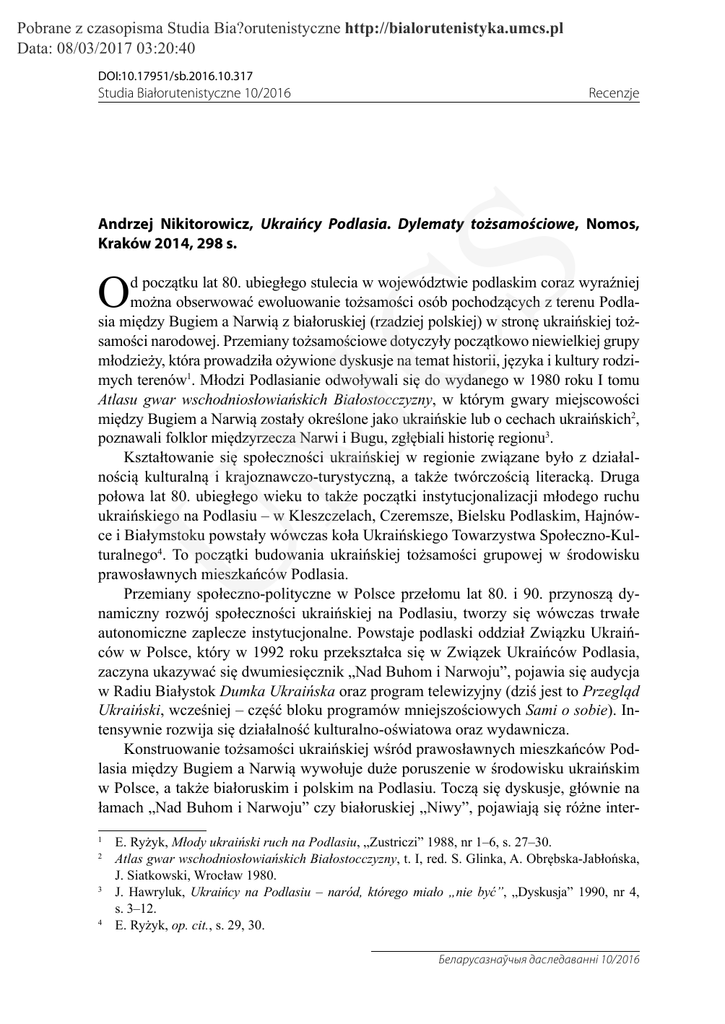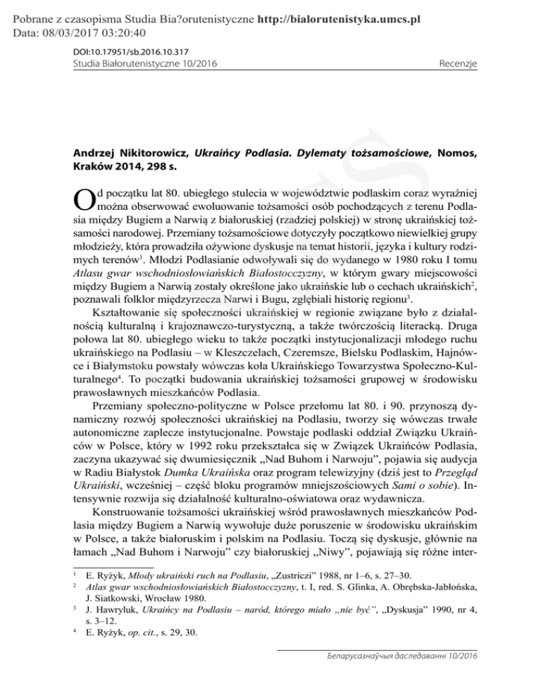 Pobrane z czasopisma Studia Bia?orutenistyczne http://bialorutenistyka.umcs.pl Data: 08/03/2017 03:20:40 DOI:10.17951/sb.2016.10.317 Studia Białorutenistyczne 10/2016 Recenzje CS Andrzej Nikitorowicz, Ukraińcy Podlasia. Dylematy tożsamościowe, Nomos, Kraków 2014, 298 s. O U M d początku lat 80. ubiegłego stulecia w województwie podlaskim coraz wyraźniej można obserwować ewoluowanie tożsamości osób pochodzących z terenu Podlasia między Bugiem a Narwią z białoruskiej (rzadziej polskiej) w stronę ukraińskiej tożsamości narodowej. Przemiany tożsamościowe dotyczyły początkowo niewielkiej grupy młodzieży, która prowadziła ożywione dyskusje na temat historii, języka i kultury rodzimych terenów1. Młodzi Podlasianie odwoływali się do wydanego w 1980 roku I tomu Atlasu gwar wschodniosłowiańskich Białostocczyzny, w którym gwary miejscowości między Bugiem a Narwią zostały określone jako ukraińskie lub o cechach ukraińskich2, poznawali folklor międzyrzecza Narwi i Bugu, zgłębiali historię regionu3. Kształtowanie się społeczności ukraińskiej w regionie związane było z działalnością kulturalną i krajoznawczo-turystyczną, a także twórczością literacką. Druga połowa lat 80. ubiegłego wieku to także początki instytucjonalizacji młodego ruchu ukraińskiego na Podlasiu – w Kleszczelach, Czeremsze, Bielsku Podlaskim, Hajnówce i Białymstoku powstały wówczas koła Ukraińskiego Towarzystwa Społeczno-Kulturalnego4. To początki budowania ukraińskiej tożsamości grupowej w środowisku prawosławnych mieszkańców Podlasia. Przemiany społeczno-polityczne w Polsce przełomu lat 80. i 90. przynoszą dynamiczny rozwój społeczności ukraińskiej na Podlasiu, tworzy się wówczas trwałe autonomiczne zaplecze instytucjonalne. Powstaje podlaski oddział Związku Ukraińców w Polsce, który w 1992 roku przekształca się w Związek Ukraińców Podlasia, zaczyna ukazywać się dwumiesięcznik „Nad Buhom i Narwoju”, pojawia się audycja w Radiu Białystok Dumka Ukraińska oraz program telewizyjny (dziś jest to Przegląd Ukraiński, wcześniej – część bloku programów mniejszościowych Sami o sobie). Intensywnie rozwija się działalność kulturalno-oświatowa oraz wydawnicza. Konstruowanie tożsamości ukraińskiej wśród prawosławnych mieszkańców Podlasia między Bugiem a Narwią wywołuje duże poruszenie w środowisku ukraińskim w Polsce, a także białoruskim i polskim na Podlasiu. Toczą się dyskusje, głównie na łamach „Nad Buhom i Narwoju” czy białoruskiej „Niwy”, pojawiają się różne inter1 2 3 4 E. Ryżyk, Młody ukraiński ruch na Podlasiu, „Zustriczi” 1988, nr 1–6, s. 27–30. Atlas gwar wschodniosłowiańskich Białostocczyzny, t. I, red. S. Glinka, A. Obrębska-Jabłońska, J. Siatkowski, Wrocław 1980. J. Hawryluk, Ukraińcy na Podlasiu – naród, którego miało „nie być”, „Dyskusja” 1990, nr 4, s. 3–12. E. Ryżyk, op. cit., s. 29, 30. Беларусазнаўчыя даследаванні 10/2016 Pobrane z czasopisma Studia Bia?orutenistyczne http://bialorutenistyka.umcs.pl Data: 08/03/2017 03:20:40 318 Recenzje U M CS pretacje tego zjawiska5. Z czasem procesem formowania tożsamości ukraińskiej w regionie zaczynają interesować się naukowcy6. Andrzej Sadowski pisze o „fenomenie powstania mniejszości ukraińskiej w południowo-wschodniej części obecnego województwa podlaskiego”7. Pomimo ponad 30–letniej obecności Ukraińców Podlasia w strukturze narodowościowej regionu przez wiele lat zjawisko kształtowania się tożsamości ukraińskiej nie zostało dokładniej zbadane i opisane. Gruntownie tematem tym postanowił zająć się białostocki socjolog Andrzej Nikitorowicz. W 2013 roku pod kierunkiem naukowym profesora Sadowskiego obronił pracę doktorską Procesy tworzenia się (konstruowania) małego narodu (kulturowego) na przykładzie mniejszości ukraińskiej w województwie podlaskim. Pod koniec 2014 roku ukazała się napisana na podstawie tej pracy książka Ukraińcy Podlasia. Dylematy tożsamościowe. W publikacji przedstawiono rezultaty badań autora, przeprowadzonych w zdecydowanej większości na grupie osób pochodzących z Podlasia między Bugiem a Narwią, identyfikujących się ze społecznością ukraińską. Socjolog pokazuje, jakim przemianom i procesom o charakterze narodotwórczym w ciągu ostatnich 25 lat, czyli w warunkach demokratycznej Polski, podlegała ta społeczność. Książka składa się z następujących części: Wstęp; Rozdział I: Naród jako wspólnota i kategoria badawcza w socjologii; Rozdział II: Mniejszość ukraińska w województwie podlaskim w świetle danych zastanych; Rozdział III: Struktura narodowościowa mieszkańców województwa podlaskiego ze szczególnym uwzględnieniem mniejszości ukraińskiej w opinii respondentów; Rozdział IV: Tożsamość etniczno-narodowa mniejszości ukraińskiej w województwie podlaskim; Rozdział V: Konstruowanie ukraińskiej mniejszości narodowej w województwie podlaskim jako wspólnoty w działaniu; Zakończenie; Bibliografia; Aneks. Kwestionariusz wywiadu otwartego; 5 6 7 Kwestii ukraińskiej poświęcony był chociażby cały 4. numer pisma „Dyskusja” z 1990 r. M. Barwiński, Struktura narodowościowa i językowa mieszkańców południowo-wschodniej części województwa podlaskiego. Porównanie badań terenowych i narodowego spisu powszechnego, [w:] Pogranicze. Studia Społeczne, t. XII, Białystok 2005; idem, Ukraińcy na Podlasiu, Geneza, kontrowersje, współczesność, „Acta Universitatis Lodziensis” 2011, nr 11; A. Sadowski, Pogranicze polsko-białoruskie. Tożsamość mieszkańców, Białystok 1995; idem, Struktura religijno-etniczna mieszkańców województwa podlaskiego, [w:] Mniejszości narodowe i etniczne a media elektroniczne, Białystok 2001; M. Sajewicz, Zagadnienie przynależności etniczno-językowej prawosławnych mieszkańców powiatu hajn