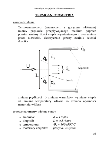Metrologia przepływów - Termoanemometria TERMOANEMOMETRIA zasada działania Termoanemometr (anemometr z gorącym włóknem) mierzy prędkość przepływającego medium poprzez pomiar zmiany ilości ciepła wymienianego z otoczeniem przez niewielki, elektrycznie grzany czujnik (cienki drucik) . qE . q. qr λ . qα U L . . qr qλ wsporniki drucik zmiana prędkości ⇒ zmiana warunków wymiany ciepła ⇒ zmiana temperatury włókna ⇒ zmiana oporności materiału włókna typowe parametry włókna sondy średnica: długość: temperatura: materiały czujnika: d = 1÷5µm L = 0.5÷3mm Θw = 100÷300oC platyna, wolfram 25 Metrologia przepływów - Termoanemometria równanie równowagi energetycznej włókna • dqi • = q E − q ex dt [W / m ] (1) qi - energia cieplna zgromadzona we włóknie • q E - strumień energii cieplnej doprowadzanej do czujnika przez prąd elektryczny • q ex - strumień ciepła oddawanego do otoczenia • q E = I 2 Rw / L gdzie: Rw = R0 [1 + bo ( Θ w − Θ o )] (2) (3) I - natężenie prądu Rw, R0 - oporność czujnika w temperaturach Θw, Θ0 Θ0 - temperatura odniesienia b0 - cieplny współczynnik rezystywności materiału włókna mechanizmy wymiany ciepła między włóknem i otoczeniem: • przewodzenie – małe • q λ = f ( Θ w − Θ s , L ,λ w ) (4) • promieniowanie – pomijalne • q r = f ( Θ 4w − Θ 4f ) (5) • konwekcja • qα = π λ f Nu ( Θ w − Θ f ) (6 ) 26 Metrologia przepływów - Termoanemometria gdzie: Θs - temperatura wsporników λf ,λw - współczynniki przewodnictwa cieplnego płynu oraz materiału włókna Nu - liczba Nusselta Nu = αd λ (7 ) α - współczynnik przejmowania ciepła Θf - temperatura otoczenia (płynu) Nu = f (Re, Pr,ϕ ,Gr , M ,c p / cv , L / d , λ f / λw ,( Θ w − Θ f ) / Θ f ) (8) gdzie: Pr - liczba Prandtla ϕ - kąt pomiędzy kierunkami wektora prędkości średniej i normalnym do włókna Gr - liczba Grashofa M - liczba Macha cp, cv - ciepła właściwe przy stałym ciśnieniu i objętości (Θw-Θf)/Θf - tzw. stopień przegrzewu w warunkach równowagowych ilość ciepła zgromadzona we włóknie jest stała • • dqi = 0 ⇒ q E = q ex dt (9) 27 Metrologia przepływów - Termoanemometria założenia zapewniające słuszność formuły (9): pomijalnie małe promieniowanie pomijalnie małe przewodzenie do wsporników jednorodny rozkład temperatury wzdłuż włókna wektor prędkości średniej normalny do włókna prędkość przepływu znacznie mniejsza od prędkości dźwięku (M << 1) płyn jednorodny pod względem gęstości i temperatury równanie równowagi I 2 Rw = E w2 / Rw = π L λ f Nu ( Θ w − Θ f ) gdzie: ( 10 ) Ew - spadek napięcia na włóknie w zakresie konwekcji wymuszonej (tzn. konwekcja swobodna spowodowana siłami wyporu może być pominięta) Re > Gr 1 / 3 ( dla powietrza Re > 0.02 ) ( 11 ) oraz dla płynów nieściśliwych Re < 140 ( 12 ) liczba Nusselta może być wyrażona w poniższy sposób Nu = A' + B' Re n = A" + B" U n ( 13 ) prowadząc do "prawa Kinga" I 2 Rw2 = E w2 = ( A* + B*U n )( Θ w − Θ f ) ( 14 ) 28 Metrologia przepływów - Termoanemometria gdzie: A *, B * n ≈ 0.5 - stałe (współczynniki równania Kinga) niezależne od prędkości ( E w = f U ,Θ f ) ( 15 ) spadek napięcia na włóknie sondy jest funkcją prędkości oraz temperatury płynu ⇓ termoanemometria może być stosowana do pomiaru prędkości i temperatury płynu 29 Metrologia przepływów - Termoanemometria Rodzaje pracy termoanemometrów anemometr stałoprądowy (constant current anemometer CCA) - pomiar prędkości (historia) - pomiar temperatury anemometr stałotemperaturowy (constant temperature anemometer - CTA) pomiar prędkości anemometr stałonapięciowy (constant voltage anemometer CVA) pomiar prędkości (praktycznie nie używany) zasada działania natęż enie prądu przepływającego przez włókno (CCA) lub spadek napięcia na włóknie (CVA) lub temperatura czujnika (CTA) jest stała proces pomiarowy kontrolowany jest przez układ elektroniczny wykorzystujący mostek Wheatstone'a z pętlą sprzęż enia zwrotnego spadek napięcia na mostku E jest mierzony zamiast spadku napięcia na włóknie Ew 30 Metrologia przepływów - Termoanemometria anemometr stałoprądowy (CCA) I = const oraz I → 0 (1 ÷ 3mA) • ⇒ qE ≈ 0 ⇓ Θw = Θ f brak efektu chłodzącego: ⇓ ( E )CCA ≠ ⇓ ( E )CCA = f (U ) f (Θ f ) charakterystyka układu CCA (napięcie w funkcji temperatury medium) ( E = Eo + st Θ f − Θ fo ) ( 16 ) st – czułość temperaturowa anemometru st = ∂E ∆E = = const ∂Θ f ∆Θ f ( 17 ) 31 Metrologia przepływów - Termoanemometria stosując hipotezę Reynoldsa (podwójną dekompozycję) Θ f = Θ f +ϑ ; E = E + e do równania (21) uzyskuje się zależność E + e = E0 + st ( Θ f + ϑ − Θ f 0 ) ( 18 ) która może być rozdzielona na stałą i fluktuacyjną część E = E0 + st ( Θ f + Θ f 0 ) e = stϑ ( 19 ) anemometr stałotemperaturowy (CTA) Θ w ( Rw ) = const ⇒ E ≠ f (Θ f ) przeplyw izotermiczny : Θ f = const ⇓ ( E )CTA = f (U ) 2 (E )CTA = A + BU n ( 20 ) A, B – stałe n ≅ 0.5 zakres uwidaczniania się konwekcji swobodnej 32 Metrologia przepływów - Termoanemometria stosując podwójną dekompozycję U =U +u ; E = E + e uzyskuje się [ E +e = A+ B U +u ]1 / 2 ( 21 ) rozdzielenie powyższej zależności na część stałą i fluktuacyjną wymaga rozwinięcia jej prawej strony w szereg potęgowy 1/ 2 u E +e = A+ B U + a1 + K ( 22 ) U [ ] gdzie a1 = B U 4 A+ B U ( 23 ) pomijając człony wyższych rzędów uzyskuje się [ E = A+ B U e= B U ]1 / 2 u = su u 4 A+ B U U ⋅ ( 24 ) ( 25 ) gdzie su – czułość prędkościowa termoanemometru su = B U 4U A + B U = ∂E ∆E ≠ ∂U ∆U ( 26 ) 33 Metrologia przepływów - Termoanemometria Nieliniowość charakterystyki anemometru stałotemperaturowego (CTA) nieliniowość ⇒ E ≠ E (U ) ⇒ błędy pomiaru wartości statystycznych możliwe drogi rozwiązania pro