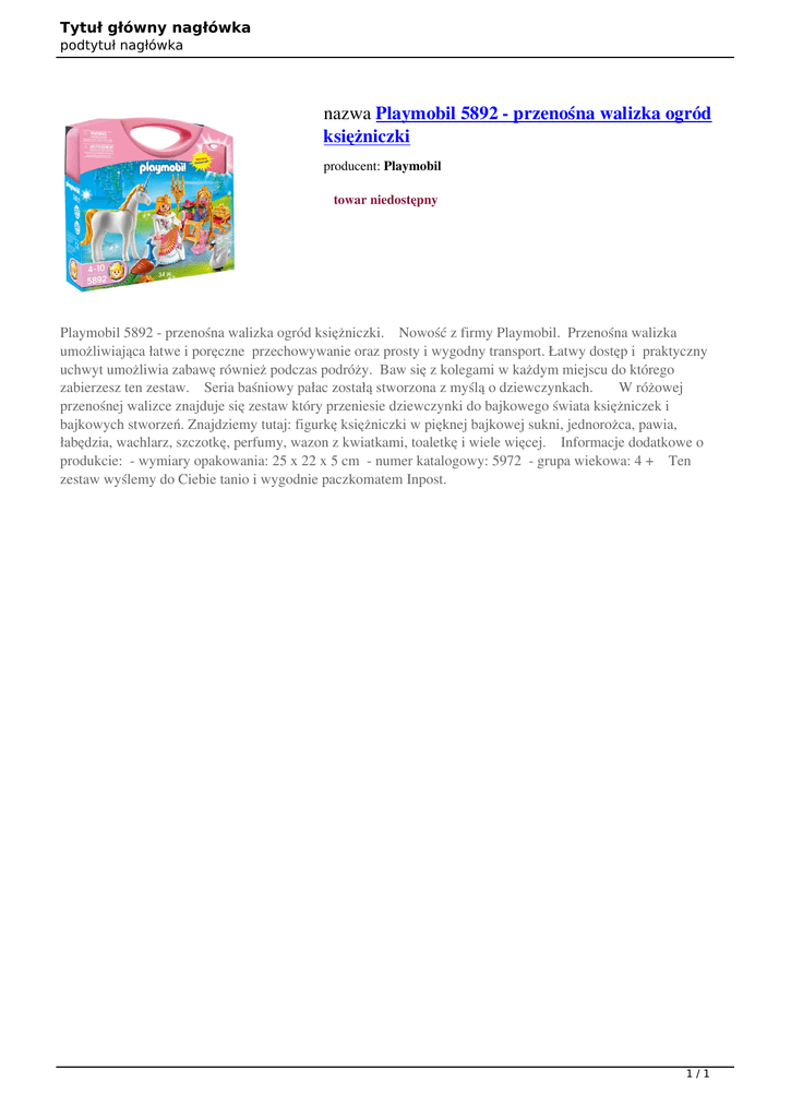 Tytuł główny nagłówka podtytuł nagłówka nazwa Playmobil 5892 - przenośna walizka ogród księżniczki producent: Playmobil towar niedostępny Playmobil 5892 - przenośna walizka ogród księżniczki. Nowość z firmy Playmobil. Przenośna walizka umożliwiająca łatwe i poręczne przechowywanie oraz prosty i wygodny transport. Łatwy dostęp i praktyczny uchwyt umożliwia zabawę również podczas podróży. Baw się z kolegami w każdym miejscu do którego zabierzesz ten zestaw. Seria baśniowy pałac zostałą stworzona z myślą o dziewczynkach. W różowej przenośnej walizce znajduje się zestaw który przeniesie dziewczynki do bajkowego świata księżniczek i bajkowych stworzeń. Znajdziemy tutaj: figurkę księżniczki w pięknej bajkowej sukni, jednorożca, pawia, łabędzia, wachlarz, szczotkę, perfumy, wazon z kwiatkami, toaletkę i wiele więcej. Informacje dodatkowe o produkcie: - wymiary opakowania: 25 x 22 x 5 cm - numer katalogowy: 5972 - grupa wiekowa: 4 + Ten zestaw wyślemy do Ciebie tanio i wygodnie paczkomatem Inpost. 1/1