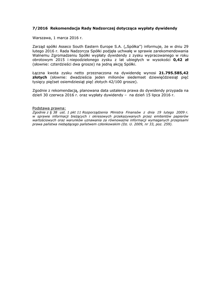7/2016 Rekomendacja Rady Nadzorczej dotycząca wypłaty dywidendy Warszawa, 1 marca 2016 r. Zarząd spółki Asseco South Eastern Europe S.A. („Spółka”) informuje, że w dniu 29 lutego 2016 r. Rada Nadzorcza Spółki podjęła uchwałę w sprawie zarekomendowania Walnemu Zgromadzeniu Spółki wypłaty dywidendy z zysku wypracowanego w roku obrotowym 2015 i niepodzielonego zysku z lat ubiegłych w wysokości 0,42 zł (słownie: czterdzieści dwa grosze) na jedną akcję Spółki. Łączna kwota zysku netto przeznaczona na dywidendę wynosi 21.795.585,42 złotych (słownie: dwadzieścia jeden milionów siedemset dziewięćdziesiąt pięć tysięcy pięćset osiemdziesiąt pięć złotych 42/100 grosze). Zgodnie z rekomendacją, planowana data ustalenia prawa do dywidendy przypada na dzień 30 czerwca 2016 r. oraz wypłaty dywidendy – na dzień 15 lipca 2016 r. Podstawa prawna: Zgodnie z § 38 ust. 1 pkt 11 Rozporządzenia Ministra Finansów z dnia 19 lutego 2009 r. w sprawie informacji bieżących i okresowych przekazywanych przez emitentów papierów wartościowych oraz warunków uznawania za równoważne informacji wymaganych przepisami prawa państwa niebędącego państwem członkowskim (Dz. U. 2009, nr 33, poz. 259).