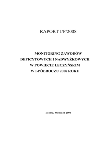 RAPORT I/P/2008 MONITORING ZAWODÓW DEFICYTOWYCH I NADWYŻKOWYCH W POWIECIE ŁĘCZYŃSKIM W I-PÓŁROCZU 2008 ROKU Łęczna, Wrzesień 2008 Powiatowy Urząd Pracy w Łęcznej SPIS TREŚCI WSTĘP........................................................................................................................................................... 2 I) II) ANALIZA BEZROBOCIA WG ZAWODÓW (GRUP ZAWODÓW) ................................................ 3 1) STAN I DYNAMIKA BEZROBOCIA W POWIECIE ŁĘCZYŃSKIM ................................................................ 3 2) STRUKTURA BEZROBOTNYCH ZAREJESTROWANYCH W POWIATOWYM URZĘDZIE PRACY W DNIU 30 CZERWCA 2008 R. WEDŁUG WIELKICH GRUP ZAWODOWYCH .................................................................... 4 III) 1) 2) IV) ANALIZA OFERT PRACY WG ZAWODÓW (GRUP ZAWODÓW) ............................................... 8 ANALIZA ZAWODÓW WEDŁUG WIELKICH GRUP.................................................................................... 8 ANALIZA OFERT PRACY WEDŁUG GRUP ELEMENTARNYCH .................................................................. 9 ANALIZA ZAWODÓW DEFICYTOWYCH I NADWYŻKOWYCH ............................................. 11 1) 2) 3) UWAGI METODYCZNE........................................................................................................................... 11 ZAWODY DEFICYTOWE I NADWYŻKOWE W UJĘCIU WIELKICH GRUP................................................. 11 ZAWODY DEFICYTOWE I NADWYŻKOWE W POWIECIE ŁĘCZYŃSKIM W UJĘCIU ZAWODÓW I SPECJALNOŚCI ................................................................................................................................................ 12 V) PODSUMOWANIE ................................................................................................................................ 20 1 Powiatowy Urząd Pracy w Łęcznej I) Wstęp Opracowywanie analiz rynku pracy, w szczególności prowadzenie monitoringu zawodów deficytowych i nadwyżkowych jest jednym z zadań samorządu powiatu w zakresie polityki rynku pracy zgodnie z zapisami Ustawy z dn. 20 kwietnia 2004r. o promocji zatrudnienia i instytucjach rynku pracy. Termin monitoring zawodów deficytowych i nadwyżkowych oznacza proces systematycznego obserwowania zjawisk zachodzących na rynku pracy dotyczących kształtowania popytu na pracę i podaży zasobów pracy w przekroju terytorialno- zawodowym oraz formułowania na tej podstawie wniosków i krótkotrwałych prognoz niezbędnych dla prawidłowego funkcjonowania systemów: szkolenia bezrobotnych oraz kształcenia zawodowego. Termin zawód deficytowy określa zawód, na który na rynku pracy panuje większe zapotrzebowanie niż liczba osób poszukujących pracy w tym zawodzie. Termin zawód nadwyżkowy określa zawód, na który panuje na rynku mniejsze zapotrzebowanie niż liczba osób poszukujących pracy w tym zawodzie. Źródłem informacji do sporządzenia niniejszego opracowania były: aplikacja informatyczna opracowana przez firmę Computerland według zaleceń metodycznych do prowadzenia monitoringu zawodów deficytowych i nadwyżkowych Departamentu Rynku Pracy w Ministerstwie Pracy i Polityki Społecznej, sprawozdania MPiPS-01 („Sprawozdanie o rynku pracy”) z lat 2005-2008, załącznik nr 2 do sprawozdania MPiPS-01 („Bezrobotni wg rodzaju działalności ostatniego miejsca pracy oraz oferty pracy”) i załącznik nr 3 do sprawozdania MPiPS-01 („Bezrobotni oraz oferty pracy wg zawodów i specjalności”) za I-półrocze 2008r. 2 Powiatowy Urząd Pracy w Łęcznej Analiza bezrobocia wg zawodów (grup zawodów) II) 1) Stan i dynamika bezrobocia w powiecie łęczyńskim W Powiatowym Urzędzie Pracy w Łęcznej w ostatnim dniu czerwca 2008 r. były zarejestrowane 2302 osoby bezrobotne, co oznacza że w porównaniu z końcem czerwca ubiegłego roku liczba ta spadła o 23,6 %. Kobiety stanowiły 64 % ogółu zarejestrowanych, przy czym o tej samej porze roku poprzedniego – 60 % zarejestrowanych bezrobotnych. Stan bezrobocia w powiecie łęczyńskim 5000 4500 4000 3500 3000 2500 2000 1500 1000 500 0 1832 1568 1219 827 2505 czerwiec 2005 liczba mężczyzn liczba kobiet 2314 czerwiec 2006 1795 1475 czerwiec 2007 czerwiec 2008 W ciągu I-półrocza 2008 r. w Powiatowym Urzędzie Pracy w Łęcznej zarejestrowano 1731 osób (w tym 879 kobiet). Wyrejestrowano w tym samym czasie 2236 osób (w tym 1 132 kobiety). W tym samym okresie roku poprzedniego zarejestrowano 1665 osób bezrobotnych (w tym 763 kobiety), a wyrejestrowanych zostało 2437 (w tym 1269 kobiet). Napływ bezrobotnych do PUP Łęczna 2000 1500 918 948 852 902 liczba mężczyzn 1000 liczba kobiet 500 793 777 763 879 I-półrocze 2005 I-półrocze 2006 I-półrocze 2007 I-półrocze 2008 0 Porównując I półrocze 2008 roku z tym samym okresem lat poprzednich, zauważyć należy, że pomimo znacznego spadku poziomu bezrobocia utrzymuje się wysoki „napływ” bezrobotnych najwyższy w latach 2005-2008. Liczba osób wyłączonych z ewidencji 3 Powiatowy Urząd Pracy w Łęcznej bezrobotnych w rozważanym okresie jest niższa niż w poprzednich latach, co wraz z faktem spadku bezrobocia, wskazuje na fakt, że znaczna część bezrobotnych została wyłączona z ewidencji PUP Łęczna w drugiej połowie roku poprzedniego. Bezrobotni wyrejestrowani z PUP Łęczna 3000 2500 2000 1500 1000 500 0 1243 1053 1168 1104 liczba mężczyzn liczba kobiet 914 1064 1269 1132 I-półrocze 2005 I-półrocze 2006 I-półrocze 2007 I-półrocze 2008 Najczęstszą przyczyną utraty statusu osoby bezrobotnej jest podjęcie pracy. Ciągle jednak na bardzo wysokim poziomie pozostaje niepotwierdzeni gotowości do podjęcia pracy. Przyczyny odpływu z bezrobocia 1000 800 I-półrocze 2005 600 I-półrocze2006 I-półrocze 2007 400 I-półrocze 2008 200 0 podjęcia pracy rozpoczęcie szkolenia rozpoczęcie stażu niepotw ierdzenie gotow osci do podjęcia pracy 2) Struktura bezr