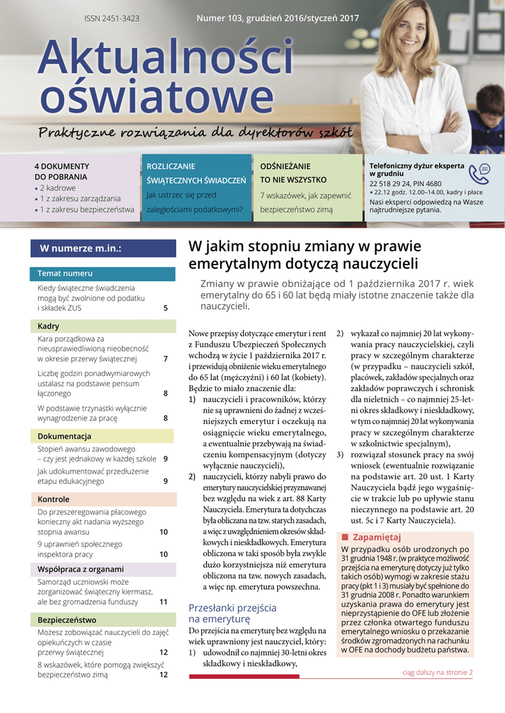 Numer 103, grudzień 2016/styczeń 2017 ISSN 2451-3423 Aktualności oświatowe Praktyczne rozwiązania dla dyrektorów szkół 4 DOKUMENTY DO POBRANIA • 2 kadrowe • 1 z zakresu zarządzania • 1 z zakresu bezpieczeństwa ROZLICZANIE ODŚNIEŻANIE ŚWIĄTECZNYCH ŚWIADCZEŃ TO NIE WSZYSTKO Jak ustrzec się przed 7 wskazówek, jak zapewnić zaległościami podatkowymi? bezpieczeństwo zimą Temat numeru 5 Kadry Kara porządkowa za nieusprawiedliwioną nieobecność w okresie przerwy świątecznej 7 Liczbę godzin ponadwymiarowych ustalasz na podstawie pensum łączonego 8 W podstawie trzynastki wyłącznie wynagrodzenie za pracę 8 Dokumentacja Stopień awansu zawodowego – czy jest jednakowy w każdej szkole 9 Jak udokumentować przedłużenie etapu edukacyjnego 9 Kontrole Do przeszeregowania płacowego konieczny akt nadania wyższego stopnia awansu 9 uprawnień społecznego inspektora pracy •22.12 godz. 12.00–14.00, kadry i płace Nasi eksperci odpowiedzą na Wasze najtrudniejsze pytania. W jakim stopniu zmiany w prawie emerytalnym dotyczą nauczycieli W numerze m.in.: Kiedy świąteczne świadczenia mogą być zwolnione od podatku i składek ZUS Telefoniczny dyżur eksperta w grudniu 22 518 29 24, PIN 4680 10 10 Współpraca z organami Samorząd uczniowski może zorganizować świąteczny kiermasz, ale bez gromadzenia funduszy 11 Bezpieczeństwo Możesz zobowiązać nauczycieli do zajęć opiekuńczych w czasie przerwy świątecznej 12 8 wskazówek, które pomogą zwiększyć bezpieczeństwo zimą 12 Zmiany w prawie obniżające od 1 października 2017 r. wiek emerytalny do 65 i 60 lat będą miały istotne znaczenie także dla nauczycieli. Nowe przepisy dotyczące emerytur i rent z Funduszu Ubezpieczeń Społecznych wchodzą w życie 1 października 2017 r. i przewidują obniżenie wieku emerytalnego do 65 lat (mężczyźni) i 60 lat (kobiety). Będzie to miało znaczenie dla: 1) nauczycieli i pracowników, którzy nie są uprawnieni do żadnej z wcześniejszych emerytur i oczekują na osiągnięcie wieku emerytalnego, a ewentualnie przebywają na świadczeniu kompensacyjnym (dotyczy wyłącznie nauczycieli), 2) nauczycieli, którzy nabyli prawo do emerytury nauczycielskiej przyznawanej bez względu na wiek z art. 88 Karty Nauczyciela. Emerytura ta dotychczas była obliczana na tzw. starych zasadach, a więc z uwzględnieniem okresów składkowych i nieskładkowych. Emerytura obliczona w taki sposób była zwykle dużo korzystniejsza niż emerytura obliczona na tzw. nowych zasadach, a więc np. emerytura powszechna. Przesłanki przejścia na emeryturę Do przejścia na emeryturę bez względu na wiek uprawniony jest nauczyciel, który: 1) udowodnił co najmniej 30-letni okres składkowy i nieskładkowy, 2) wykazał co najmniej 20 lat wykonywania pracy nauczycielskiej, czyli pracy w szczególnym charakterze (w przypadku – nauczycieli szkół, placówek, zakładów specjalnych oraz zakładów poprawczych i schronisk dla nieletnich – co najmniej 25-letni okres składkowy i nieskładkowy, w tym co najmniej 20 lat wykonywania pracy w szczególnym charakterze w szkolnictwie specjalnym), 3) rozwiązał stosunek pracy na swój wniosek (ewentualnie rozwiązanie na podstawie art. 20 ust. 1 Karty Nauczyciela bądź jego wygaśnięcie w trakcie lub po upływie stanu nieczynnego na podstawie art. 20 ust. 5c i 7 Karty Nauczyciela). Zapamiętaj W przypadku osób urodzonych po 31 grudnia 1948 r. (w praktyce możliwość przejścia na emeryturę dotyczy już tylko takich osób) wymogi w zakresie stażu pracy (pkt 1 i 3) musiały być spełnione do 31 grudnia 2008 r. Ponadto warunkiem uzyskania prawa do emerytury jest nieprzystąpienie do OFE lub złożenie przez członka otwartego funduszu emerytalnego wniosku o przekazanie środków zgromadzonych na rachunku w OFE na dochody budżetu państwa. ciąg dalszy na stronie 2 Aktualności oświatowe Jak utrzymać korzystniejszą wysokość emerytury Od redakcji Szanowni Czytelnicy, do zaległości szkoły w zakresie podatku dochodowego dojdzie, gdy osoby uprawnione dostaną świadczenia, np. paczki świąteczne, karty prepaid o jednakowej wartości, a szkoła nie odprowadzi zaliczek na podatek, stosując zwolnienie do wartości 380 zł na rok (u tych pracowników, którzy jeszcze nie wykorzystali limitu). W takim przypadku w rachunku podatkowym nie należało uwzględniać zwolnienia. W dzisiejszym numerze sprawdzisz, jak uniknąć zaległości podatkowe oraz jak je skorygować, gdy do nich dojdzie. Katarzyna Giruć PS. Prosimy o Państwa opinie na temat naszej publikacji. Każdą nagrodzimy praktycznym raportem „Nadzór pedagogiczny w przedszkolu i szkole – praktyczne zastosowanie nowych przepisów” Redaktor prowadzący: Katarzyna Giruć Menedżer produktu: Paulina Krzyżanowska Kierownik marketingu i sprzedaży: Julita Lewandowska-Tomasiuk Druk: Mdruk sp. z.o.o Skład: Raster studio, Norbert Bogajczyk Nakład: 1500 egz. Wydawnictwo Wiedza i Praktyka sp. z o.o. 03-918 Warszawa, ul. Łotewska 9a tel. 22 518 29 29, faks 22 617 60 10 e-mail: [email protected] NIP: 526-19-92-256 Numer KRS: 0000098264 – Sąd Rejonowy dla m.st. Warszawy, Sąd Gospodarczy XIII Wydział Gospodarczy Rejestrowy Wysokość kapitału zakładowego: 200.000 zł Materiały drukowane w „Aktualnościach oświatowych” wraz z innymi elementami subskrypcji chronione są prawem autorskim. Wykorzystanie tych materiałów wymaga zgody wydawcy. Zakaz ten nie dotyczy cytowania ze wskazaniem autora oraz źródła. Redakcja nie ponosi odpowiedzialności prawnej za zastosowanie zawartych w „Aktualnościach oświatowych” lub w innych elementach subskrypcji informacji, wskazówek, przykładów itp. do konkretnych przypadków. INFORMACJE O PRENUMERACIE Masz pytanie? Skontaktuj się z nami Centrum Obsługi Klienta: tel.: 22 518 29 29, e-mail: [email protected] 2| Warunkiem przejścia na emeryturę z art. 88 Karty Nauczyciela obliczoną na tzw. starych zasadach było przejści