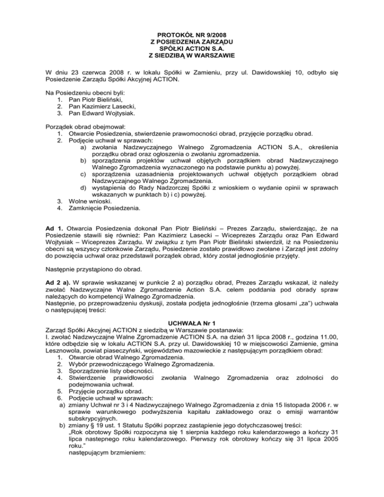 PROTOKÓŁ NR 9/2008 Z POSIEDZENIA ZARZĄDU SPÓŁKI ACTION S.A. Z SIEDZIBĄ W WARSZAWIE W dniu 23 czerwca 2008 r. w lokalu Spółki w Zamieniu, przy ul. Dawidowskiej 10, odbyło się Posiedzenie Zarządu Spółki Akcyjnej ACTION. Na Posiedzeniu obecni byli: 1. Pan Piotr Bieliński, 2. Pan Kazimierz Lasecki, 3. Pan Edward Wojtysiak. Porządek obrad obejmował: 1. Otwarcie Posiedzenia, stwierdzenie prawomocności obrad, przyjęcie porządku obrad. 2. Podjęcie uchwał w sprawach: a) zwołania Nadzwyczajnego Walnego Zgromadzenia ACTION S.A., określenia porządku obrad oraz ogłoszenia o zwołaniu zgromadzenia. b) sporządzenia projektów uchwał objętych porządkiem obrad Nadzwyczajnego Walnego Zgromadzenia wyznaczonego na podstawie punktu a) powyŜej. c) sporządzenia uzasadnienia projektowanych uchwał objętych porządkiem obrad Nadzwyczajnego Walnego Zgromadzenia. d) wystąpienia do Rady Nadzorczej Spółki z wnioskiem o wydanie opinii w sprawach wskazanych w punktach b) i c) powyŜej. 3. Wolne wnioski. 4. Zamknięcie Posiedzenia. Ad 1. Otwarcia Posiedzenia dokonał Pan Piotr Bieliński – Prezes Zarządu, stwierdzając, Ŝe na Posiedzenie stawili się równieŜ: Pan Kazimierz Lasecki – Wiceprezes Zarządu oraz Pan Edward Wojtysiak – Wiceprezes Zarządu. W związku z tym Pan Piotr Bieliński stwierdził, iŜ na Posiedzeniu obecni są wszyscy członkowie Zarządu, Posiedzenie zostało prawidłowo zwołane i Zarząd jest zdolny do powzięcia uchwał oraz przedstawił porządek obrad, który został jednogłośnie przyjęty. Następnie przystąpiono do obrad. Ad 2 a). W sprawie wskazanej w punkcie 2 a) porządku obrad, Prezes Zarządu wskazał, iŜ naleŜy zwołać Nadzwyczajne Walne Zgromadzenie Action S.A. celem poddania pod obrady spraw naleŜących do kompetencji Walnego Zgromadzenia. Następnie, po przeprowadzeniu dyskusji, została podjęta jednogłośnie (trzema głosami „za”) uchwała o następującej treści: UCHWAŁA Nr 1 Zarząd Spółki Akcyjnej ACTION z siedzibą w Warszawie postanawia: I. zwołać Nadzwyczajne Walne Zgromadzenie ACTION S.A. na dzień 31 lipca 2008 r., godzina 11.00, które odbędzie się w lokalu ACTION S.A. przy ul. Dawidowskiej 10 w miejscowości Zamienie, gmina Lesznowola, powiat piaseczyński, województwo mazowieckie z następującym porządkiem obrad: 1. Otwarcie obrad Walnego Zgromadzenia. 2. Wybór przewodniczącego Walnego Zgromadzenia. 3. Sporządzenie listy obecności. 4. Stwierdzenie prawidłowości zwołania Walnego Zgromadzenia oraz zdolności do podejmowania uchwał. 5. Przyjęcie porządku obrad. 6. Podjęcie uchwał w sprawach: a) zmiany Uchwał nr 3 i 4 Nadzwyczajnego Walnego Zgromadzenia z dnia 15 listopada 2006 r. w sprawie warunkowego podwyŜszenia kapitału zakładowego oraz o emisji warrantów subskrypcyjnych. b) zmiany § 19 ust. 1 Statutu Spółki poprzez zastąpienie jego dotychczasowej treści: „Rok obrotowy Spółki rozpoczyna się 1 sierpnia kaŜdego roku kalendarzowego a kończy 31 lipca nastepnego roku kalendarzowego. Pierwszy rok obrotowy kończy się 31 lipca 2005 roku.” następującym brzmieniem: „Rokiem obrotowym Spółki jest rok kalendarzowy. Pierwszy po zmianie rok obrotowy 2008/2009 trwa siedemnaście kolejnych miesięcy kalendarzowych, rozpoczyna się 1 sierpnia 2008 roku i kończy się 31 grudnia 2009 roku.” II. zawiadomić o zwołaniu Nadzwyczajnego Walnego Zgromadzenia ACTION S.A. przez ogłoszenie w Monitorze Sądowym i Gospodarczym. Ad 2 b). W sprawie wskazanej w punkcie 2 b) porządku obrad, po przeprowadzeniu dyskusji, została podjęta jednogłośnie (trzema głosami „za”) uchwała o następującej treści: UCHWAŁA Nr 2 Zarząd Spółki Akcyjnej ACTION z siedzibą w Warszawie postanawia: sporządzić projekty uchwał objętych porządkiem obrad Nadzwyczajnego Walnego Zgromadzenia wyznaczonego na dzień 31.07.2008 r. o treści wskazanej w załączniku nr 1 do niniejszego protokołu. Ad 2 c). W sprawie wskazanej w punkcie 2 c) porządku obrad, po przeprowadzeniu dyskusji, została podjęta jednogłośnie (trzema głosami „za”) uchwała o następującej treści: UCHWAŁA Nr 3 Zarząd Spółki Akcyjnej ACTION z siedzibą w Warszawie postanawia: sporządzić uzasadnienie projektowanych uchwał objętych porządkiem obrad Nadzwyczajnego Walnego Zgromadzenia wyznaczonego na dzień 31.07.2008 r. o treści wskazanej w załączniku nr 2 do niniejszego protokołu. Ad 2 d). W sprawie wskazanej w punkcie 2 d) porządku obrad, po przeprowadzeniu dyskusji, została podjęta jednogłośnie (trzema głosami „za”) uchwała o następującej treści: UCHWAŁA Nr 4 Zarząd Spółki Akcyjnej ACTION z siedzibą w Warszawie postanawia: wystąpić do Rady Nadzorczej Spółki z wnioskiem o wydanie opinii w sprawach wskazanych w Uchwałach Nr 2 i 3. Ad 3. Wniosków nie zgłaszano. Ad 4. Wobec wyczerpania porządku obrad Pan Piotr Bieliński zamknął Posiedzenie Zarządu. Piotr Bieliński ......................................... Kazimierz Lasecki .......................................... Edward Wojtysiak ......................................... 2