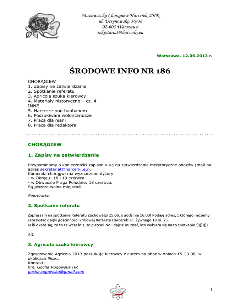 Mazowiecka Chorągiew Harcerek ZHR ul. Ursynowska 36/38 02-605 Warszawa [email protected] Warszawa, 12.06.2013 r. ŚRODOWE INFO NR 186 CHORĄGIEW 1. Zapisy na zatwierdzanie 2. Spotkanie referatu 3. Agricola szuka kierowcy 4. Materiały historyczne – cz. 4 INNE 5. Harcerze pod baobabem 6. Poszukiwani wolontariusze 7. Praca dla niani 8. Praca dla redaktora CHORĄGIEW 1. Zapisy na zatwierdzanie Przypominamy o konieczności zapisania się na zatwierdzanie merytoryczne obozów (mail na adres [email protected]). Komenda chorągwi ma wyznaczone dyżury - w Okręgu: 18 i 19 czerwca - w Obwodzie Praga Południe: 18 czerwca. Są jeszcze wolne miejsca Sekretariat 2. Spotkanie referatu Zapraszam na spotkanie Referatu Zuchowego 15.06. o godzinie 16.00! Podaję adres, z którego możemy skorzystać dzięki gościnności królowej Referatu Harcerek: ul. Żywnego 18 m. 75. Jeśli okaże się, że to za wcześnie, to piszcie! No i dajcie mi znać, kto wybiera się na to spotkanie :)))))))) AG. 3. Agricola szuka kierowcy Zgrupowanie Agricola 2013 poszukuje kierowcy z autem na obóz w dniach 15-29.08. w okolicach Piszu. Kontakt: hm. Gocha Rogowska HR [email protected] 1 Mazowiecka Chorągiew Harcerek ZHR ul. Ursynowska 36/38 02-605 Warszawa [email protected] 4. Materiały historyczne – cz. 4 W załącznikach czwarta część materiałów opracowanych przez kursantki Kursu Podharcmistrzyń "HERBACIARNIA". INNE 5. Harcerze pod baobabem 14 czerwca o 18 w Domu Spotkań z Historią przy ul. Karowej 20 odbędzie się spotkanie pn. „Harcerze pod baobabem. Harcerstwo w polskich skupiskach w Afryce w latach 1941–1948” Spotkanie poświęcone działalności środowisk harcerskich w skupiskach wychodźców polskich w Afryce w latach II wojny światowej i po jej zakończeniu: w Ugandzie, Tanzanii, Rodezji i Kenii. Odtworzymy fragmenty wspomnień komendantki Chorągwi Afrykańskiej ZHP na Wschodzie hm Zdzisławy Wójcik zarejestrowane przez Archiwum Historii Mówionej, zaprezentujemy oryginalną ikonografię i dokumenty z epoki. O Chorągwi Afrykańskiej ZHP na Wschodzie mówić będą Bożenna Wójcik, prof. Andrzej Szujecki, autor wspomnień Do rozstajnych dróg czyli rozliczenia z dzieciństwem oraz inni, którzy w czasie II wojny światowej znaleźli się w obozach dla polskich wychodźców w Afryce. Organizatorzy: Fundacja Harcerstwa Drugiego Stulecia, Archiwum Historii Mówionej DSH i Ośrodka KARTA, DSH. 6. Poszukiwani wolontariusze Drogie Druhny, drodzy Druhowie! Poszukiwani są pilnie wolontariusze do liczenia podpisów spływających do Fundacji PRO Prawo do Życia, w akcji obywatelskiego projektu zniesienia eugenicznej przesłanki dopuszczającej aborcję poczętego dziecka, które jest podejrzane o chorobę lub wadę genetyczną. Siedziba Fundacji mieści się w Warszawie, stąd prośba do hufców warszawskich i podwarszawskich, aby chętne pełnoletnie osoby pomogły nawet jednorazowo! 2 Mazowiecka Chorągiew Harcerek ZHR ul. Ursynowska 36/38 02-605 Warszawa [email protected] Oto dane kontaktowe i adres Fundacji: W biurze jest ekipa codziennie od 10 00 do 17 00. Kontakt pod numerem: Aleksandra Musiał 531-217-760 Nasz adres: Fundacja PRO - Prawo do życia ul. Grzybowska 37a lok. 25 00-855 Warszawa Inicjatywa ustawodawcza Stop aborcji W roku 2011 w Polsce, w państwowych szpitalach, lekarze zabili 620 dzieci dlatego, że były podejrzane o chorobę lub wadę genetyczną. Z każdym rokiem liczba ofiar jest większa. Państwo w ten sposób zrzuca z siebie odpowiedzialność za te dzieci, za ich leczenie, rehabilitację i pomoc w utrzymaniu. Rządzący sugerują w ten sposób, że rodzice decydując się na urodzenie chorego dziecka robią to na własną odpowiedzialność i nie powinni oczekiwać, że w ich sytuacji państwo będzie im w szczególny sposób pomagało. Przecież proponowało lepszą metodę rozwiązania ich problemu… Ofiar obowiązującej obecnie ustawy jest wiele: przede wszystkim ofiarami są dzieci, które po stwierdzeniu choroby zamiast otrzymać odpowiednią opiekę są zabijane. Ofiarami są rodzice – ci którzy poddają aborcji swoje dzieci, a potem żyją ze świadomością, że stracili swoje dziecko na skutek swojej decyzji wynikającej ze strachu i braku wsparcia. Cierpią także ci rodzice, którzy przyjmują chore dziecko, a później stawiani są w sytuacji, gdy oczekuje się od nich tłumaczenia się z tego, tak jakby zrobili coś niewłaściwego. Ofiarami są pracownicy służby zdrowia – ci, którzy przeprowadzają tzw. „zabiegi” i w ten sposób sprzeniewierzają się powołaniu do leczenia ludzi, a nie ich zabijania. Zapraszamy do włączenia się w zbiórkę poprzez ściągnięcie formularza podpisowego ze strony Fundacji Pro - prawo do życia, zebranie podpisów wśród rodziny i znajomych i przesłanie go do 23 czerwca na adres naszego Komitetu. Na stronie Fundacji można też znaleźć kontakt do koordynatorów regionalnych, do których mogą zgłaszać się osoby mogące pomóc w zbiórce w szerszym wymiarze. Koordynatorzy udzielą każdemu dalszych wyjaśnień odnośnie włączenia się w akcję. Czuwaj! hm. Małgorzata Bryksa-Godzisz HR pełnomocnik Naczelnictwa ds. Programu ZHR-Rodzinie 7. Praca dla niani Mała Zosia (7 miesięcy) i jej rodzice szukają chętnej niani, która przez kilka godzin w tygodniu chciałaby spędzić z Zosią czas - wyjść na spacer czy pobawić się. Zosia z rodzicami mieszka na Muranowie - tuż koło parku krasińskich, więc w sam raz na letnie przechadzki:) Zainteresowane przyszłe nianie proszone są o kontakt mailowy: [email protected] 3 Mazowiecka Chorągiew Harcerek ZHR ul. Ursynowska 36/38 02-605 Warszawa [email protected] 8. Praca dla redaktora HEJ HO! SPRAWDŹ TO! ZOSTAŃ REDAKTOREM 4 ŻYWIOŁÓW! Centralna Składnica Harcerska 4 Żywioły sp. z o.o. w związku z wprowadzeniem aplikacji na tablety i smartfony pod nazwą: „4 Żywioły”, dostępną w sklepie Google Play https://play.google.com/store/apps/detai
