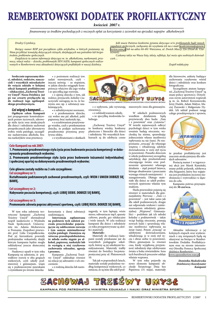 REMBERTOWSKI DODATEK PROFILAKTYCZNY kwiecień 2007 r. finansowany ze środków pochodzących z rocznych opłat za korzystanie z zezwoleń na sprzedaż napojów alkoholowych Drodzy Czytelnicy, Bieżący numer RDP jest początkiem cyklu artykułów, w których postaramy się Wam przybliżać tematykę dotyczących różnych, dotykających nas pośrednio lub bezpośrednio, problemów społecznych. Znajdziecie tu zatem informacje dotyczące m. in. alkoholizmu, narkomanii, przemocy, relacji rodzic – dziecko, problematyki HIV/AIDS, kampanii społecznych realizowanych w Rembertowie oraz aktualności dotyczących profilaktyki w naszej dzielnicy. Serdecznie zapraszamy dzieci, młodzież, rodziców, nauczycieli i wszystkich mieszkańców do wzięcia udziału w kolejnej edycji kampanii profilaktyczno – edukacyjnej „Zachowaj Trzeźwy Umysł”. Nasza Dzielnica już po raz czwarty przyłączyła się do realizacji tego ogólnopolskiego przedsięwzięcia. Coś więcej o kampanii… Ogólnym celem Kampanii jest propagowanie konstruktywnych postaw życiowych, zdrowego stylu życia oraz atrakcyjnych dla dzieci i młodzieży zachowań prospołecznych jako alternatywy wobec wielu patologii, szczególnie nadużywania alkoholu, brania narkotyków oraz przemocy. • z poziomem realizacji tzw. zadań rozwojowych, czyli – inaczej mówiąc – ze stopniem, w jakim dziecko osiągnęło kompetencje właściwe dla jego wieku i ze specyfiką jego rozwoju, • z opinią dziecka o tym, jak rodzice, przyjaciele, koledzy i nauczyciele zareagują na to, że korzysta ono np. z substancji uzależniających, • z subiektywnymi normami, • z przekonaniem dziecka, czy wolno mu pić alkohol, palić papierosy, brać narkotyki itp., • z oczekiwaniem pozytywnego wyniku, czyli z przekonaniem dziecka, że podjęte zachowania prozdrowotne przyniosą pozytywne efekty, • z wyobrażeniami o skutkach Jeśli macie Państwo konkretne pytania dotyczące w/w problematyki bądź innych zagadnień społecznych, zachęcamy do wysyłania ich na e-mail: [email protected] lub na adres 04-491 Warszawa, ul. Dwóch Mieczy 22a (Dział ds. Uzależnień). Czekamy także na Wasze listy, teksty, refleksje, być może opis osobistych doświadczeń… • z wpływem, jaki wywierają rówieśnicy, • z oddziaływaniem szkoły, • ze specyfiką środowiska lokalnego. „Zachowaj Trzeźwy Umysł” to konkursy wiedzy, konkursy plastyczne i literackie dla dzieci i młodzieży. We wszystkich konkursach są do zdobycia cenne Cele Kampanii na rok 2007: 1. Promowanie prozdrowotnego stylu życia przez budowanie poczucia kompetencji w dokonywaniu prozdrowotnych wyborów; 2. Promowanie prozdrowotnego stylu życia przez budowanie tożsamości indywidualnej i społecznej opartej na dokonywaniu prozdrowotnych wyborów; Cele główne zostały rozbite na 3 cele szczegółowe: Cel szczegółowy nr 1: Kształtowanie podstawowych zachowań prozdrowotnych, czyli: WIEM I UMIEM DOBRZE SIĘ BAWIĘ. Cel szczegółowy nr 2: Nabywanie poczucia kompetencji, czyli: LUBIĘ SIEBIE. DOBRZE SIĘ BAWIĘ. Cel szczegółowy nr 3: Promowanie zdrowia poprzez aktywność sportową, czyli: LUBIĘ RUCH. DOBRZE SIĘ BAWIĘ. W tym roku założenia teoretyczne kampanii „Zachowaj Trzeźwy Umysł” sformułował zespół naukowców z Wydziału Nauk Społecznych Uniwersytetu im. Adama Mickiewicza w Poznaniu. Zespołowi przewodzi prof. Lidia Cierpiałkowska. Pod jej kierunkiem powstały profesjonalne wskazówki, dzięki którym kampania będzie mogła oddziaływać jeszcze skuteczniej i szerzej. Naukowcy oparli w tym roku Kampanię na założeniu, iż prawidłowy rozwój w obu grupach wiekowych, czyli szkoły podstawowej i gimnazjum, wiąże się z podstawowymi zjawiskami i czynnikami po stronie dziecka: korzystania z danej substancji uzależniającej. Interwencja zaplanowana na podstawie tych założeń pozwala przeciwdziałać pojawiającym się zakłóceniom rozwoju i tym samym minimalizować ryzyko patologii. Zmniejsza się wówczas prawdopodobieństwo, że młoda osoba sięgnie po alkohol, papierosy, narkotyki lub że wystąpią u niej ryzykowne zachowania seksualne, agresja i przemoc. Kampania „Zachowaj Trzeźwy Umysł” oddziałuje również na relacje jej adresatów z ich otoczeniem: • z rodziną dziecka lub nastolatka, nagrody, w tym laptopy, wieże stereo, odtwarzacze mp3, aparaty cyfrowe, puzzle, gry edukacyjne i wiele innych. W celu realizacji kampanii dla dzieci i młodzieży co roku przygotowywane są ulotki i materiały. Materiały: Materiały do realizacji kampanii zostały przekazane już do wszystkich pedagogów szkolnych, którzy są jej szkolnymi koordynatorami. Materiały trafiły również do Świetlicy Socjoterapeutycznej przy ul. Plutonowych 10. Tak jak w poprzednich latach, materiały zostały podzielone według kompetencji wiekowych, co oznacza, że są inne dla szkół pod- Zespół redakcyjny stawowych i inne dla gimnazjów. W szkołach podstawowych wszelkim działaniom będą przyświecały dwa hasła: „Tam i z powrotem” oraz „Latawiec”. W świetle najnowszych odkryć psychologii dzieci w tym wieku uważnie badają otoczenie, wychodzą ku niemu, sprawdzając jednocześnie własne możliwości wpływania na nie (tam). Po rozpoznaniu „wracają” do własnego wnętrza i wbudowują zdobyte doświadczenia w swój styl życia (z powrotem). Ponadto dzieciom w szkole podstawowej szczególną satysfakcję daje przekształcanie otaczającego świata oraz podnoszenie sprawności własnego działania – stąd pomysł latawca, którego zbudowanie i puszczanie wymaga różnych umiejętności i zaangażowania. Dlatego materiały dla dzieci ze szkół podstawowych opatrzono właśnie tym znakiem. Hasła przewodnie pojawią się również w materiałach dla gimnazjalistów. Pierwsze – „Tam i z powrotem” – jest takie samo jak dla szkół podstawowych, drugie zaś odpowiada wiekowi i zainteresowaniom młodzieży gimnazjalnej: „Wyprawa”. Gimnazja