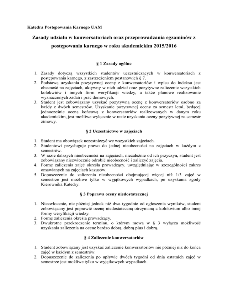 Katedra Postępowania Karnego UAM Zasady udziału w konwersatoriach oraz przeprowadzania egzaminów z postępowania karnego w roku akademickim 2015/2016 § 1 Zasady ogólne 1. Zasady dotyczą wszystkich studentów uczestniczących w konwersatoriach z postępowania karnego, z zastrzeżeniem postanowień § 7. 2. Podstawą uzyskania pozytywnej oceny z konwersatoriów i wpisu do indeksu jest obecność na zajęciach, aktywny w nich udział oraz pozytywne zaliczenie wszystkich kolokwiów i innych form weryfikacji wiedzy, a także planowe realizowanie wyznaczonych zadań i prac domowych. 3. Student jest zobowiązany uzyskać pozytywną ocenę z konwersatoriów osobno za każdy z dwóch semestrów. Uzyskanie pozytywnej oceny za semestr letni, będącej jednocześnie oceną końcową z konwersatoriów realizowanych w danym roku akademickim, jest możliwe wyłącznie w razie uzyskania oceny pozytywnej za semestr zimowy. § 2 Uczestnictwo w zajęciach 1. Student ma obowiązek uczestniczyć we wszystkich zajęciach. 2. Studentowi przysługuje prawo do jednej nieobecności na zajęciach w każdym z semestrów. 3. W razie dalszych nieobecności na zajęciach, niezależnie od ich przyczyn, student jest zobowiązany niezwłocznie odrobić nieobecność i zaliczyć zajęcia. 4. Formę zaliczenia zajęć określa prowadzący, uwzględniając w szczególności zakres omawianych na zajęciach kazusów. 5. Dopuszczenie do zaliczenia nieobecności obejmującej więcej niż 1/3 zajęć w semestrze jest możliwe tylko w wyjątkowych wypadkach, po uzyskania zgody Kierownika Katedry. § 3 Poprawa oceny niedostatecznej 1. Niezwłocznie, nie później jednak niż dwa tygodnie od ogłoszenia wyników, student zobowiązany jest poprawić ocenę niedostateczną otrzymaną z kolokwium albo innej formy weryfikacji wiedzy. 2. Formę zaliczenia określa prowadzący. 3. Dwukrotne przekroczenie terminu, o którym mowa w § 3 wyłącza możliwość uzyskania zaliczenia na ocenę bardzo dobrą, dobrą plus i dobrą. § 4 Zaliczenie konwersatoriów 1. Student zobowiązany jest uzyskać zaliczenie konwersatoriów nie później niż do końca zajęć w każdym z semestrów. 2. Dopuszczenie do zaliczenia po upływie dwóch tygodni od dnia ostatnich zajęć w semestrze jest możliwe tylko w wyjątkowych wypadkach. 3. Wpisu zaliczenia z konwersatoriów dokonuje prowadzący. W wyjątkowych wypadkach wpisu uzyskanego uprzednio zaliczenia dokonuje Kierownik Katedry Postępowania Karnego. 4. Prowadzący może udzielić przedterminowego zaliczenia konwersatoriów wyróżniającym się studentom, których udział w zajęciach, aktywność oraz uzyskane oceny uzasadniają otrzymanie oceny bardzo dobrej albo dobrej plus jeszcze przed zakończeniem zajęć. 5. W razie niewywiązania się przez studenta z obowiązków określonych w § 1-3 prowadzący odmawia zaliczenia zajęć. § 5 Dopuszczenie do egzaminu 1. Uzyskanie zaliczenia z konwersatoriów jest warunkiem dopuszczenia do egzaminu z postępowania karnego. 2. Brak zaliczenia jest równoznaczny z uzyskaniem z egzaminu oceny ndst p.a. § 6 Symulacja rozprawy sądowej 1. Studenci studiów stacjonarnych uczestniczą w przygotowaniu i realizacji symulacji rozprawy głównej w postępowaniu karnym przed sądem I instancji. 2. Symulacja rozprawy jest realizowana w semestrze letnim. 3. Przygotowanie symulacji odbywa się w ramach prac grup zajęciowych pod nadzorem prowadzącego zajęcia. 4. Realizacja symulacji ma charakter konkursowy i opiera się na rywalizacji pomiędzy grupami zajęciowymi. 5. Oceny przeprowadzonej symulacji na podstawie zapisu jej przebiegu oraz przygotowanych akt sprawy dokonuje Komisja Konkursowa powoływana przez Kierownika Katedry Postępowania Karnego. 6. Realizacja symulacji rozprawy odbywa się na podstawie jednego stanu faktycznego (kazusu) dla wszystkich grup zajęciowych, wyłonionego spośród propozycji przygotowanych przez studentów. 7. Każdy student uczestniczących w konwersatoriach z postępowania karnego ma prawo zgłoszenia własnej propozycji w terminie wyznaczonym przez prowadzącego zajęcia. Zgłoszenia dokonać może także grupa studentów licząca nie więcej niż pięć osób. 8. Stan faktyczny powinien umożliwiać aktywny udział w symulacji wszystkich członków grupy zajęciowej oraz wiązać się z koniecznością rozwiązania problemów o charakterze karnoprocesowym, a także zawierać dokładnie opisany czyn zabroniony kwalifikowany jako zbrodnia, okoliczności jego popełnienia (w tym czas, miejsce, sposób działania sprawcy), określać podział ról procesowych, uczestników postępowania (w tym nie więcej niż dwóch oskarżonych), oraz ich wstępne stanowiska w sprawie. 9. Wyboru stanu faktycznego dokonuje Komisja Konkursowa, o której mowa w ust. 4. 10. Kierownik Katedry Postępowania Karnego może w każdym roku akademickim przyznać nagrodę dla autora (autorów) zwycięskiego projektu oraz dla studentów, członków grupy zajęciowej, której symulacja zostanie oceniona najwyżej, w postaci możliwości rezygnacji z odpowiedzi na jedno z trzech pytań na egzaminie z postępowania karnego. Rezygnacja równoznaczna jest z udzieleniem odpowiedzi na to pytanie na ocenę bardzo dobrą. Kierownik Katedry Postępowania Karnego może przyznać dodatkowe wyróżnienia. § 7 Indywidualny tok studiów 1. Powyższe zasady obowiązują studentów objętych indywidualnym tokiem studiów w zakresie, w jakim nie są sprzeczne z decyzją właściwego organu w przedmiocie zgody na indywidualny tok studiów. 2. Student, który z mocy decyzji właściwego organu dołączył do grupy zajęciowej po rozpoczęciu semestru, jest zobowiązany do odrobienia wszystkich nieobecności oraz uzyskania ocen pozytywnych ze wszystkich zaległych kolokwiów i innych form sprawdzania wiedzy w terminie dwóch tygodni od dnia przypisania go do grupy zajęciowej. Przepis § 2 pkt 5 stosuje się odpowiednio. 3. Studenci objęci indywidualnym tokiem studiów mog
