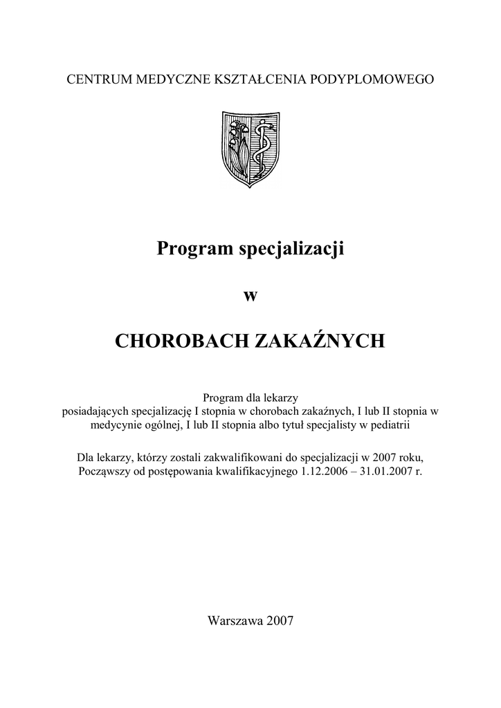 CENTRUM MEDYCZNE KSZTAŁCENIA PODYPLOMOWEGO Program specjalizacji w CHOROBACH ZAKAŹNYCH Program dla lekarzy posiadających specjalizację I stopnia w chorobach zakaźnych, I lub II stopnia w medycynie ogólnej, I lub II stopnia albo tytuł specjalisty w pediatrii Dla lekarzy, którzy zostali zakwalifikowani do specjalizacji w 2007 roku, Począwszy od postępowania kwalifikacyjnego 1.12.2006 – 31.01.2007 r. Warszawa 2007 Program dla lekarzy posiadających specjalizację I stopnia w chorobach zakaźnych, I lub II stopnia w medycynie ogólnej, I lub II stopnia albo tytuł specjalisty w pediatrii Program specjalizacji nowelizował zespól ekspertów Dr n. med. Andrzej Horban – konsultant krajowy w dziedzinie chorób zakaźnych Prof. dr hab. Robert Flisiak - przedstawiciel Polskiego Towarzystwa Epidemiologów i Lekarzy Chorób Zakaźnych Prof. dr hab. Janusz Cianciara - przedstawiciel Naczelnej Rady Lekarskiej Prof. dr hab. Waldemar Halota – przedstawiciel kosultanta krajowego Dr med. Ewa Duszczyk - przedstawiciel CMKP 1 – CEL STUDIÓW SPECJALIZACYJNYCH Cele edukacyjne Celem studiów specjalizacyjnych w chorobach zakaźnych jest przyswojenie wiedzy teoretycznej i praktycznej w diagnozowaniu, profilaktyce i leczeniu chorób na poziomie umożliwiające samodzielne prowadzenie usług leczniczych według aktualnych standardów. W dążeniu do tego celu zakłada się opanowanie przez studiującego pełnego zakresu wiedzy nakreślonej przez niniejszy program oraz nabycie umiejętności praktycznych. Ponadto założeniem studiów specjalizacyjnych jest rozwijanie pożądanych cech osobowości specjalizującego się lekarza, kształtowanie postaw etycznych, wypracowanie obowiązku ciągłego samokształcenia, poszerzania i pogłębiania umiejętności teoretycznych i praktycznych, wprowadzania nowych osiągnięć do praktyki lekarskiej oraz dzielenia się swoim doświadczeniem zawodowym poprzez publikacje i udział w konferencjach medycznych. Uzyskane kompetencje Lekarz po ukończeniu studiów specjalizacyjnych i otrzymaniu tytułu specjalisty uzyska szczególne kwalifikacje uprawniające, zgodnie z aktualną wiedzą, do: działalności diagnostyczno-leczniczej, profilaktycznej i konsultacyjnej w zakresie chorób zakaźnych, pasożytniczych i tropikalnych rozumianych jako wszystkie choroby wywołane przez czynniki mikrobiologiczne (bakterie, wirusy, priony, pierwotniaki, grzyby, pasożyty) oraz szeroko rozumianych zakażeń niezależnie od oddziału i miejsca leczenia pacjenta. Ponadto lekarz uprawniony będzie do: orzekania o potrzebie rehabilitacji leczniczej, niezdolności do pracy, niezdolności do pracy zarobkowej lub w gospodarstwie rolnym, uszczerbku na zdrowiu oraz niepełnosprawności z powodu rozpoznanych i leczonych chorób, przygotowywania specjalistycznych opinii, zaświadczeń i wniosków dotyczących leczonych chorych, udzielania konsultacji lekarskich w dziedzinie chorób zakaźnych lekarzom innych specjalności, prowadzenia promocji zdrowia i zapobiegania chorobom , kierowania, oddziałem lub przychodnią chorób zakaźnych, kierowania specjalizacją innych lekarzy w dziedzinie chorób zakaźnych, doskonalenia zawodowego innych pracowników medycznych, kierowania eksperymentem medycznym w dziedzinie chorób zakaźnych. Lekarz specjalizujący się będzie rozwijał i osiągał pożądane cechy osobowości takie jak: kierowanie się w swoich działaniach nadrzędną zasadą dobra chorego, CMKP 2007 2 Program dla lekarzy posiadających specjalizację I stopnia w chorobach zakaźnych, I lub II stopnia w medycynie ogólnej, I lub II stopnia albo tytuł specjalisty w pediatrii respektowanie społecznie akceptowanego systemu wartości, umiejętność podejmowanie decyzji oraz odpowiedzialność za postępowanie swoje i podległych pracowników, umiejętność właściwej organizacji pracy własnej i współpracowników, umiejętność stworzenia dobrych relacji z pacjentem i jego rodziną, a zwłaszcza właściwej komunikacji i sposobi informowania o postępowaniu lekarskim. 2 - ZAKRES WYMAGANEJ WIEDZY Oczekuje się, że lekarz po ukończeniu specjalizacji wykaże się znajomością przedstawionych poniżej tematów. Sytuacja epidemiologiczna chorób zakaźnych w Polsce, w Europie i na świecie, Nowe choroby zakaźne. Podstawy immunologii klinicznej . Patofizjologia zakażeń i inwazji pasożytniczych. Mikrobiologia, wirusologia i parazytologia lekarska. Patogeneza i symptomatologia kliniczna chorób zakaźnych Diagnostyka laboratoryjna chorób zakaźnych, w tym diagnostyka molekularna Leczenie przyczynowe chorób zakaźnych i zakażeń (antybiotyki, leki przeciwwirusowe, przeciwpasożytnicze, przeciwgrzybicze, surowice i immunoglobuliny), również w warunkach współistnienia ich z innymi chorobami. Diagnostyka obrazowa w chorobach zakaźnych i pasożytniczych. Profilaktyka chorób zakaźnych i pasożytniczych, w tym chorób tropikalnych. Zakażenia szpitalne i ich prewencja. Surowice lecznicze Szczepienia – i szczepionki zasady, kalendarz szczepień, kontrola efektywności. Zakażenia krwiopochodne (HBV, HCV, HIV, CMV) i ich profilaktyka. Podstawowe regulacje prawne dotyczące chorób zakaźnych i ich zwalczania. Problemy infekcji w innych specjalnościach medycznych, wraz z diagnostyką różnicowa tych stanów. Patogeneza, symptomatologia, diagnostyka i leczenie chorób wątroby Postępowanie w stanach zagrożenia życia Diagnostyka i leczenie cukrzycy, nadciśnienia, choroby wieńcowej, niewydolności krążenia, niewydolności nerek i innych chorób z dziedziny chorób wewnętrznych. 3 - ZAKRES UMIEJĘTNOŚCI PRAKTYCZNYCH WYMAGANYCH OD SPECJALISTY CHORÓB ZAKAŹNYCH Oczekuje się, że lekarz po ukończeniu specjalizacji wykaże się umiejętnością: pobierania krwi żylnej i tętniczej do badań mikrobiologicznych, przetoczenia krwi, jej preparatów i preparatów krwiozastępczych, wykonania nakłucia lędźwiowego z pobraniem PMR do badań mikrobiologicznych, biopsji dia