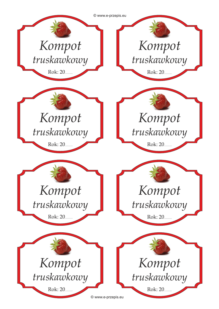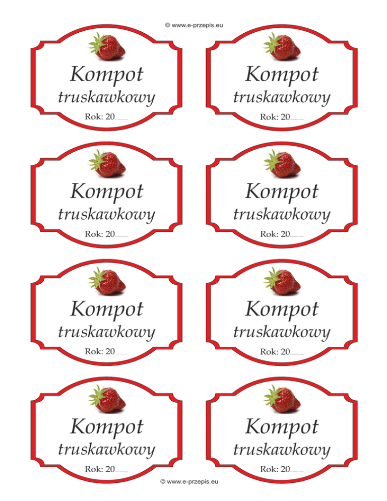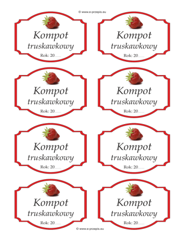 © www.e-przepis.eu Kompot Kompot truskawkowy truskawkowy Rok: 20.............. Rok: 20.............. Kompot Kompot truskawkowy truskawkowy Rok: 20.............. Rok: 20.............. Kompot Kompot truskawkowy truskawkowy Rok: 20.............. Rok: 20.............. Kompot Kompot truskawkowy truskawkowy Rok: 20.............. Rok: 20.............. © www.e-przepis.eu