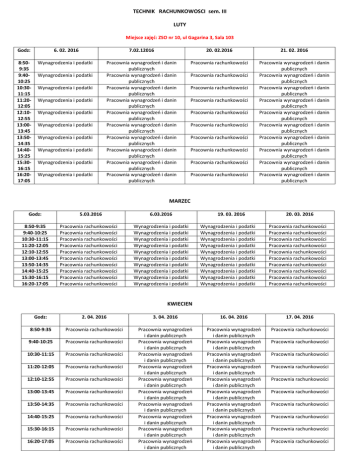 TECHNIK RACHUNKOWOSCI sem. III LUTY Miejsce zajęć: ZSO nr 10, ul Gagarina 3, Sala 103 Godz: 6. 02. 2016 7.02.12016 20. 02.2016 21. 02. 2016 8:509:35 9:4010:25 10:3011:15 11:2012:05 12:1012:55 13:0013:45 13:5014:35 14:4015:25 15:3016:15 16:2017:05 Wynagrodzenia i podatki Pracownia wynagrodzeń i danin publicznych Pracownia wynagrodzeń i danin publicznych Pracownia wynagrodzeń i danin publicznych Pracownia wynagrodzeń i danin publicznych Pracownia wynagrodzeń i danin publicznych Pracownia wynagrodzeń i danin publicznych Pracownia wynagrodzeń i danin publicznych Pracownia wynagrodzeń i danin publicznych Pracownia wynagrodzeń i danin publicznych Pracownia wynagrodzeń i danin publicznych Pracownia rachunkowości Pracownia wynagrodzeń i danin publicznych Pracownia wynagrodzeń i danin publicznych Pracownia wynagrodzeń i danin publicznych Pracownia wynagrodzeń i danin publicznych Pracownia wynagrodzeń i danin publicznych Pracownia wynagrodzeń i danin publicznych Pracownia wynagrodzeń i danin publicznych Pracownia wynagrodzeń i danin publicznych Pracownia wynagrodzeń i danin publicznych Pracownia wynagrodzeń i danin publicznych Wynagrodzenia i podatki Wynagrodzenia i podatki Wynagrodzenia i podatki Wynagrodzenia i podatki Wynagrodzenia i podatki Wynagrodzenia i podatki Wynagrodzenia i podatki Wynagrodzenia i podatki Wynagrodzenia i podatki Pracownia rachunkowości Pracownia rachunkowości Pracownia rachunkowości Pracownia rachunkowości Pracownia rachunkowości Pracownia rachunkowości Pracownia rachunkowości Pracownia rachunkowości Pracownia rachunkowości MARZEC Godz: 8:50-9:35 9:40-10:25 10:30-11:15 11:20-12:05 12:10-12:55 13:00-13:45 13:50-14:35 14:40-15:25 15:30-16:15 16:20-17:05 5.03.2016 Pracownia rachunkowości Pracownia rachunkowości Pracownia rachunkowości Pracownia rachunkowości Pracownia rachunkowości Pracownia rachunkowości Pracownia rachunkowości Pracownia rachunkowości Pracownia rachunkowości Pracownia rachunkowości 6.03.2016 Wynagrodzenia i podatki Wynagrodzenia i podatki Wynagrodzenia i podatki Wynagrodzenia i podatki Wynagrodzenia i podatki Wynagrodzenia i podatki Wynagrodzenia i podatki Wynagrodzenia i podatki Wynagrodzenia i podatki Wynagrodzenia i podatki 19. 03. 2016 Wynagrodzenia i podatki Wynagrodzenia i podatki Wynagrodzenia i podatki Wynagrodzenia i podatki Wynagrodzenia i podatki Wynagrodzenia i podatki Wynagrodzenia i podatki Wynagrodzenia i podatki Wynagrodzenia i podatki Wynagrodzenia i podatki 20. 03. 2016 Pracownia rachunkowości Pracownia rachunkowości Pracownia rachunkowości Pracownia rachunkowości Pracownia rachunkowości Pracownia rachunkowości Pracownia rachunkowości Pracownia rachunkowości Pracownia rachunkowości Pracownia rachunkowości KWIECIEN Godz: 2. 04. 2016 3. 04. 2016 16. 04. 2016 17. 04. 2016 8:50-9:35 Pracownia rachunkowości Pracownia rachunkowości 10:30-11:15 Pracownia rachunkowości 11:20-12:05 Pracownia rachunkowości 12:10-12:55 Pracownia rachunkowości 13:00-13:45 Pracownia rachunkowości 13:50-14:35 Pracownia rachunkowości 14:40-15:25 Pracownia rachunkowości 15:30-16:15 Pracownia rachunkowości 16:20-17:05 Pracownia rachunkowości Pracownia wynagrodzeń i danin publicznych Pracownia wynagrodzeń i danin publicznych Pracownia wynagrodzeń i danin publicznych Pracownia wynagrodzeń i danin publicznych Pracownia wynagrodzeń i danin publicznych Pracownia wynagrodzeń i danin publicznych Pracownia wynagrodzeń i danin publicznych Pracownia wynagrodzeń i danin publicznych Pracownia wynagrodzeń i danin publicznych Pracownia wynagrodzeń i danin publicznych Pracownia rachunkowości 9:40-10:25 Pracownia wynagrodzeń i danin publicznych Pracownia wynagrodzeń i danin publicznych Pracownia wynagrodzeń i danin publicznych Pracownia wynagrodzeń i danin publicznych Pracownia wynagrodzeń i danin publicznych Pracownia wynagrodzeń i danin publicznych Pracownia wynagrodzeń i danin publicznych Pracownia wynagrodzeń i danin publicznych Pracownia wynagrodzeń i danin publicznych Pracownia wynagrodzeń i danin publicznych Pracownia rachunkowości Pracownia rachunkowości Pracownia rachunkowości Pracownia rachunkowości Pracownia rachunkowości Pracownia rachunkowości Pracownia rachunkowości Pracownia rachunkowości Pracownia rachunkowości MAJ Godz: 8:50-9:35 9:40-10:25 10:30-11:15 11:20-12:05 12:10-12:55 13:00-13:45 13:50-14:35 14:40-15:25 15:30-16:15 16:20-17:05 7. 05. 2016 Pracownia wynagrodzeń i danin publicznych Pracownia wynagrodzeń i danin publicznych Pracownia wynagrodzeń i danin publicznych Pracownia wynagrodzeń i danin publicznych Pracownia wynagrodzeń i danin publicznych Pracownia wynagrodzeń i danin publicznych Pracownia wynagrodzeń i danin publicznych Pracownia wynagrodzeń i danin publicznych Pracownia wynagrodzeń i danin publicznych Pracownia wynagrodzeń i danin publicznych 8. 05. 2016 Pracownia rachunkowości 21. 05. 2016 Pracownia rachunkowości Pracownia rachunkowości Pracownia rachunkowości Pracownia rachunkowości Pracownia rachunkowości Pracownia rachunkowości Pracownia rachunkowości Pracownia rachunkowości Pracownia rachunkowości Pracownia rachunkowości Pracownia rachunkowości Pracownia rachunkowości Pracownia rachunkowości Pracownia rachunkowości Pracownia rachunkowości Pracownia rachunkowości Pracownia rachunkowości Pracownia rachunkowości Pracownia rachunkowości 22. 05.2016 Pracownia wynagrodzeń i danin publicznych Pracownia wynagrodzeń i danin publicznych Pracownia wynagrodzeń i danin publicznych Pracownia wynagrodzeń i danin publicznych Pracownia wynagrodzeń i danin publicznych Pracownia wynagrodzeń i danin publicznych Pracownia wynagrodzeń i danin publicznych Pracownia wynagrodzeń i danin publicznych Pracownia wynagrodzeń i danin publicznych CZERWIEC Godz: 8:50-9:35 9:40-10:25 10:30-11:15 11:20-12:05 12:10-12:55 13:00-13:45 13:50-14:35 14:40-15:25 15:30-16:15 16:20-17:05 4. 06. 2016 Pracownia rachunkowości Pracownia rachunkowości Pracownia rachun