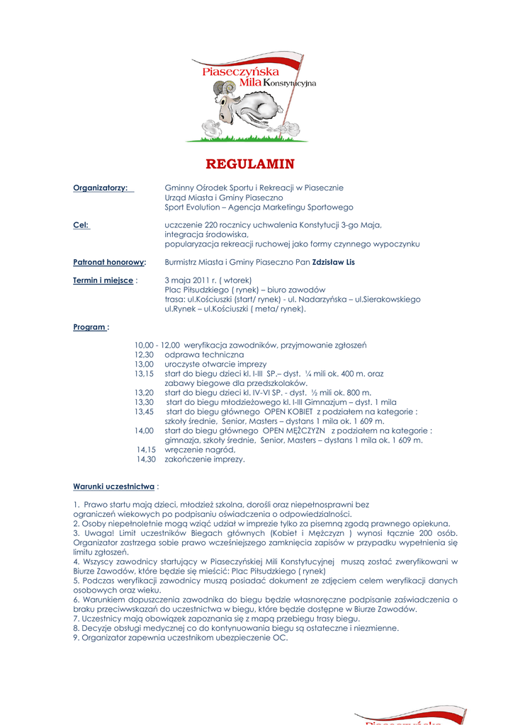 REGULAMIN Organizatorzy: Gminny Ośrodek Sportu i Rekreacji w Piasecznie Urząd Miasta i Gminy Piaseczno Sport Evolution – Agencja Marketingu Sportowego Cel: uczczenie 220 rocznicy uchwalenia Konstytucji 3-go Maja, integracja środowiska, popularyzacja rekreacji ruchowej jako formy czynnego wypoczynku Patronat honorowy: Burmistrz Miasta i Gminy Piaseczno Pan Zdzisław Lis Termin i miejsce : 3 maja 2011 r. ( wtorek) Plac Piłsudzkiego ( rynek) – biuro zawodów trasa: ul.Kościuszki (start/ rynek) - ul. Nadarzyńska – ul.Sierakowskiego ul.Rynek – ul.Kościuszki ( meta/ rynek). Program : 10,00 - 12,00 weryfikacja zawodników, przyjmowanie zgłoszeń 12,30 odprawa techniczna 13,00 uroczyste otwarcie imprezy 13,15 start do biegu dzieci kl. I-III SP.– dyst. ¼ mili ok. 400 m. oraz zabawy biegowe dla przedszkolaków. 13,20 start do biegu dzieci kl. IV-VI SP. - dyst. ½ mili ok. 800 m. 13,30 start do biegu młodzieżowego kl. I-III Gimnazjum – dyst. 1 mila 13,45 start do biegu głównego OPEN KOBIET z podziałem na kategorie : szkoły średnie, Senior, Masters – dystans 1 mila ok. 1 609 m. 14,00 start do biegu głównego OPEN MĘŻCZYZN z podziałem na kategorie : gimnazja, szkoły średnie, Senior, Masters – dystans 1 mila ok. 1 609 m. 14,15 wręczenie nagród, 14,30 zakończenie imprezy. Warunki uczestnictwa : 1. Prawo startu mają dzieci, młodzież szkolna, dorośli oraz niepełnosprawni bez ograniczeń wiekowych po podpisaniu oświadczenia o odpowiedzialności. 2. Osoby niepełnoletnie mogą wziąć udział w imprezie tylko za pisemną zgodą prawnego opiekuna. 3. Uwaga! Limit uczestników Biegach głównych (Kobiet i Mężczyzn ) wynosi łącznie 200 osób. Organizator zastrzega sobie prawo wcześniejszego zamknięcia zapisów w przypadku wypełnienia się limitu zgłoszeń. 4. Wszyscy zawodnicy startujący w Piaseczyńskiej Mili Konstytucyjnej muszą zostać zweryfikowani w Biurze Zawodów, które będzie się mieścić: Plac Piłsudzkiego ( rynek) 5. Podczas weryfikacji zawodnicy muszą posiadać dokument ze zdjęciem celem weryfikacji danych osobowych oraz wieku. 6. Warunkiem dopuszczenia zawodnika do biegu będzie własnoręczne podpisanie zaświadczenia o braku przeciwwskazań do uczestnictwa w biegu, które będzie dostępne w Biurze Zawodów. 7. Uczestnicy mają obowiązek zapoznania się z mapą przebiegu trasy biegu. 8. Decyzje obsługi medycznej co do kontynuowania biegu są ostateczne i niezmienne. 9. Organizator zapewnia uczestnikom ubezpieczenie OC. Nagrody: za miejsca I –III puchary i nagrody rzeczowe, w biegu głównym kategoria Senior - nagrody pieniężne pula nagradzanych miejsc może ulec zmianie. Zgłoszenia : 1. Zgłoszenia będą przyjmowane poprzez formularz zgłoszeniowy dostępny na stronie internetowej www.mila-piaseczno.pl Zgłoszenie powinno zawierać następujące dane: imię, nazwisko, rok urodzenia, miejsce zamieszkania, adres do korespondencji, klub, rozmiar koszulki. 2. Zgłoszenia on-line będą przyjmowane do dnia 29 kwietnia 2011. W dniu 3 maja dokonanie rejestracji będzie możliwe tylko w Biurze Zawodów. W przypadku wcześniejszego wyczerpania limitu 200 miejsc, zapisy zostaną zamknięte. 3. Zgłoszenia do biegów dziecięcych i młodzieżowych odbywać się będzie tylko w biurze zawodów w dniu 3 maja 2011. Opłaty: 1. Opłata startowa za udział w biegu głównym wynosi 10 złotych 2. Uczestnicy biegów dziecięcych i młodzieżowych są zwolnieni z opłaty startowej. 4. Opłatę należy uiścić na konto: Sport Evolution Pawelec i Sp.j., Nowa Iwiczna, ul. Zimowa 31A/28, 05500 Piaseczno, MultiBank, nr konta: 46 1140 2017 0000 4102 1235 7283 z dopiskiem – Piaseczyńska Mila Konstytucyjna – opłata startowa za …. (imię i nazwisko). 6. Każdy uczestnik jest zobowiązany do wniesienia opłaty startowej w ciągu 7 dni od momentu dokonania zgłoszenia do biegu. W przeciwnym wypadku jego zgłoszenie zostanie anulowane. 7. W przypadku opłat startowych wniesionych na konto Organizatora po 28 kwietnia 2011 konieczne będzie przedstawienie przy weryfikacji w Biurze Zawodów dowodu wpłaty w formie wydruku. 8. Opłata raz uiszczona nie podlega zwrotowi. 9. Istnieje możliwość wniesienia opłaty startowej za większą liczbę Uczestników na jednym blankiecie wpłaty (jednym przelewie). W tym wypadku w dopisku (w tytule przelewu) należy wpisać "Opłata grupowa" oraz Imiona i Nazwiska wszystkich osób zgłaszanych do biegu. 10. W ramach opłaty startowej każdy uczestnik otrzymuje: - numer startowy wraz z czterema agrafkami, - napój izotoniczny - worek na odzież. - poczęstunek Sprawy różne : Wszystkich uczestników XI Piaseczyńskiej Mili Konstytucyjnej obowiązuje niniejszy regulamin. - każdy uczestnik biegu jest zobowiązany do umieszczenia numeru startowego z przodu, na wysokości klatki piersiowej pod karą dyskwalifikacji. - organizator zapewnia ubezpieczenie OC, opiekę medyczną, wodę mineralną, - uczestnicy zobowiązani są do przestrzegania niniejszego regulaminu oraz bieżących komunikatów organizacyjnych, - zawody rozgrywane będą zgodnie z przepisami PZLA, - za rzeczy zaginione a pozostawione bez należytej opieki organizator nie ponosi odpowiedzialności, - materiały organizacyjne dostępne będą dla zainteresowanych w dniu imprezy, - nauczycie W-F , który wykaże się największą aktywnością przyprowadzając najliczniejsza grupę uczniów otrzyma wyróżnienie i nagrodę rzeczową - osobami odpowiedzialnymi za przebieg i zabezpieczenie imprezy są: Katarzyna Kondraciuk– GOSiR Piaseczno tel. 660-057-999 oraz Dariusz Pawelec- Sport Evolution tel.515-123-727 - o interpretacji niniejszego regulaminu oraz w sprawach nim nie ujętych decyduje organizator Ze sportowym pozdrowieniem Opracował: Katarzyna Kondraciuk Inspektor ds. organizacji imprez sportowych.