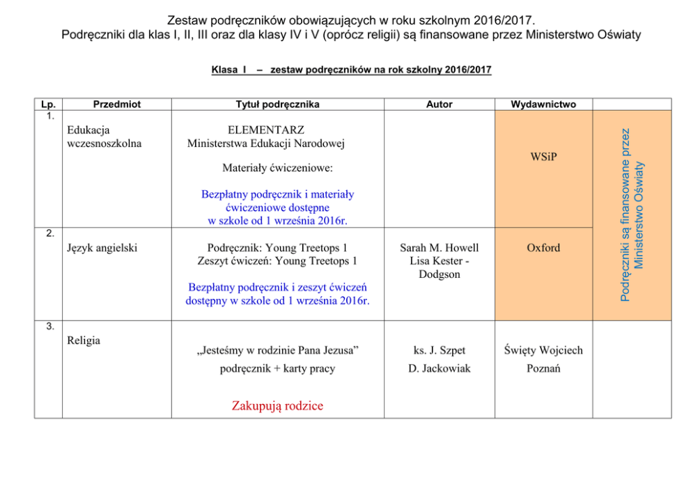 Zestaw podręczników obowiązujących w roku szkolnym 2016/2017. Podręczniki dla klas I, II, III oraz dla klasy IV i V (oprócz religii) są finansowane przez Ministerstwo Oświaty Lp. 1. Przedmiot Edukacja wczesnoszkolna – zestaw podręczników na rok szkolny 2016/2017 Tytuł podręcznika Autor Wydawnictwo ELEMENTARZ Ministerstwa Edukacji Narodowej WSiP Materiały ćwiczeniowe: Bezpłatny podręcznik i materiały ćwiczeniowe dostępne w szkole od 1 września 2016r. 2. Język angielski Podręcznik: Young Treetops 1 Zeszyt ćwiczeń: Young Treetops 1 Sarah M. Howell Lisa Kester Dodgson Oxford „Jesteśmy w rodzinie Pana Jezusa” ks. J. Szpet Święty Wojciech podręcznik + karty pracy D. Jackowiak Poznań Bezpłatny podręcznik i zeszyt ćwiczeń dostępny w szkole od 1 września 2016r. 3. Religia Zakupują rodzice Podręczniki są finansowane przez Ministerstwo Oświaty Klasa I Lp. Przedmiot Edukacja wczesnoszkolna – zestaw podręczników na rok szkolny 2016/2017 Tytuł podręcznika Autor Wydawnictwo ELEMENTARZ Ministerstwa Edukacji Narodowej Materiały ćwiczeniowe: „Nasze ćwiczenia”(4 części) E. Hryszkiewicz, B. Stępień, M. Bura ... Nowa Era Bezpłatny podręcznik i materiały ćwiczeniowe dostępne w szkole od 1 września 2016r. Język angielski Podręcznik: Young Treetops 2 Zeszyt ćwiczeń: Young Treetops 2 Sarah M. Howell Lisa Kester - Dodgson Oxford „Kochamy Pana Jezusa” ks. J. Szpet podręcznik + karty pracy D. Jackowiak Święty Wojciech Poznań Bezpłatny podręcznik i zeszyt ćwiczeń dostępny w szkole od 1 września 2016r. Religia Zakupują rodzice Podręczniki są finansowane przez Ministerstwo Oświaty Klasa II a i II b Lp. Przedmiot Edukacja wczesnoszkolna – zestaw podręczników na rok szkolny 2016/2017 Tytuł podręcznika ELEMENTARZ Ministerstwa Edukacji Narodowej Materiały ćwiczeniowe: „Ćwiczenia z pomysłem” Autor Wydawnictwo Maria Lorek, B. Ochmańska, L.Wollman A. Borchard, J. Brzózka, Bezpłatny podręcznik i materiały ćwiczeniowe K. Harmak, K. Izbińska, dostępne A. Jasiocha w szkole od 1 września 2016r. WSiP Język angielski Podręcznik: Young Treetops 3 Zeszyt ćwiczeń: Young Treetops 3 Sarah M. Howell Lisa Kester - Dodgson Oxford „Przyjmujemy Pana Jezusa” ks. Jan Szpet podręcznik + karty pracy Danuta Jackowiak Święty Wojciech Poznań Bezpłatny podręcznik i zeszyt ćwiczeń dostępny w szkole od 1 września 2016r. Religia Zakupują rodzice Podręczniki są finansowane przez Ministerstwo Oświaty Klasa III Lp. 1. 2. 3. 4. 4. 5. Przedmiot Język polski Język angielski Historia i społeczeństwo Matematyka Przyroda 5. Tytuł podręcznika Autor Wydawnictwo Ewa Horwath Anita Żegleń WSiP „Steps Forward 1” podręcznik + zeszyt ćwiczeń Tim Falla, Paul A. Davies Sylvia Wheeldon, Paul Shipton Oxford „Historia wokół nas” R. Lolo, A. Pieńkowska, R. Towalski, W. Kalwat WSiP B. Dubiecka – Kruk, E Malicka, P. Piskorski, E. Pytlak, A. Gleirischer WSiP 1. „Słowa z uśmiechem. Literatura i kultura” 2. „Słowa z uśmiechem. Nauka o języku i ortografii” podręcznik + zeszyt ćwiczeń „Matematyka z pomysłem” podręcznik dla klasy IV cz. I i II - zeszyt ćwiczeń cz. I i II „Przyroda z pomysłem” - podręcznik cz. I i cz. II - zeszyt ćwiczeń cz. I i cz. II - atlas przyrodniczy WSiP 6. 7. Zajęcia komputerowe Zajęcia techniczne Plastyka 9. Muzyka 10. Religia 9. WSiP „Lekcje z komputerem klasa 5” W. Jochemczyk, I. Krajewska – Kranas, W. Kranas, I. Samulska, M. Wyczółkowski Technika na co dzień Ewa Bubak Marcin Duda WSiP Stanisław Krzysztof Stopczyk WSiP W. Smoczyńska, K. Jakóbczak – Drążek, A. Sołtysik WSiP ks. Jan Szpet, D. Jackowiak Św. Wojciech Poznań część 1 8. Urszula Depczyk, Bożena Sienkiewicz, Halina Binkiewicz PLASTYKA Podręcznik do szkoły podstawowej klasa 4 (bez ćwiczeń) „Klucz do muzyki” - podręcznik „Jestem chrześcijaninem” podręcznik + karty pracy Zakupują rodzice WSiP Podręczniki są finansowane przez Ministerstwo Oświaty Klasa IVa i IVb – spis podręczników na rok szkolny 2016/2017 Klasa Va i Vb – spis podręczników na rok szkolny 2016/2017 2. 3. 4. 4. 5. Przedmiot Język polski Język angielski Historia i społeczeństwo Matematyka Przyroda 5. Tytuł podręcznika 1. „Słowa z uśmiechem. Literatura i kultura” 2. „Słowa z uśmiechem. Nauka o języku i ortografia” „Steps Forward 2” podręcznik + zeszyt ćwiczeń 7. WSiP Oxford „Historia wokół nas” R. Lolo, A. Pieńkowska, R. Towalski, WSiP podręcznik + zeszyt ćwiczeń W. Kalwat „Matematyka z pomysłem” podręcznik dla klasy V - zeszyt ćwiczeń „Przyroda z pomysłem” Zajęcia komputerowe Zajęcia techniczne Wydawnictwo Tim Falla, Paul A. Davies Sylvia Wheeldon, Paul Shipton - podręcznik cz. I i cz. II - zeszyt ćwiczeń cz. I i cz. II - atlas przyrodniczy WSiP 6. Autor Ewa Horwath Anita Żegleń B. Dubiecka – Kruk, E Malicka, P. Piskorski, E. Pytlak, A. Gleirischer WSiP Urszula Depczyk, Bożena Sienkiewicz, Halina Binkiewicz WSiP „Lekcje z komputerem” W. Jochemczyk, I. Krajewska – Kranas, W. Kranas, I. Samulska, M. Wyczółkowski WSiP Wychowanie komunikacyjne Ewa Bubak Marcin Duda WSiP Stanisław Krzysztof Stopczyk WSiP W. Smoczyńska, K. Jakóbczak – Drążek, A. Sołtysik WSiP ks. Jan Szpet, D. Jackowiak Św. Wojciech Poznań Karta Rowerowa 8. Plastyka 9. Muzyka 10. Religia 9. PLASTYKA Podręcznik do szkoły podstawowej klasa 5 (bez ćwiczeń) „Klucz do muzyki” - podręcznik „Wierzę w Boga” podręcznik + karty pracy Zakupują rodzice Podręczniki są finansowane przez Ministerstwo Oświaty Lp. 1. PODRĘCZNIKI I ĆWICZENIA DO KLASY VI ZAKUPUJĄ RODZICE Klasa VI – spis podręczników na rok szkolny 2016/2017 Lp. 1. 2. 3. 4. 4. Tytuł podręcznika Przedmiot Język polski „Między nami” podręcznik + zeszyt ćwiczeń Język angielski Oxford „Wczoraj i dziś” Grzegorz Wojciechowski Nowa Era B. Dubiecka – Kruk, E Malicka, P. Piskorski