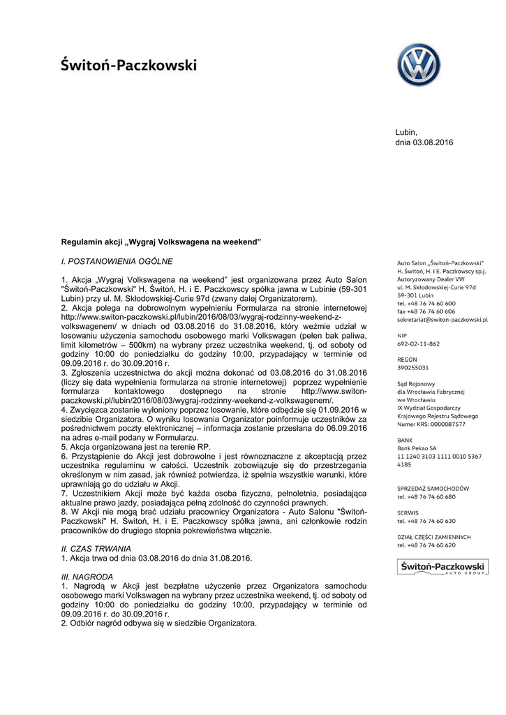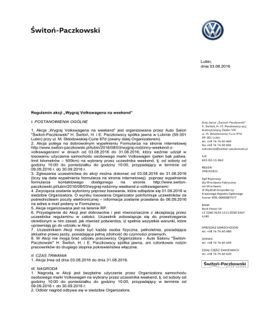 Lubin, dnia 03.08.2016 Regulamin akcji „Wygraj Volkswagena na weekend” I. POSTANOWIENIA OGÓLNE 1. Akcja „Wygraj Volkswagena na weekend” jest organizowana przez Auto Salon "Świtoń-Paczkowski" H. Świtoń, H. i E. Paczkowscy spółka jawna w Lubinie (59-301 Lubin) przy ul. M. Skłodowskiej-Curie 97d (zwany dalej Organizatorem). 2. Akcja polega na dobrowolnym wypełnieniu Formularza na stronie internetowej http://www.switon-paczkowski.pl/lubin/2016/08/03/wygraj-rodzinny-weekend-zvolkswagenem/ w dniach od 03.08.2016 do 31.08.2016, który weźmie udział w losowaniu użyczenia samochodu osobowego marki Volkswagen (pełen bak paliwa, limit kilometrów – 500km) na wybrany przez uczestnika weekend, tj. od soboty od godziny 10:00 do poniedziałku do godziny 10:00, przypadający w terminie od 09.09.2016 r. do 30.09.2016 r. 3. Zgłoszenia uczestnictwa do akcji można dokonać od 03.08.2016 do 31.08.2016 (liczy się data wypełnienia formularza na stronie internetowej) poprzez wypełnienie formularza kontaktowego dostępnego na stronie http://www.switonpaczkowski.pl/lubin/2016/08/03/wygraj-rodzinny-weekend-z-volkswagenem/. 4. Zwycięzca zostanie wyłoniony poprzez losowanie, które odbędzie się 01.09.2016 w siedzibie Organizatora. O wyniku losowania Organizator poinformuje uczestników za pośrednictwem poczty elektronicznej – informacja zostanie przesłana do 06.09.2016 na adres e-mail podany w Formularzu. 5. Akcja organizowana jest na terenie RP. 6. Przystąpienie do Akcji jest dobrowolne i jest równoznaczne z akceptacją przez uczestnika regulaminu w całości. Uczestnik zobowiązuje się do przestrzegania określonym w nim zasad, jak również potwierdza, iż spełnia wszystkie warunki, które uprawniają go do udziału w Akcji. 7. Uczestnikiem Akcji może być każda osoba fizyczna, pełnoletnia, posiadająca aktualne prawo jazdy, posiadająca pełną zdolność do czynności prawnych. 8. W Akcji nie mogą brać udziału pracownicy Organizatora - Auto Salonu "ŚwitońPaczkowski" H. Świtoń, H. i E. Paczkowscy spółka jawna, ani członkowie rodzin pracowników do drugiego stopnia pokrewieństwa włącznie. II. CZAS TRWANIA 1. Akcja trwa od dnia 03.08.2016 do dnia 31.08.2016. III. NAGRODA 1. Nagrodą w Akcji jest bezpłatne użyczenie przez Organizatora samochodu osobowego marki Volkswagen na wybrany przez uczestnika weekend, tj. od soboty od godziny 10:00 do poniedziałku do godziny 10:00, przypadający w terminie od 09.09.2016 r. do 30.09.2016 r. 2. Odbiór nagród odbywa się w siedzibie Organizatora. 3. Warunkiem odbioru nagrody jest posiadanie dokumentu tożsamości i ważnego prawa jazdy oraz wcześniejsze umówienie się na wizytę – min. 3 dni robocze przed wybranym przez uczestnika weekendem. 4. Nagrodę można odebrać na wybrany weekend przypadający w terminie od 09.09.2016 r. do 30.09.2016 r. Odbiór samochodu (nagrody) odbywa się w sobotę w godzinach od 10:00 do 14:00. Samochód (nagrodę) należy zwrócić w poniedziałek, kończący wybrany weekend, do godziny 10:00. 5. Nagroda zostanie wydana po podpisaniu umowy użyczenia - Załącznik nr 1. Załączniki nr 1 stanowi integralną część niniejszego regulaminu. 6. Integralną częścią niniejszego regulaminu jest Załącznik nr 2. Warunki umowy użyczenia samochodu. 7. W przypadku nieoddania w terminie samochodu (nagrody), a tym samym przekroczenie terminu wynikającego z umowy użyczenia lub przekroczenie określonego w umowie użyczenia limitu kilometrów Uczestnik zostanie obciążony: a) za przekroczenie terminu zwrotu samochodu (nagrody) – opłata zgodna z cennikiem wynajmu samochodów obowiązującym w Auto Salon „Świtoń-Paczkowski” H.Świtoń, H.i E.Paczkowscy spółka jawna (cennik dostępny w siedzibie Organizatora), opłata będzie naliczana od dnia, w którym zwrot nagrody miał nastąpić zgodnie z umową użyczenia, b) za przekroczenie limitu kilometrów – za każdy dodatkowy kilometr powyżej limitu opłata w wysokości 1,50 zł (słownie: jeden złoty, pięćdziesiąt groszy). 8. Nie zgłoszenie się w umówionym terminie i miejscu w celu odebrania nagrody oznacza wygaśnięcie prawa do nagrody i powoduje wygaśnięcie wszelkich roszczeń z tego tytułu. IV. POSTANOWIENIA KOŃCOWE 1. Organizator zastrzega sobie prawo weryfikacji, czy wypełniający Kartę zgłoszenia spełnia warunki określone w przepisach prawa, związanych z realizacją nagrody. W tym celu może zażądać od uczestnika złożenia określonych oświadczeń, podania określonych danych bądź przedłożenia określonych dokumentów. Niespełnienie warunków konkursu lub wynikających z przepisów prawa lub odmowa spełnienia powyższych żądań powoduje wykluczenie danego uczestnika z konkursu z jednoczesnym wygaśnięciem prawa do nagrody i jakichkolwiek innych roszczeń w stosunku do Organizatora, jak również uprawnia Organizatora do odmowy przyznania lub wydania nagrody. 2. W przypadku zaistnienia sytuacji opisanej w poprzednim punkcie Organizator ma prawo do wykonania powtórnego losowania, celem wyłonienia nowego zwycięzcy uprawnionego do odebrania nagrody. 3. Administratorem danych osobowych udostępnianych przez uczestników konkursu jest Organizator. Uczestnik może w każdej chwili uzyskać dostęp do swoich danych osobowych i żądać ich poprawienia, zmiany lub usunięcia. 4. Zgłaszając udział w Akcji uczestnik podporządkowuje się postanowieniom regulaminu konkursu i wyraża zgodę na jego treść. 5. Postanowienia regulaminu są wyłączną podstawą prowadzenia akcji, a ich wykładnia i interpretacja należy wyłącznie do Organizatora. 6. W sprawach nieunormowanych w niniejszym regulaminie, zastosowanie mają przepisy Kodeksu Cywilnego. Załącznik nr 1. Umowa użyczenia samochodu Załącznik nr 2. Warunki umowy użyczenia samochodu 1. Biorący do użyczenia oświadcza, że posiada stosowne uprawnienia do prowadzenia samochodu oraz że w przypadku ich utraty nie będzie kierować użyczo