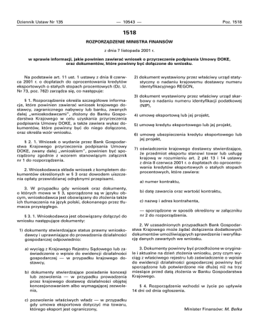 Dziennik Ustaw Nr 135 — 10543 — Poz. 1518 1518 ROZPORZÑDZENIE MINISTRA FINANSÓW z dnia 7 listopada 2001 r. w sprawie informacji, jakie powinien zawieraç wniosek o przyrzeczenie podpisania Umowy DOKE, oraz dokumentów, które powinny byç do∏àczone do wniosku. Na podstawie art. 11 ust. 1 ustawy z dnia 8 czerwca 2001 r. o dop∏atach do oprocentowania kredytów eksportowych o sta∏ych stopach procentowych (Dz. U. Nr 73, poz. 762) zarzàdza si´, co nast´puje: § 1. Rozporzàdzenie okreÊla szczegó∏owe informacje, które powinien zawieraç wniosek krajowego dostawcy, zagranicznego nabywcy lub banku, zwanych dalej „wnioskodawcami”, z∏o˝ony do Banku Gospodarstwa Krajowego w celu uzyskania przyrzeczenia podpisania Umowy DOKE, a tak˝e zawiera wykaz dokumentów, które powinny byç do niego do∏àczone, oraz okreÊla wzór wniosku. § 2. 1. Wniosek o wydanie przez Bank Gospodarstwa Krajowego przyrzeczenia podpisania Umowy DOKE, zwany dalej „wnioskiem”, powinien byç sporzàdzony zgodnie z wzorem stanowiàcym za∏àcznik nr 1 do rozporzàdzenia. 2. Wnioskodawca sk∏ada wniosek z kompletem dokumentów okreÊlonych w § 3 oraz dowodem uiszczenia op∏aty przewidzianej odr´bnymi przepisami. 3. W przypadku gdy wniosek oraz dokumenty, o których mowa w § 3, sporzàdzone sà w j´zyku obcym, wnioskodawca jest obowiàzany do z∏o˝enia tak˝e ich t∏umaczenia na j´zyk polski, dokonanego przez t∏umacza przysi´g∏ego. § 3. 1. Wnioskodawca jest obowiàzany do∏àczyç do wniosku nast´pujàce dokumenty: 1) dokumenty stwierdzajàce status prawny wnioskodawcy i uprawniajàce do prowadzenia dzia∏alnoÊci gospodarczej odpowiednio: a) wyciàg z Krajowego Rejestru Sàdowego lub zaÊwiadczenie o wpisie do ewidencji dzia∏alnoÊci gospodarczej — w przypadku krajowego dostawcy, b) dokumenty stwierdzajàce posiadanie koncesji lub zezwolenia — w przypadku prowadzenia przez krajowego dostawc´ dzia∏alnoÊci obj´tej koncesjonowaniem albo wymagajàcej zezwolenia, c) pozwolenie w∏aÊciwych w∏adz — w przypadku gdy umowa eksportowa dotyczyç ma towaru, którego eksport jest ograniczony, 2) dokument wystawiony przez w∏aÊciwy urzàd statystyczny o nadaniu krajowemu dostawcy numeru identyfikacyjnego REGON, 3) dokument wystawiony przez w∏aÊciwy urzàd skarbowy o nadaniu numeru identyfikacji podatkowej (NIP), 4) umow´ eksportowà lub jej projekt, 5) umow´ kredytu eksportowego lub jej projekt, 6) umow´ ubezpieczenia kredytu eksportowego lub jej projekt, 7) oÊwiadczenie krajowego dostawcy stwierdzajàce, ˝e przedmiot eksportu stanowi towar lub us∏ug´ krajowà w rozumieniu art. 2 pkt 13 i 14 ustawy z dnia 8 czerwca 2001 r. o dop∏atach do oprocentowania kredytów eksportowych o sta∏ych stopach procentowych, które zawiera: a) numer kontraktu, b) dat´ zawarcia oraz wartoÊç kontraktu, c) nazw´ i adres kontrahenta, — sporzàdzone w sposób okreÊlony w za∏àczniku nr 2 do rozporzàdzenia. 2. W uzasadnionych przypadkach Bank Gospodarstwa Krajowego mo˝e ˝àdaç do∏àczenia dodatkowych dokumentów umo˝liwiajàcych sprawdzenie i weryfikacj´ danych zawartych we wniosku. 3. Dokumenty powinny byç przed∏o˝one w oryginale i aktualne na dzieƒ z∏o˝enia wniosku, przy czym wyciàg z w∏aÊciwego rejestru lub zaÊwiadczenie o wpisie do ewidencji dzia∏alnoÊci gospodarczej powinny byç sporzàdzone lub potwierdzone nie d∏u˝ej ni˝ na trzy miesiàce przed datà z∏o˝enia w Banku Gospodarstwa Krajowego. § 4. Rozporzàdzenie wchodzi w ˝ycie po up∏ywie 14 dni od dnia og∏oszenia. Minister Finansów: M. Belka Dziennik Ustaw Nr 135 — 10544 — Poz. 1518 Za∏àczniki do rozporzàdzenia Ministra Finansów z dnia 7 listopada 2001 r. (poz. 1518) Za∏àcznik nr 1 WZÓR WNIOSEK o z∏o˝enie przyrzeczenia podpisania umowy DOKE Wnioskodawca ............................................................... (oznaczenie krajowego dostawcy, zagranicznego nabywcy, banku — pe∏na i skrócona nazwa, adres, adres do korespondencji) .............................................................. (miejscowoÊç i data) Bank Gospodarstwa Krajowego Al. Jerozolimskie 7 00-955 Warszawa Na podstawie art. 10 ust. 2 ustawy z dnia 8 czerwca 2001 r. o dop∏atach do oprocentowania kredytów eksportowych o sta∏ych stopach procentowych (Dz. U. Nr 73, poz. 762) wnosz´ o udzielenie przyrzeczenia zawarcia umowy DOKE przez Bank Gospodarstwa Krajowego z ................................................................................ ........................................................................................................................................................................................... (pe∏na nazwa i adres banku krajowego, banku zagranicznego lub instytucji finansowej, udzielajàcych kredytu eksportowego) OÊwiadczam, ˝e wszystkie podane poni˝ej dane i informacje sà prawdziwe i kompletne.* Wyra˝am jednoczeÊnie zgod´ na ich sprawdzenie przez Bank Gospodarstwa Krajowego. ........................................................................... (podpisy osób upowa˝nionych do sk∏adania oÊwiadczeƒ woli w imieniu wnioskodawcy) ———————————— * OÊwiadczenie nie dotyczy pkt I.4, II.8 oraz III.4, o ile sk∏adane jest nie przez osoby, których punkty te dotyczà. W tym zakresie oÊwiadczenie opiera si´ na najlepszej wiedzy wnioskodawcy. Dziennik Ustaw Nr 135 — 10545 — Poz. 1518 I. Dane dotyczàce banku udzielajàcego kredytu eksportowego: 1. a) Nazwa/firma — pe∏na i skrócona .......................................................................................................................... ....................................................................................................................................................................................... b) siedziba i adres ............................................................................................................