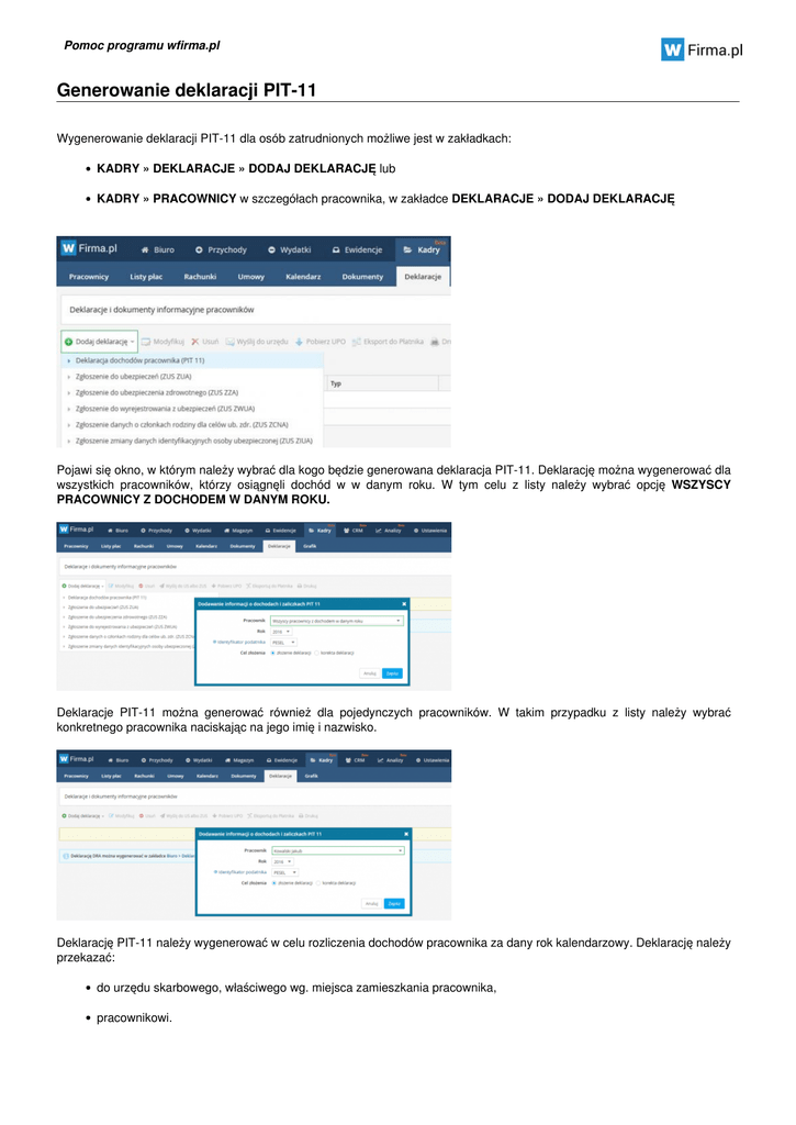 Pomoc programu wfirma.pl Generowanie deklaracji PIT-11 Wygenerowanie deklaracji PIT-11 dla osób zatrudnionych możliwe jest w zakładkach: KADRY » DEKLARACJE » DODAJ DEKLARACJĘ lub KADRY » PRACOWNICY w szczegółach pracownika, w zakładce DEKLARACJE » DODAJ DEKLARACJĘ Pojawi się okno, w którym należy wybrać dla kogo będzie generowana deklaracja PIT-11. Deklarację można wygenerować dla wszystkich pracowników, którzy osiągnęli dochód w w danym roku. W tym celu z listy należy wybrać opcję WSZYSCY PRACOWNICY Z DOCHODEM W DANYM ROKU. Deklaracje PIT-11 można generować również dla pojedynczych pracowników. W takim przypadku z listy należy wybrać konkretnego pracownika naciskając na jego imię i nazwisko. Deklarację PIT-11 należy wygenerować w celu rozliczenia dochodów pracownika za dany rok kalendarzowy. Deklarację należy przekazać: do urzędu skarbowego, właściwego wg. miejsca zamieszkania pracownika, pracownikowi. Pomoc programu wfirma.pl Egzemplarz deklaracji PIT-11 wraz z potwierdzeniem odbioru przez pracownika, należy przechowywać w dokumentacji pracowniczej. Dane o zarobkach, kosztach uzyskania przychodu i składkach zostaną pobrane z wcześniej wygenerowanych w danym roku list płac/rachunków oraz na podstawie dotyczących pracownika danych, wprowadzonych do systemu. Deklarację PIT-11 w formie papierowej należy przekazać do urzędu skarbowego do końca stycznia roku następującego po roku rozliczeniowym. W przypadku rozliczania więcej niż 5 pracowników nie można wysłać do urzędu skarbowego papierowej deklaracji PIT-11. Jeżeli płatnik rozlicza więcej niż 5 osób, ma obowiązek złożyć deklarację PIT-11 w formie elektronicznej. W przypadku formy elektronicznej termin złożenia deklaracji PIT-11 mija 28 lutego. Egzemplarz dla pracownika, należy przekazać pracownikowi do końca lutego. Aby wysłać wygenerowane dokumenty z systemu wfirma.pl należy zaznaczyć utworzony PIT-11 i wybrać opcję "wyślij do urzędu". Wysyłki można dokonać bez podpisu - wystarczy wprowadzenie kwoty przychodu z zeznania rocznego. Przesyłając deklaracje drogą elektroniczną do urzędu skarbowego, należy zachować Urzędowe Poświadczenie Odbioru (UPO) dla celów dowodowych. Pomoc programu wfirma.pl Powered by TCPDF (www.tcpdf.org)