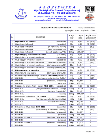 R A D Z I E M S K A Wyrób Artykułów Chemii Gospodarczej ul. Ludowa 10, 05-092 Łomianki tel. (+48) 022 751 39 72, tel. 751 51 68, fax 751 51 69, tel. kom. 0602 581 569 www.radziemska.pl e-mail: [email protected] HURTOWY CENNIK WYROBÓW WaŜny od 01.03.2009 r. egzemplarz nr xx Lp. PRODUKT wydanie 1/2009 WAGA opak. jedn. CENA netto [zł/szt.] ILOŚĆ [szt.] opak. zbiorcze (transportowe) 1 Wybielacz do firanek (saszetka) 30g 0,41 50 (800) 2 Wybielacz do firanek (saszetka) 60g 0,70 25 (400) 3 Wybielacz do firanek (w kartoniku luzem) 420g 4,83 4 Wybielacz do firanek (torba papierowa/PE) 5kg 36,17* x 5 Wybielacz do firanek (worek papierowy/PE) 25kg 154,66* x 6 Wybielający krochmal na zimno (saszetka) 40g 0,54 25 (300) 7 Wybielający krochmal na zimno (saszetka) 40g 0,47 50 (600) 8 Wybielający krochmal na zimno (saszetka) 75g 0,73 50 (300) 9 Wybielający krochmal na zimno (w kartoniku luzem) 420g 4,60 10 Wybielający krochmal na zimno (torba papierowa/PE) 5kg 34,84* x 11 Wybielający krochmal na zimno (worek papierowy/PE) 25kg 149,11* x 12 Ultramaryna w proszku (saszetka) 20g 0,76 30 (360) 13 Ultramaryna w proszku (torba papierowa/PE) 1kg 18,89* x 14 Proszek do prania ręcznego i autom. UNI-BIEL(saszetka) 70g 1,43 15 (180) 15 UNI-BIEL (porcjowany w kartoniku 6x70g) 420g 8,52 16 UNI-BIEL (kanister / wiaderko) 5kg 65,66* x 17 UNI-BIEL (wiadro) 25kg 303,11* x 18 Proszek do prania firan i zasłon PRO-BIEL 35g 0,86 25 (300) 19 PRO-BIEL (porcjowany w kartoniku 12x35g) 420g 10,12 20 PRO-BIEL (kanister / wiaderko) 5kg 72,18* x 21 PRO-BIEL (wiadro) 25kg 344,89* x 22 Wybielacz-Odplamiacz 35g 0,83 25 (300) 23 OXY-BIEL (porcjowany w kartoniku 12x35g) 420g 9,86 24 OXY-BIEL (kanister / wiaderko) 5kg 68,76* x 25 OXY-BIEL (wiadro) 25kg 305,76* x 26 Odplamiacz-Wybielacz BIO-BIEL 35g 0,90 25 (300) 27 BIO-BIEL (porcjowany w kartoniku 12x35g) 420g 10,74 28 BIO-BIEL (kanister / wiaderko) 5kg 76,19* x 29 BIO-BIEL (wiadro) 25kg 343,27* x 30 BIO-BIEL ekstra K 5kg 92,66* x 31 BIO-BIEL 25kg 417,11* x 32 BIO-BIEL ekstra G 5kg 93,02* x 33 BIO-BIEL 25kg 418,95* x OXY-BIEL (saszetka) (saszetka) (saszetka) (kanister / wiaderko) (wiadro) (kanister / wiaderko) (wiadro) (12) (12) (12) (12) (12) (12) Strona 1 / 1 R A D Z I E M S K A Wyrób Artykułów Chemii Gospodarczej ul. Ludowa 10, 05-092 Łomianki tel. (+48) 022 751 39 72, tel. 751 51 68, fax 751 51 69, tel. kom. 0602 581 569 www.radziemska.pl e-mail: [email protected] HURTOWY CENNIK WYROBÓW WaŜny od 01.03.2009 r. egzemplarz nr xx wydanie 1/2009 Lp. PRODUKT WAGA opak. jedn. CENA netto [zł/szt.] ILOŚĆ [szt.] opak. zbiorcze (transportowe) 34 Preparat wybielająco-sanityzujący OXY CLEAN(saszetka) 50g 1,11 20 (240) 35 OXY CLEAN (porcjowany w kartoniku 10x50g) 500g 10,94 (12) 36 OXY CLEAN (butelka) 1kg 21,78 (12) 37 OXY CLEAN (kanister / wiaderko) 5kg 81,31* x 38 OXY CLEAN (wiadro) 25kg 364,22* x Produkt sezonowy Cena produktu nie podlega udzielonym upustom specjalnym. W przypadku większych zamówień (kilkadziesiąt tysięcy sztuk) lub innego niŜ standardowe opakowania prosimy o wcześniejszy kontakt z naszą firmą w celu omówienia warunków transakcji. Lp. PRODUKT WAGA opak. jedn. CENA netto [zł/szt.] ILOŚĆ [szt.] opak. zbiorcze (transportowe) 39 Barwniki do jaj - spoŜywcze 1 kolor 0,35 50 (600) 40 Barwniki do jaj - spoŜywcze 3 kolory 0,49 50 (1600) 41 Barwniki do jaj - spoŜywcze 5 kolorów 0,67 50 (1600) Hurtowy cennik dotyczy zakupu towarów za kwotę powyŜej 250 złotych netto. Do podanych cen naleŜy doliczyć podatek VAT w wysokości 22% *) Ceny loco magazyn Producenta. UWAGA! Przy zakupach produktów na kwotę poniŜej 250 zł netto obowiązują ceny detaliczne (+6%) oraz doliczany jest koszt transportu. Dokument nie nadzorowany Wydruk z dnia 2009-02-23 godz. 23:50:54 Strona 2 / 2