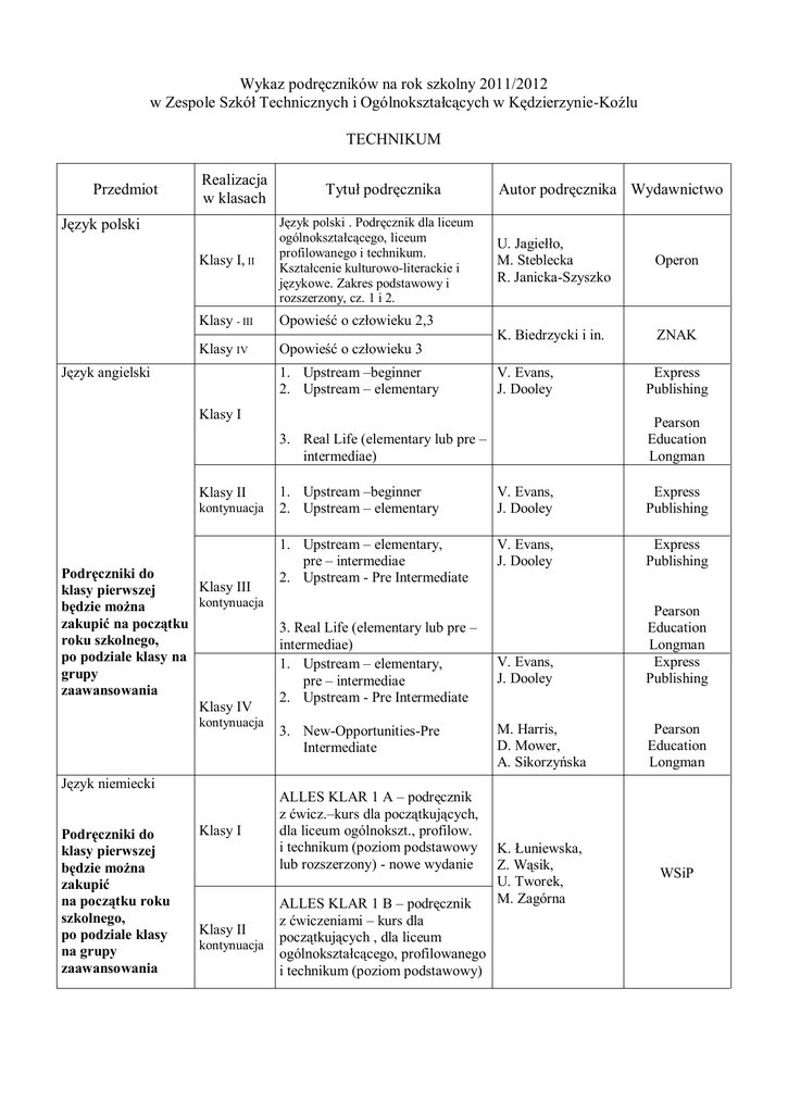 Wykaz podręczników na rok szkolny 2011/2012 w Zespole Szkół Technicznych i Ogólnokształcących w Kędzierzynie-Koźlu TECHNIKUM Przedmiot Realizacja w klasach Tytuł podręcznika Klasy I, II Język polski . Podręcznik dla liceum ogólnokształcącego, liceum profilowanego i technikum. Kształcenie kulturowo-literackie i językowe. Zakres podstawowy i rozszerzony, cz. 1 i 2. Klasy - III Opowieść o człowieku 2,3 Klasy IV Opowieść o człowieku 3 Język polski Język angielski 1. Upstream –beginner 2. Upstream – elementary Autor podręcznika Wydawnictwo U. Jagiełło, M. Steblecka R. Janicka-Szyszko Operon K. Biedrzycki i in. ZNAK V. Evans, J. Dooley Klasy I Pearson Education Longman 3. Real Life (elementary lub pre – intermediae) Klasy II kontynuacja Podręczniki do Klasy III klasy pierwszej kontynuacja będzie można zakupić na początku roku szkolnego, po podziale klasy na grupy zaawansowania Klasy IV kontynuacja Język niemiecki Podręczniki do klasy pierwszej będzie można zakupić na początku roku szkolnego, po podziale klasy na grupy zaawansowania Klasy I Klasy II kontynuacja Express Publishing 1. Upstream –beginner 2. Upstream – elementary V. Evans, J. Dooley Express Publishing 1. Upstream – elementary, pre – intermediae 2. Upstream - Pre Intermediate V. Evans, J. Dooley Express Publishing V. Evans, J. Dooley Pearson Education Longman Express Publishing M. Harris, D. Mower, A. Sikorzyńska Pearson Education Longman K. Łuniewska, Z. Wąsik, U. Tworek, M. Zagórna WSiP 3. Real Life (elementary lub pre – intermediae) 1. Upstream – elementary, pre – intermediae 2. Upstream - Pre Intermediate 3. New-Opportunities-Pre Intermediate ALLES KLAR 1 A – podręcznik z ćwicz.–kurs dla początkujących, dla liceum ogólnokszt., profilow. i technikum (poziom podstawowy lub rozszerzony) - nowe wydanie ALLES KLAR 1 B – podręcznik z ćwiczeniami – kurs dla początkujących , dla liceum ogólnokształcącego, profilowanego i technikum (poziom podstawowy) Klasy III kontynuacja Klasy IV kontynuacja Historia Klasy I Klasy II Klasy III Wiedza o społeczeństwie Klasy IV Wiedza o kulturze Klasy III Matematyka Klasy I Klasy II kontynuacja Klasy III kontynuacja Klasy IV kontynuacja Fizyka i astronomia Klasy I ALLES KLAR 1 B, 2 A – podręcznik z ćwiczeniami – kurs dla początkujących (poziom podstawowy) ALLES KLAR 1 B, 2 A – podręcznik z ćwiczeniami – kurs dla początkujących (poziom podstawowy) HISTORIA 1– podręcznik dla liceum ogólnokształcącego, liceum profilowanego i technikum (zakres podstawowy, część I, część II); B. Burda, B. Halczak, R. M. Józefiak, M. Szymczak B. Burda, HISTORIA 2 – podręcznik dla B. Halczak, liceum ogólnokształcącego, liceum R. M. Józefiak, profilowanego i technikum (zakres A. Roszak, podstawowy); M. Szymczak B. Burda, HISTORIA 3– podręcznik dla B. Halczak, liceum ogólnokształcącego, liceum R. M. Józefiak, profilowanego i technikum (zakres A. Roszak, podstawowy); M. Szymczak WIEDZA O SPOŁECZEŃSTWIE - podręcznik dla liceum Z. Smutek, ogólnokształcącego, liceum J. Maleńka, profilowanego i technikum (zakres B. Surmacz podstawowy); R. Chymkowski, Wiedza o kulturze W. Dudzik, M. Wójtowski W. Babiański, MATeMAtyka L. Chańko, (zakres podstawowy) D. Ponczek Operon Operon Operon Operon WSiP Nowa Era MATeMAtyka (zakres podstawowy) W. Babiański, L. Chańko, D. Ponczek Nowa Era MATeMAtyka (zakres podstawowy) W. Babiański, L. Chańko, D. Ponczek GWO MATEMATYKA z plusem III (zakres podstawowy) M. Dobrowolska, M. Karpiński, J. Lech GWO Fizyka dla szkół ponadgimnazjalnych, kurs podstawowy z elementami kursu rozszerzonego, cz. 1 J. Salach Zam-Kor Kraków Klasy II Fizyka dla szkół ponadgimnazjalnych, kurs podstawowy z elementami kursu rozszerzonego, cz. 2 Klasy I Chemia ogólna i nieorganiczna cz. 1, zakres podstawowy Chemia Klasy II Chemia organiczna cz. 2, zakres podstawowy Biologia Klasy I Klasy II Geografia Biologia 1 – zakres podstawowy Biologia 2 – zakres podstawowy 1. System przyrodniczy ziemi (zakres podstawowy) Klasy I Podstawy przedsiębiorczości Klasy III Technologia informacyjna Klasy I Przysposobienie obronne Klasy I - II W. Lewiński, J. Prokop, G. Skirmuntt, J. Walkiewicz E. Bartnik, J. Balerstet, W. Lewiński, M. Łoszczyca, G. Skirmuntt, K. Saboth W. Kosakowski, W. Kowalik, E. Zastrożna T. KrynickaTarnacka, G. Wnuk, Z. Wojtkowicz A. Stark, Świat w fazie przemian cz. 3 G. Wnuk, (zakres podstawowy) A. Zimończyk M. Biernacka, Podstawy przedsiębiorczości – dla J. Korba, liceum i technikum Z. Smutek Technologia informacyjna nie B. Krawczyński, tylko dla uczniów – podręcznik dla Z. Talaga, liceum i technikum M. Wilk Przysposobienie obronne – dla M. Goniewicz, technikum i liceum A. Nowak, ogólnokształcącego (część I i II) Z. Smutek 2. Człowiek gospodarzem przestrzeni geograficznej cz. 2 (zakres podstawowy) Klasy II B. Kałuża, F. Kamińska ŻAK Operon SOP Toruń Operon PWN Operon Wykaz podręczników na rok szkolny 2011/2012 w Zespole Szkół Technicznych i Ogólnokształcących w Kędzierzynie-Koźlu ZASADNICZA SZKOŁA ZAWODOWA Przedmiot Język polski Realizacja w klasach Klasy I - II Tytuł podręcznika Język polski. Podręcznik cz. I Klasy II-III Język polski. Podręcznik cz. II Język niemiecki Klasy I Klasy II Klasy III Autor podręcznika Wydawnictwo B. Banaś MEIN BERUF – język niemiecki dla zasadniczej szkoły zawodowej, część I,II P. Wolski, M. Sosińska MEIN BERUF – język niemiecki dla zas;adniczej szkoły zawodowej; część II OPERON REA Historia i wiedza o społeczeńswie Klasy I - II HISTORIA I WIEDZA O SPOŁECZEŃSTWIE – podręcznik dla zasadniczej szkoły zawodowej Z. Kozłowska, I. Ugier, P. Ugier, S. Zając SOP Oświatowiec Toruń Matematyka Klasy I- III Matematyka bliżej nas – dla zasadniczej szkoły zawodowej Praca zbiorowa pod redakcją J. Nowika Nowik Sp.j . Fizyka z astronomią dla zasadniczej szkoły zawodowej S. Brzezowski Ge