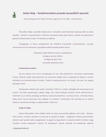 Jeden Bóg – fundamentalna prawda wszystkich wyznań Dyskurs Bhagawana Śri Sathya Sai Baby wygłoszony 25.12.1985 r. w Brindawanie Wszystkie religie, wszystkie święte pisma i wszystkie nauki duchowe wskazują tylko na jedną prawdę – jedność w poszanowaniu. Możecie wyznawać wiarę jaką chcecie. Jednak nie powinniście gardzić przekonaniami innych. To karykatura oddania. Propaganda, w którą zaangażowali się niektórzy krzewiciele chrześcijaństwa, rzucając oszczerstwa na inne wyznania, wyrządziła wielką krzywdę osobie Jezusa. Człowieku! Dzięki dobrym czynom i poświęceniu, pielęgnuj uczucie miłości. Pozbądź się złych cech i prowadź szlachetne życie. Ucieleśnienia miłości! Na tym świecie nie ma nic cenniejszego niż czas. Nie powinniście marnować nawet jednej minuty. Obecnie ludzie mają skłonność do trwonienia swego czasu na egoistyczne dążenia, zamiast poświęcać go bezinteresownej służbie. Chętnie przyjmują pomoc od innych, ale sami nie pragną pomagać innym. Istnieją dwa rodzaje ludzi: podli i szlachetni. Podli są ci, którzy zabiegaja lub otrzymują coś od innych i nie tylko zapominają o spłacie długu, lecz nawet próbują szkodzić swoim dobroczyńcom. Szlachetni są ci, którzy posiadają wrodzoną cechę przychodzenia z pomocą innym. Jeśli dają słowo, będą starali się go dotrzymać, bez względu na trudności i przeszkody. Nie wycofają się ze swoich obietnic, niezależnie od tego, co będą mówili i robili inni. Droga do Boga Kultura Bharatijów, która kładła nacisk na cztery puruszarthy (główne cele życia – dharma, artha, kama i moksza), patrzyła na życie jak na podróż do Boga – osiągnięcie mokszy (wyzwolenia). Jednak w jaki sposób ludzie zaangażowani w pogoń za bogactwem i przyjemnościami zmysłów, mogą rozwijać w sobie pragnienie mokszy? W dzisiejszych czasach człowiek nie podejmuje żadnych 1 © Organizacja Sathya Sai wysiłków, aby odkryć swoją prawdziwą naturę, czyli swoje prawdziwe przeznaczenie. Zapominając o wielkich prawdach, które przekazali światu mędrcy i prorocy Bharatu, ludzie prowadzą zupełnie bezsensowne życie, nieświadomi swoich możliwości osiągnięcia boskości. Dla przykładu, istnieje prosty gest składania dłoni, gdy pozdrawia się drugiego człowieka, ofiarując mu „namaskar”. Jakie jest wewnętrzne znaczenie tego gestu? Po pierwsze, złączenie dwóch dłoni jest przejawem jedności, która obejmuje różnorodność. Po drugie, oznacza złożenie w ofierze Panu pięciu narządów zmysłów oraz pięciu narządów działania w akcie poddania. Muzułmanie używają słowa „salam” jako formy pozdrowienia. Co ono oznacza? „Sa” odnosi się do „sat” – do Boga, który jest ucieleśnieniem prawdy, świadomości i błogości (sat-ćit-anandy), „la” oznacza „laję” (zlewanie się). „Salam” symbolizuje zatopienie się w Najwyższym, który także jest ucieleśnieniem prawdy i błogości. Chrześcijanie również mają podobne określenia wskazujące na poddanie się Panu. Podstawowa prawda Wszystkie wyznania położyły nacisk na jeden wspólny element - jest tylko jeden Bóg, a prawda jest Jego formą. Między hinduistami, muzułmanami i chrześcijanami nie istnieją żadne różnice na temat tej podstawowej idei. Wszystkie religie, wszystkie święte pisma, wszystkie nauki duchowe wskazują tylko na jedną prawdę – jedność boskości. Zamiast to sobie uświadomić, ludzie gubia się na złych drogach. Jezus poświęcił swoje życie dla odrodzenia i dla dobra ludzkości. Obecnie istnieją tacy, którzy wyolbrzymiają tzw. różnice między różnymi wyznaniami i wykorzystują je do swoich egoistycznych celów. W ten sposób przynoszą złą sławę założycielom tych religii, którzy osiągnęli bardzo wysoki stopień duchowego rozwoju. Żaden prorok ani mesjasz nie namawiał swoich zwolenników do nienawiści wobec innych religii lub ich wyznawców. Każda religia głosiła, że Bóg jest jeden, a boskość mieszka w każdej istocie. Jezus także głosił prawdę, że jeden duch mieszka we wszystkich istotach. Gdy Jezus zwracał się do Żydów, niebiański głos oznajmił: „Wszystko, co żyje, jest jednym, mój drogi Synu. Bądź taki jak wszyscy”. Gdy Jezusa krzyżowano, ten sam głos oświadczył, że ciało ludzkie jest tylko szatą dla ducha. Podlega ono ciągłym zmianom, lecz mieszkający w nim Duch jest nieśmiertelny. Tę samą prawdę głosiła Wedanta: „Ciało jest świątynią, której wewnętrznym mieszkańcem jest odwieczny duch”. Wewnętrzne znaczenie tych słów jest takie, że gdziekolwiek pójdziecie, odwieczny duch pozostanie z wami. Musicie uważać swoje ciało za świątynię ducha. Nie zapominajcie, że boskość jest zawsze w waszym wnętrzu. Dopiero gdy uświadomicie sobie tę prawdę, możecie zacząć doświadczać boskości. 2 © Organizacja Sathya Sai Nie oczerniajcie innych religijnych wyznań Czy to w hinduizmie, czy w buddyzmie, dżinizmie czy sikhizmie, chrześcijaństwie czy islamie – Bóg jest jeden i tylko jeden. Ci, którzy zapewniają o swojej wielkiej miłości do określonej religii, kłamią, twierdząc, że ich wiara jest ważniejsza od innych. Hindusi uważają hinduizm za najwspanialszą religię. W czym tkwi jej wspaniałość? Skoro głosicie, że Bóg wszystkich wyznań jest jeden, dlaczego przypisujecie wyższość hinduizmowi i oczerniacie inne wyznania? Czy to świadczy o waszej miłości do hinduizmu? Ta uwaga odnosi się także do wyznawców chrześcijaństwa. Mówią oni: „Jesteśmy chrześcijanami. Wierzymy w jedyną boskość Jezusa. Nie ma innego boskiego Zbawiciela”. Można twierdzić, że Jezus jest boski. Ale czy to upoważnia do szydzenia z innych religii? Żadna religia nie może pozwalać na oczernianie innych wyznań. Religia, która krytykuje inne wyznania, nie jest wcale religią. To forma arogancji. Wielcy święci, którzy oddawali cześć Jez