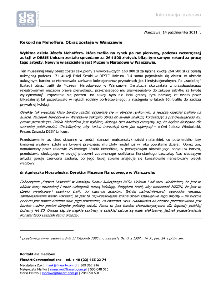 Informacja prasowa Warszawa, 14 października 2011 r. Rekord na Mehoffera. Obraz zostaje w Warszawie Wybitne dzieło Józefa Mehoffera, które trafiło na rynek po raz pierwszy, podczas wczorajszej aukcji w DESIE Unicum zostało sprzedane za 264 500 złotych, bijąc tym samym rekord za pracę tego artysty. Nowym właścicielem jest Muzeum Narodowe w Warszawie. Ten muzealnej klasy obraz został zakupiony z wywoławczych 160 000 zł za łączną kwotę 264 500 zł (z opłatą aukcyjną) podczas 171 Aukcji Dzieł Sztuki w DESIE Unicum. Już samo pojawienie się obrazu w obrocie aukcyjnym bardzo zainteresowało zarówno kolekcjonerów prywatnych jak i instytucjonalnych. Po „zaciekłej” licytacji obraz trafił do Muzeum Narodowego w Warszawie. Instytucja skorzystała z przysługującego rejestrowanym muzeom prawa pierwokupu, przyznającego mu pierwszeństwo do zakupu zabytku za kwotę wylicytowaną1. Pojawienie się portretu na aukcji było nie lada gratką, tym bardziej że dzieło przez kilkadziesiąt lat pozostawało w rękach rodziny portretowanego, a następnie w latach 60. trafiło do zacisza prywatnej kolekcji. Obiekty tak wysokiej klasy bardzo rzadko pojawiają się w obrocie rynkowym, a jeszcze rzadziej trafiają na aukcje. Muzeum Narodowe w Warszawie zakupiło obraz do swojej kolekcji, korzystając z przysługującego mu prawa pierwokupu. Dzieło Mehoffera jest wybitne, dlatego tym bardziej cieszymy się, że będzie dostępne dla szerokiej publiczności. Chcielibyśmy, aby takich transakcji było jak najwięcej – mówi Juliusz Windorbski, Prezes Zarządu DESY Unicum. Przedstawienie to, choć skromne w treści, stanowi majstersztyk sztuki malarskiej, co potwierdziło jury krajowej wystawy sztuki we Lwowie przyznając mu złoty medal już w roku powstania dzieła. Obraz ten, namalowany przez zaledwie 25-letniego Józefa Mehoffera, w początkowym okresie jego pobytu w Paryżu, przedstawia siedzącego w swojej pracowni zadumanego rzeźbiarza Konstantego Laszczkę. Nad siedzącym artystą góruje czerwona zasłona, po jego lewej stronie znajduje się kunsztownie namalowany piecyk węglowy. dr Agnieszka Morawińska, Dyrektor Muzeum Narodowego w Warszawie: Zobaczyłam „Portret Laszczki” w katalogu Domu Aukcyjnego DESA Unicum i od razu wiedziałam, że jest to obiekt klasy muzealnej i musi wzbogacić naszą kolekcję. Podjęłam kroki, aby przekonać MKiDN, że jest to dzieło wyjątkowe i powinno trafić do naszych zbiorów. Wśród najważniejszych powodów naszego zainteresowania warto wskazać, że jest to najwcześniejsze znane dzieło sztalugowe tego artysty – na płótnie podana jest nawet dzienna data jego powstania, 14 kwietnia 1894. Dodatkowo na obrazie przedstawiona jest bardzo ważna postać dziejów polskiej sztuki. Praca ta jest bardzo charakterystyczna dla legendy polskiej bohemy lat 20. Uważa się, że męskie portrety w polskiej sztuce są mało efektowne, jednak przedstawienie Konstantego Laszczki temu przeczy. 1 podstawa prawna: ustawa z dnia 21 listopada 1996 r. o muzeach, Dz. U. z 1997 r. Nr 5., poz. 24, z późn. zm. Kontakt dla mediów: FineArt Communications | tel. + 48 (22) 465 23 74 Magdalena Żuk | [email protected] | 608 362 996 Małgorzata Mańko | [email protected] | 600 048 515 Maria Peliwo | [email protected] | 784 090 531 Informacja prasowa Przepięknie kolorystycznie została zaprezentowana pracownia rzeźbiarza, malarz kunsztownie pokazał światłocień zwracając szczególna uwagę na czerwień kotary, piecyk-kozę i atrybuty sztuki rzeźbiarskiej. Ten obraz uzupełnia posiadaną przez Muzeum Narodowe w Warszawie kolekcję dzieł Józefa Mehoffera. Wizytówką zbiorów jest „Dziwny ogród” z 1903 r., przedstawiający syna artysty z żoną i piastunką, uwagę zwraca również „Słońce majowe” przedstawiające werandę domu artysty. W kolekcji znajdują się też „Muza”, „Autoportret”, portret żony artysty na złotym tle i inne. „Portret Laszczki” będzie otwierał ekspozycję obrazów Mehoffera i będzie stale wystawiany w Muzeum. Po raz pierwszy będzie można go zobaczyć w maju 2012 roku w rocznicę 150-lecia powstania MNW. Cieszymy się bardzo z tej transakcji i dziękujemy DESIE Unicum za życzliwą współpracę. ______________________________ DESA Unicum jest największą i najstarszą firmą w Polsce zajmującą się obrotem dziełami sztuki, do której należy dom aukcyjny i sieć galerii w Warszawie. Rocznie organizuje ponad 20 aukcji sztuki dawnej, współczesnej, młodej, plakatu i papieru oraz kilkanaście wystaw. Jest także partnerem wielu aukcji charytatywnych, m.in. dla Muzeum Narodowego w Warszawie i Muzeum Sztuki Nowoczesnej. Posiada wieloletnie doświadczenie w budowaniu kolekcji, pomaga przy archiwizacji i ubezpieczaniu dzieł sztuki, certyfikacji i wydawaniu ekspertyz, a także wycenie. Sprawuje opiekę i pomaga w dokumentacji kolekcji prywatnych i instytucjonalnych. Od wielu lat współpracuje z największymi domami aukcyjnymi na świecie w zakresie sprzedaży i opinii eksperckich dot. polskiej sztuki – m.in. z Christie’s i Sotheby’s. Jest współwłaścicielem firmy Art Finance, brokera na rynku ubezpieczeń dzieł sztuki, wyłącznego partnera AXA, największej na świecie firmy zajmującej się ubezpieczeniami. Wspólnie z firmą Colliers International organizuje aukcje nieruchomości. Jest właścicielem DESY Modern, która zajmuje się wprowadzaniem na rynek limitowanych edycji autorskich, tzw. inkografii. Posiada udziały w firmie DESA Biżuteria, która zajmuje się obrotem biżuterią dawną. Więcej informacji o DESIE Unicum: www.desa.pl Kontakt dla mediów: FineArt Communications | tel. + 48 (22) 465 23 74 Magdalena Żuk | [email protected] | 608 362 996 Małgorzata Mańko | [email protected] | 600 048 515 Maria Peliwo | [email protected] | 784 090 531