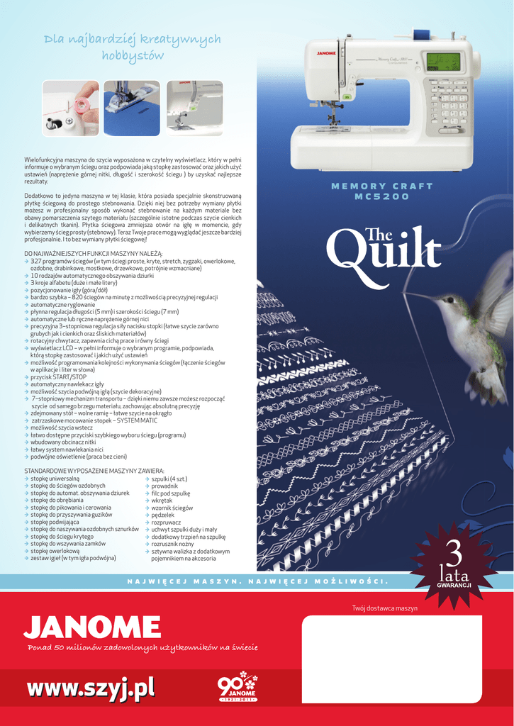 Dla najbardziej kreatywnych hobbystów Wielofunkcyjna maszyna do szycia wyposażona w czytelny wyświetlacz, który w pełni informuje o wybranym ściegu oraz podpowiada jaką stopkę zastosować oraz jakich użyć ustawień (naprężenie górnej nitki, długość i szerokość ściegu ) by uzyskać najlepsze rezultaty. Dodatkowo to jedyna maszyna w tej klasie, która posiada specjalnie skonstruowaną płytkę ściegową do prostego stebnowania. Dzięki niej bez potrzeby wymiany płytki możesz w profesjonalny sposób wykonać stebnowanie na każdym materiale bez obawy pomarszczenia szytego materiału (szczególnie istotne podczas szycie cienkich i delikatnych tkanin). Płytka ściegowa zmniejsza otwór na igłę w momencie, gdy wybierzemy ścieg prosty (stebnowy). Teraz Twoje prace mogą wyglądać jeszcze bardziej profesjonalnie. I to bez wymiany płytki ściegowej! memory craft mc5200 DO NAJWAŻNIEJSZYCH FUNKCJI MASZYNY NALEŻĄ: → 327 programów ściegów (w tym ściegi proste, kryte, stretch, zygzaki, owerlokowe, ozdobne, drabinkowe, mostkowe, drzewkowe, potrójnie wzmacniane) → 10 rodzajów automatycznego obszywania dziurki → 3 kroje alfabetu (duże i małe litery) → pozycjonowanie igły (góra/dół) → bardzo szybka – 820 ściegów na minutę z możliwością precyzyjnej regulacji → automatyczne ryglowanie → płynna regulacja długości (5 mm) i szerokości ściegu (7 mm) → automatyczne lub ręczne naprężenie górnej nici → precyzyjna 3–stopniowa regulacja siły nacisku stopki (łatwe szycie zarówno grubych jak i cienkich oraz śliskich materiałów) → rotacyjny chwytacz, zapewnia cichą prace i równy ściegi → wyświetlacz LCD – w pełni informuje o wybranym programie, podpowiada, którą stopkę zastosować i jakich użyć ustawień → możliwość programowania kolejności wykonywania ściegów (łączenie ściegów w aplikacje i liter w słowa) → przycisk START/STOP → automatyczny nawlekacz igły → możliwość szycia podwójną igłą (szycie dekoracyjne) → 7–stopniowy mechanizm transportu – dzięki niemu zawsze możesz rozpocząć szycie od samego brzegu materiału, zachowując absolutną precyzję → zdejmowany stół – wolne ramię – łatwe szycie na okrągło → zatrzaskowe mocowanie stopek – SYSTEM MATIC → możliwość szycia wstecz → łatwo dostępne przyciski szybkiego wyboru ściegu (programu) → wbudowany obcinacz nitki → łatwy system nawlekania nici → podwójne oświetlenie (praca bez cieni) STANDARDOWE WYPOSAŻENIE MASZYNY ZAWIERA: stopkę uniwersalną → szpulki (4 szt.) stopkę do ściegów ozdobnych → prowadnik stopkę do automat. obszywania dziurek → filc pod szpulkę stopkę do obrębiania → wkrętak stopkę do pikowania i cerowania → wzornik ściegów stopkę do przyszywania guzików → pędzelek stopkę podwijająca → rozpruwacz stopkę do naszywania ozdobnych sznurków → uchwyt szpulki duży i mały stopkę do ściegu krytego → dodatkowy trzpień na szpulkę stopkę do wszywania zamków → rozrusznik nożny stopkę owerlokową → sztywna walizka z dodatkowym zestaw igieł (w tym igła podwójna) pojemnikiem na akcesoria → → → → → → → → → → → → najwięcej maszyn. najwięcej możliwości. Twój dostawca maszyn Ponad 50 milionów zadowolonych użytkowników na świecie
