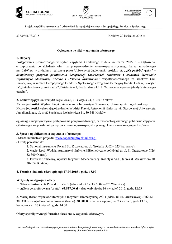 Projekt współfinansowany ze środków Unii Europejskiej w ramach Europejskiego Funduszu Społecznego 336.0641.73.2015 Kraków, 20 kwiecień 2015 r. Ogłoszenie wyników zapytania ofertowego 1. Dotyczy: Postępowania prowadzonego w trybie Zapytania Ofertowego z dnia 26 marca 2015 r. – Ogłoszenia o zaproszeniu do składania ofert na przeprowadzenie wysokospecjalistycznego kursu zawodowego pn. LabView w związku z realizacją przez Uniwersytet Jagielloński projektu pt. „„Na podbUJ rynku! – kompleksowy program podniesienia kompetencji zawodowych studentów i studentek kierunków Informatyka Stosowana, Chemia i Ochrona Środowiska.” współfinansowanego ze środków Unii Europejskiej w ramach Europejskiego Funduszu Społecznego - Program Operacyjny Kapitał Ludzki, Priorytet IV „Szkolnictwo wyższe i nauka”, Działanie 4.1, Poddziałanie 4.1.1 „Wzmocnienie potencjału dydaktycznego uczelni”. 2. Zamawiający: Uniwersytet Jagielloński, ul. Gołębia 24, 31-007 Kraków Nazwa jednostki: Wydział Fizyki, Astronomii i Informatyki Stosowanej Uniwersytetu Jagiellońskiego Nazwa jednostki wykonującej zadanie: Wydział Fizyki, Astronomii i Informatyki Stosowanej Uniwersytetu Jagiellońskiego, ul. prof. Stanisława Łojasiewicza 11, 30-348 Kraków ogłaszają niniejszym wyniki postępowania przeprowadzonego, na zasadach ogłoszonego publicznie Zapytania Ofertowego, na przedmiot: przeprowadzenie wysokospecjalistycznego kursu zawodowego pn. LabView. 3. Sposób upublicznienia zapytania ofertowego: - Strona internetowa projektu: www.napodbuj.projekt.uj.edu.pl - Ofertę przesłano do: 1. National Instruments Poland Sp. Z o.o (adres: ul. Grójecka 5, 02 – 025 Warszawa), 2. Maciej Rosół Wydział Automatyki i Inżynierii Biomedycznej AGH (adres: ul. El. Orzeszkowej 7/26; 32-300 Olkusz), 3. Jarosław Konieczny, Wydział Inżynierii Mechanicznej i Robotyki AGH, (adres al. Mickiewicza 30, 30- 059 Kraków) 4. Termin składania ofert upłynął: 17.04.2015 o godz. 15.00 Wpłynęły następujące oferty: 1. National Instruments Poland Sp. Z o.o. (adres: ul. Grójecka 5, 02 – 025 Warszawa) – ogółem cena oferowana (brutto): 63.837,00 zł – data wpłynięcia: 16 kwiecień 2015, godz. 12:53 2. Maciej Rosół, Wydział Automatyki i Inżynierii Biomedycznej AGH (adres: ul. El. Orzeszkowej 7/26; 32300 Olkusz – ogółem cena oferowana (brutto): 20.000,00 zł – data wpłynięcia: 7 kwiecień, godz.13:55, harmonogram 16 kwiecień, godz. 14:00 Oferty spełniły wymogi formalne określone w zapytaniu ofertowym. Na podbUJ rynku! – kompleksowy program podniesienia kompetencji zawodowych studentów i studentek kierunków Informatyka Stosowana, Chemia i Ochrona Środowiska Projekt współfinansowany ze środków Unii Europejskiej w ramach Europejskiego Funduszu Społecznego Zgodnie z V. 2 Zapytania Ofertowego z dnia 26 marca 2015 r. – Ogłoszenia o zaproszeniu do składania ofert na przeprowadzenie wysokospecjalistycznego kursu zawodowego pn. LabView, przy rozpatrzeniu wzięto pod uwagę cenę zaproponowaną przez Oferentów. Postanowiono przyjąć ofertę z najniższą zaproponowaną ceną i zlecić realizację przeprowadzenia wysokospecjalistycznego kursu zawodowego pn. LabView: Panu Maciejowi Rosołowi Wydział Automatyki i Inżynierii Biomedycznej AGH (adres: ul. El. Orzeszkowej 7/26; 32-300 Olkusz) Kierownik Projektu Ewelina Dyląg Na podbUJ rynku! – kompleksowy program podniesienia kompetencji zawodowych studentów i studentek kierunków Informatyka Stosowana, Chemia i Ochrona Środowiska