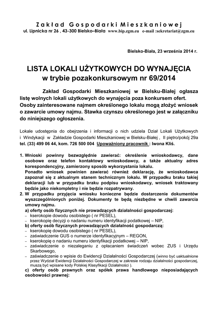 Zakład Gospodarki Mieszkaniowej ul. Lipnicka nr 26 , 43-300 Bielsko–Biała www.bip.zgm.eu e-mail :[email protected] Bielsko-Biała, 23 września 2014 r. LISTA LOKALI UŻYTKOWYCH DO WYNAJĘCIA w trybie pozakonkursowym nr 69/2014 Zakład Gospodarki Mieszkaniowej w Bielsku-Białej ogłasza listę wolnych lokali użytkowych do wynajęcia poza konkursem ofert. Osoby zainteresowane najmem określonego lokalu mogą złożyć wniosek o zawarcie umowy najmu. Stawka czynszu określonego jest w załączniku do niniejszego ogłoszenia. Lokale udostępnia do obejrzenia i informacji o nich udziela Dział Lokali Użytkowych i Windykacji w Zakładzie Gospodarki Mieszkaniowej w Bielsku-Białej , II piętro/pokój 29a tel. (33) 499 06 44, kom. 726 500 004 Upoważniony pracownik : Iwona Kliś. 1. Wnioski powinny bezwzględnie zawierać: określenie wnioskodawcy, dane osobowe oraz telefon kontaktowy wnioskodawcy, a także aktualny adres korespondencyjny, zamierzony sposób wykorzystania lokalu. Ponadto wniosek powinien zawierać również deklarację, że wnioskodawca zapoznał się z aktualnym stanem technicznym lokalu. W przypadku braku takiej deklaracji lub w przypadku braku podpisu wnioskodawcy, wniosek traktowany będzie jako niekompletny i nie będzie rozpatrywany. 2. W przypadku przyjęcia wniosku konieczne będzie dostarczenie dokumentów wyszczególnionych poniżej. Dokumenty te będą niezbędne w chwili zawarcia umowy najmu. a) oferty osób fizycznych nie prowadzących działalności gospodarczej: – kserokopie dowodu osobistego ( nr PESEL), – kserokopię decyzji o nadaniu numeru identyfikacji podatkowej – NIP, b) oferty osób fizycznych prowadzących działalność gospodarczą: – kserokopię dowodu osobistego ( nr PESEL), – zaświadczenie GUS o numerze identyfikacyjnym – REGON, – kserokopię o nadaniu numeru identyfikacji podatkowej – NIP, – zaświadczenie o niezaleganiu z opłacaniem świadczeń wobec ZUS i Urzędu Skarbowego, – zaświadczenie o wpisie do Ewidencji Działalności Gospodarczej ( winno być uaktualnione przez Wydział Ewidencji Działalności Gospodarczej w zakresie rodzaju działalności gospodarczej, muszą być wpisane kody Polskiej Klasyfikacji Działalności ). c) oferty osób prawnych oraz spółek prawa handlowego nieposiadających osobowości prawnej: Zakład Gospodarki Mieszkaniowej ul. Lipnicka nr 26 , 43-300 Bielsko–Biała www.bip.zgm.eu e-mail :[email protected] – – – – zaświadczenie GUS o numerze identyfikacyjnym – REGON, kserokopię decyzji o nadaniu numeru identyfikacji podatkowej – NIP, odpis z rejestru przedsiębiorstw, względnie stowarzyszeń wydany najpóźniej na 3 miesiące przed końcowym terminem składania ofert, oryginalne lub potwierdzone notarialnie pełnomocnictwa osób składających oferty w imieniu przedsiębiorstwa lub stowarzyszenia ( nie dotyczy osób uprawnionych do podejmowania zobowiązań w imieniu przedsiębiorstw lub stowarzyszeń wymienionych w odpisie z rejestru), zaświadczenie o niezaleganiu z opłacaniem świadczeń wobec ZUS i Urzędu Skarbowego. Wnioski należy składać pisemnie na lokal przy ul. ............ nr ... “ prosimy napisać adres i telefon kontaktowy). Jeżeli wnioskodawca chciałby zawrzeć umowę najmu na warunkach odmiennych niż warunki typowe, podawane we wzorze umowy najmu lokalu obowiązującym w Zakładzie Gospodarki Mieszkaniowej, proponowane zmiany winien określić we wniosku; zmiany te będą przedmiotem rozpatrywania. Brak informacji na ten temat we wniosku traktowany będzie jako akceptacja warunków typowych. Wzór umowy udostępniony jest do wglądu w Dziale Lokali Użytkowych i Windykacji ZGM i na stronie internetowej ZGM www.bip.zgm.eu Prosimy również o umieszczenie we wniosku upoważnienie dla ZGM do podania do publicznej wiadomości danych dot. oznaczenia wnioskodawcy i rodzaju działalności w lokalu. Wybór danych, które można opublikować należy do oferenta. Zastrzegamy sobie prawo do odstąpienia od rozpatrzenia wniosku na określony lokal lub lokale bez podania uzasadnienia i odstąpienia od zawarcia umowy najmu. Procedura wynajmu lokali zostanie przeprowadzona zgodnie z zasadami określonymi w Instrukcji gospodarowania miejskimi zasobami lokali użytkowych pozostającymi w zarządzie ZGM w Bielsku-Białej zatwierdzonej przez Prezydenta Miasta Bielska-Białej w dniu 07.06.2011r. Instrukcja dostępna jest do wglądu w Zakładzie Gospodarki Mieszkaniowej, w pok. – 3. 4. 5. 6. 7. nr 29a oraz w internecie: www.bip.zgm.eu INFORMACJE DODATKOWE 1. Jeżeli w lokalu nie ma licznika energii elektrycznej, najemca po podpisaniu umowy najmu, winien wystąpić do dostawcy energii elektrycznej o podanie warunków przyłączenia do sieci elektroenergetycznej i wnieść stosowne opłaty zależne od wielkości mocy zapotrzebowanej, wyliczonej dla danego lokalu użytkowego. Przyszły Najemca we własnym imieniu zawrze umowę o dostawę energii elektrycznej do lokalu, gdy w lokalu nie ma licznika energii elektrycznej czas oczekiwania na zawarcie umowy o dostawę energii elektrycznej może wynosić około 2 tygodni. Zakład Gospodarki Mieszkaniowej ul. Lipnicka nr 26 , 43-300 Bielsko–Biała www.bip.zgm.eu e-mail :[email protected] 2. Zgodnie z Ustawą z dnia 12 stycznia 1991r. o podatkach i opłatach lokalnych ze zmianą wprowadzoną Ustawą z dnia 30 października 2002r. (Dz.U. nr 200 poz. 1683) wszyscy posiadacze nieruchomości należących do gmin i Skarbu Państwa lub części tych nieruchomości, a więc najemcy i dzierżawcy lokali, budynków, gruntów i budowli, a także osoby posiadające te nieruchomości lub ich części bez tytułu prawnego od dnia 1 stycznia 2003r. obowiązani są płacić podatek od nieruchomości. 3. Przed podjęciem decyzji o złożeniu oferty prosimy o zasięgnięcie wszelkich informacji dotyczących przydatności i ewentualnego przystosowania danego lokalu do prowadzenia określonej działalności. 4. Zabezpieczenie ewentualnych przysz
