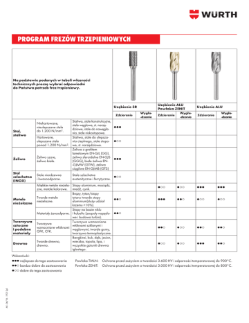 PROGRAM FREZÓW TRZEPIENIOWYCH Na podstawie podanych w tabeli własności technicznych proszę wybrać odpowiedni do Państwa potrzeb frez trzpieniowy. Uzębienie ALU Powłoka ZENIT Uzębienie 3R Zdzieranie Stal, staliwo Żeliwo Stal szlachetna (INOX) Metale nieżelazne Tworzywa sztuczne i podobne materiały Drewno Zdzieranie Wygła-dzanie Zdzieranie Wygła-dzanie Staliwa, stale konstrukcyjne, stale węglowe, st. narzę●●● dziowe, stale do nawęglania, stale niskostopowe. Hartowane, Staliwa, stale do ulepszaulepszane stale nia cieplnego, stale stopo- ●○○ ponad 1.200 N/mm². we, st. narzędziowe. Żeliwa z grafitem lamelowym EN-GJL (GG), Żeliwo szare, żeliwa sferoidalne EN-GJS ●●● żeliwo białe. (GGG), białe żeliwa EN-GJMW (GTW), żeliwa ciągliwe EN-GJMB (GTS) Niehartowane, nieulepszane stale do 1.200 N/mm². Stale nierdzewne i kwasoodporne. Stale szlachetne ●○○ austenityczne i ferrytyczne. Miękkie metale nieżela- Stopy aluminium, mosiądz, zne, metale kolorowe. miedź, cynk. Brązy, tytan/stopy Twarde metale tytanu twarde stopy ●●○ nieżelazne. aluminium(duży udział krzemu >10%). Stopy na bazie niklu Materiały żaroodporne. i kobaltu (zespoły napędo- ●●○ we i budowa turbin). Tworzywa wzmacniane Tworzywa włóknami szklanymi i wzmacniane włóknami węglowymi, twarde gumy, GFK, CFK. tworzywa termoplastyczne. Bangkirai, buk, dąb, jesion, Twarde drewno, wierzba, topola, lipa, i drewno. wszystkie gatunki drewna iglastego. Wskazówki: ●●● najlepsze do tego zastosowania ●●○ bardzo dobre do zastosowania ●○○ dobre do tego zastosowania AK - 06/16 - 19312pl Wygła-dzanie Uzębienie ALU ●○○ ●○○ ●●● ●●● ●●● ●●○ ●○○ ●○○ ●●○ ●○○ ●●○ ●●○ ●○○ ●○○ ●●● ●●○ Powłoka TIALN: Ochrona przed zużyciem o twardości 3.600 HV i odporności temperaturowej do 900°C. Powłoka ZENIT: Ochrona przed zużyciem o twardości 3.000 HV i odporności temperaturowej do 800°C.