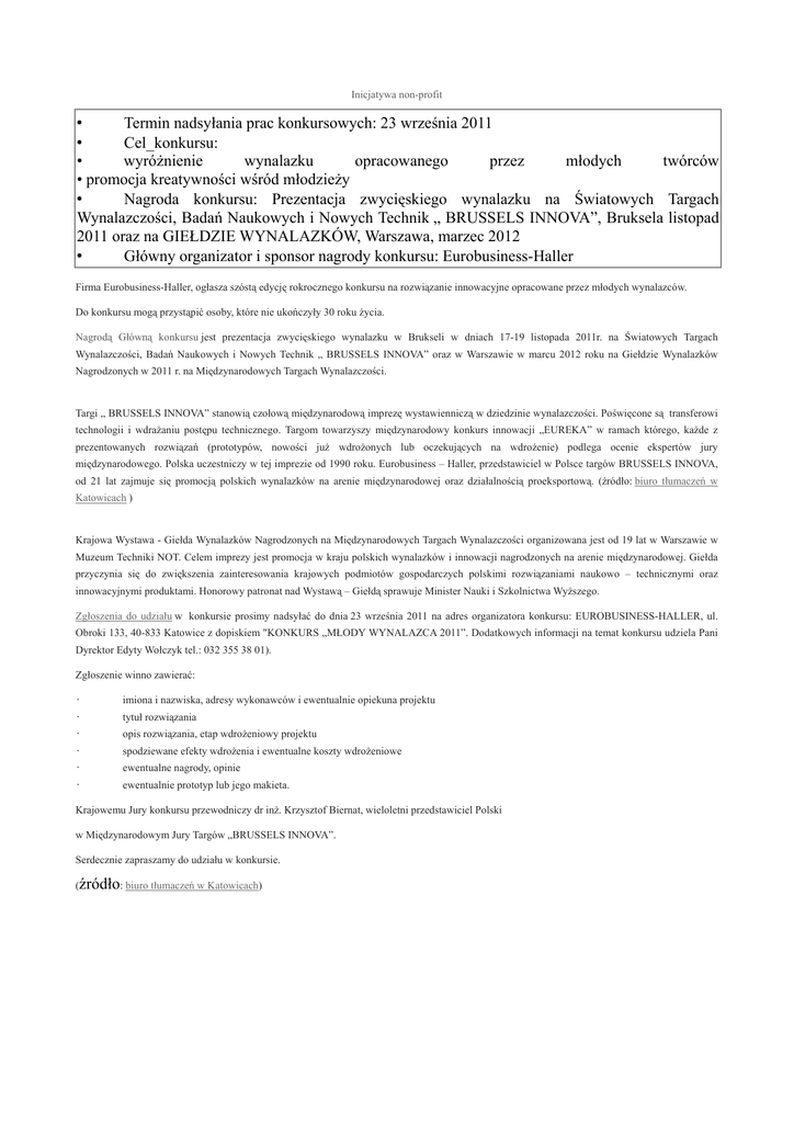 Inicjatywa non-profit • Termin nadsyłania prac konkursowych: 23 września 2011 • Cel_konkursu: • wyróżnienie wynalazku opracowanego przez młodych twórców • promocja kreatywności wśród młodzieży • Nagroda konkursu: Prezentacja zwycięskiego wynalazku na Światowych Targach Wynalazczości, Badań Naukowych i Nowych Technik „ BRUSSELS INNOVA”, Bruksela listopad 2011 oraz na GIEŁDZIE WYNALAZKÓW, Warszawa, marzec 2012 • Główny organizator i sponsor nagrody konkursu: Eurobusiness-Haller Firma Eurobusiness-Haller, ogłasza szóstą edycję rokrocznego konkursu na rozwiązanie innowacyjne opracowane przez młodych wynalazców. Do konkursu mogą przystąpić osoby, które nie ukończyły 30 roku życia. Nagrodą Główną konkursu jest prezentacja zwycięskiego wynalazku w Brukseli w dniach 17-19 listopada 2011r. na Światowych Targach Wynalazczości, Badań Naukowych i Nowych Technik „ BRUSSELS INNOVA” oraz w Warszawie w marcu 2012 roku na Giełdzie Wynalazków Nagrodzonych w 2011 r. na Międzynarodowych Targach Wynalazczości. Targi „ BRUSSELS INNOVA” stanowią czołową międzynarodową imprezę wystawienniczą w dziedzinie wynalazczości. Poświęcone są transferowi technologii i wdrażaniu postępu technicznego. Targom towarzyszy międzynarodowy konkurs innowacji „EUREKA” w ramach którego, każde z prezentowanych rozwiązań (prototypów, nowości już wdrożonych lub oczekujących na wdrożenie) podlega ocenie ekspertów jury międzynarodowego. Polska uczestniczy w tej imprezie od 1990 roku. Eurobusiness – Haller, przedstawiciel w Polsce targów BRUSSELS INNOVA, od 21 lat zajmuje się promocją polskich wynalazków na arenie międzynarodowej oraz działalnością proeksportową. (źródło: biuro tłumaczeń w Katowicach ) Krajowa Wystawa - Giełda Wynalazków Nagrodzonych na Międzynarodowych Targach Wynalazczości organizowana jest od 19 lat w Warszawie w Muzeum Techniki NOT. Celem imprezy jest promocja w kraju polskich wynalazków i innowacji nagrodzonych na arenie międzynarodowej. Giełda przyczynia się do zwiększenia zainteresowania krajowych podmiotów gospodarczych polskimi rozwiązaniami naukowo – technicznymi oraz innowacyjnymi produktami. Honorowy patronat nad Wystawą – Giełdą sprawuje Minister Nauki i Szkolnictwa Wyższego. Zgłoszenia do udziału w konkursie prosimy nadsyłać do dnia 23 września 2011 na adres organizatora konkursu: EUROBUSINESS-HALLER, ul. Obroki 133, 40-833 Katowice z dopiskiem "KONKURS „MŁODY WYNALAZCA 2011”. Dodatkowych informacji na temat konkursu udziela Pani Dyrektor Edyty Wołczyk tel.: 032 355 38 01). Zgłoszenie winno zawierać: • imiona i nazwiska, adresy wykonawców i ewentualnie opiekuna projektu • tytuł rozwiązania • opis rozwiązania, etap wdrożeniowy projektu • spodziewane efekty wdrożenia i ewentualne koszty wdrożeniowe • ewentualne nagrody, opinie • ewentualnie prototyp lub jego makieta. Krajowemu Jury konkursu przewodniczy dr inż. Krzysztof Biernat, wieloletni przedstawiciel Polski w Międzynarodowym Jury Targów „BRUSSELS INNOVA”. Serdecznie zapraszamy do udziału w konkursie. (źródło: biuro tłumaczeń w Katowicach)