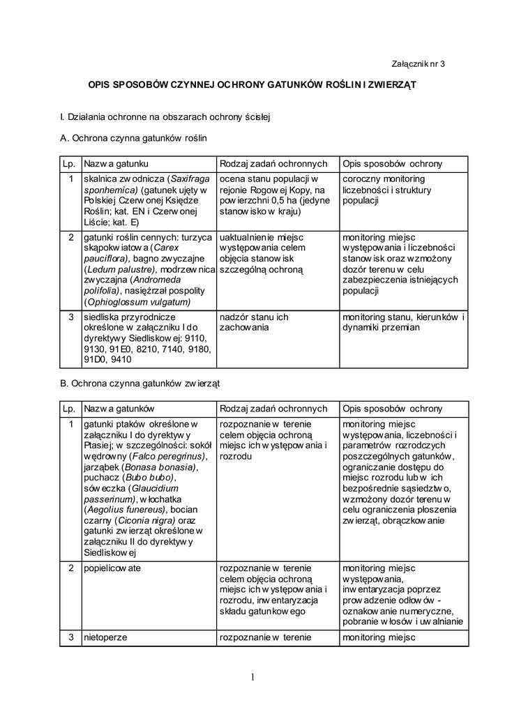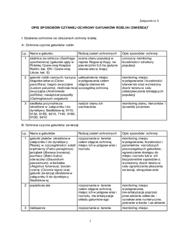 Załącznik nr 3 OPIS SPOSOBÓW CZYNNEJ OCHRONY GATUNKÓW ROŚLIN I ZWIERZĄT I. Działania ochronne na obszarach ochrony ścis łej A. Ochrona czynna gatunków roślin Lp. Nazw a gatunku Rodzaj zadań ochronnych Opis sposobów ochrony 1 skalnica zw odnicza (Saxifraga sponhemica) (gatunek ujęty w Polskiej Czerw onej Księdze Roślin; kat. EN i Czerw onej Liście; kat. E) ocena stanu populacji w rejonie Rogow ej Kopy, na pow ierzchni 0,5 ha (jedyne stanow isko w kraju) coroczny monitoring liczebności i struktury populacji 2 gatunki roślin cennych: turzyca skąpokw iatow a (Carex pauciflora), bagno zwyczajne (Ledum palustre), modrzew nica zwyczajna (Andromeda polifolia), nasięźrzał pospolity (Ophioglossum vulgatum) uaktualnienie miejsc występowania celem objęcia stanow isk szczególną ochroną monitoring miejsc występowania i liczebności stanow isk oraz wzmoŜony dozór terenu w celu zabezpieczenia istniejących populacji 3 siedliska przyrodnicze nadzór stanu ich określone w załączniku I do zachowania dyrektywy Siedliskow ej: 9110, 9130, 91E0, 8210, 7140, 9180, 91D0, 9410 monitoring stanu, kierunków i dynamiki przemian B. Ochrona czynna gatunków zw ierząt Lp. Nazw a gatunków Rodzaj zadań ochronnych Opis sposobów ochrony 1 gatunki ptaków określone w załączniku I do dyrektyw y Ptasiej; w szczególności: sokół wędrowny (Falco peregrinus), jarząbek (Bonasa bonasia), puchacz (Bubo bubo), sów eczka (Glaucidium passerinum), w łochatka (Aegolius funereus), bocian czarny (Ciconia nigra) oraz gatunki zw ierząt określone w załączniku II do dyrektyw y Siedliskow ej rozpoznanie w terenie celem objęcia ochroną miejsc ich w ystępow ania i rozrodu monitoring miejsc występowania, liczebności i parametrów rozrodczych poszczególnych gatunków, ograniczanie dostępu do miejsc rozrodu lub w ich bezpośrednie sąsiedztw o, wzmoŜony dozór terenu w celu ograniczenia płoszenia zw ierząt, obrączkow anie 2 popielicow ate rozpoznanie w terenie celem objęcia ochroną miejsc ich w ystępow ania i rozrodu, inw entaryzacja składu gatunkow ego monitoring miejsc występowania, inw entaryzacja poprzez prow adzenie odłow ów oznakow anie numeryczne, pobranie w łosów i uw alnianie 3 nietoperze rozpoznanie w terenie monitoring miejsc 1 celem objęcia ochroną miejsc ich w ystępow ania; zarówno schronień zimow ych i letnich (w tym miejsc rozrodu) występowania i liczebności poszczególnych gatunków, ograniczanie dostępu do miejsc rozrodu lub w ich bezpośrednie sąsiedztw o, wzmoŜony dozór terenu w celu ograniczenia płoszenia zw ierząt. II. Sposoby ochrony czynnej na obszarach ochrony czynnej A. Ochrona czynna gatunków roślin Lp. Nazw a gatunków Rodzaj zadań ochronnych Opis sposobów ochrony 1 ochrona rodzimych gatunków roślin przed wypieraniem przez gatunki inw azyjne obcego pochodzenia monitoring obszarów ochrony czynnej w zakresie występowania inw azyjnych gatunków roślin takich jak: rdestow iec ostrokończysty (Reynoutria japonica), rdestow iec sachaliński (Reynoutria sachalinensis), rdestow iec pośredni (Reynoutria x bohemica), barszcz Sosnowskiego (Heracleum sosnowskyi), barszcz Mantegazziego (Heracleum mantegazianum), niecierpek gruczołow aty (Impatiens glandulifera) w przypadku stw ierdzenia inw azyjnych gatunków roślin ich koszenie, wykopywanie i wyw iezienie poza granice Par ku lub zniszczenie 2 gatunki roślin cennych (rzadkie i chronione): w idłak jałow cowaty (Lycopodium annotinum), w idłak goździsty (Lycopodium clavatum), w idłak wroniec (Huperzia selago), zanokcica zielona (Asplenium viride), zanokcica północna (Asplenium septentrionalne), podrzeń Ŝebrow iec (Blechnum spicant), paprotnik kolczysty (Polystichum aculeatum), turzyca skąpokw iatow a (Carex parvifolia), turzyca zwisła (Carex pendula), dzwonek szerokolistny (Campanula latifolia), gruszycznik jednokw iatow y (Moneses uniflora), kukułka Fuchsa (Dactylorhiza fuchsii), gnieźnik leśny (Neotia nidus-avis), kruszczyk szerokolistny uaktualnienie miejsc występowania celem objęcia stanow isk szczególną ochroną monitoring miejsc występowania i liczebności stanow isk oraz wzmoŜony dozór terenu w celu zabezpieczenia istniejących populacji 2 (Epipactis helleborine), pełnik europejski (Trollius europaeus), orlik pospolity (Aquliegia vulgaris), przylaszczka pospolita (Hepatica nobilis), zimow it jesienny (Colchicum atumnale), śnieŜyca wiosenna (Leucojum vernum), liczydło górskie (Streptopus amplexifolius), lilia złotogłów (Lilium martagon), ciemięŜyca zielona (Varatrum lobelianum), czosnek niedźw iedzi (Allium ursinum), goryczuszka orzęsiona (Gentianella ciliata), baŜyna czarna (Empetrum nigrum), wełnianka pochw owata (Eriophorum vaginatum), parzydło leśne (Aruncus sylvestris), wawrzynek w ilczełyko (Daphne mezereum) 3 rojow nik pospolity (Jovibarba sobolifera) monitoring populacji; działania z mierzające do pow iększenia liczebności populacji i stanow isk rozmnaŜanie w egetatywne kilku osobników (5), następnie w prow adzenie na now e stanowisko (odział 95) 4 bagno zw yczajne (Ledum palustre), monitoring populacji; działania z mierzające do pow iększenia liczebności populacji i stanow isk zbiór i w ysiew nasion z około 4 osobników 5 sosna drzewokosa (Pinus x rhaetica), monitoring populacji; działania z mierzające do pow iększenia liczebności populacji i stanow isk zbiór szyszek z około 50 osobników i wysiew nasion 6 siedliska przyrodnicze określone w załączniku I do dyrektywy Siedliskow ej: 9110, 9130, 91E0, 7140, 6430, 6510, 7110, 9180, 91D0, 9410 nadzór stanu ich zachowania, przeciw działanie procesom sukcesyjnym w ekosystemach traw iastych monitoring stanu, kierunków i dynamiki przemian oraz koszenie lub ekstensyw ny wypas zbiorowisk łąkowych B. Ochrona czynna gatunków zw ierząt Lp. Nazw a gatunków 1 gatunki ptaków określone w załączniku I do dyrektyw y Ptasiej, w szczególności: puchacz (Bubo Bubo), sów eczka