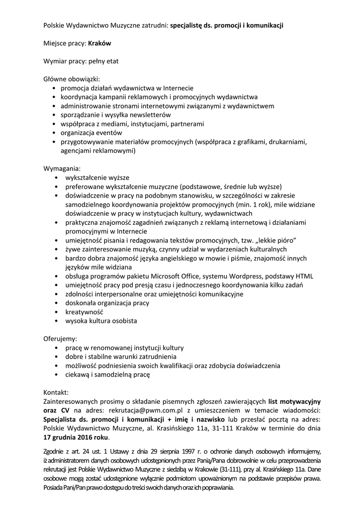 Polskie Wydawnictwo Muzyczne zatrudni: specjalistę ds. promocji i komunikacji Miejsce pracy: Kraków Wymiar pracy: pełny etat Główne obowiązki: • promocja działań wydawnictwa w Internecie • koordynacja kampanii reklamowych i promocyjnych wydawnictwa • administrowanie stronami internetowymi związanymi z wydawnictwem • sporządzanie i wysyłka newsletterów • współpraca z mediami, instytucjami, partnerami • organizacja eventów • przygotowywanie materiałów promocyjnych (współpraca z grafikami, drukarniami, agencjami reklamowymi) Wymagania: • wykształcenie wyższe • preferowane wykształcenie muzyczne (podstawowe, średnie lub wyższe) • doświadczenie w pracy na podobnym stanowisku, w szczególności w zakresie samodzielnego koordynowania projektów promocyjnych (min. 1 rok), mile widziane doświadczenie w pracy w instytucjach kultury, wydawnictwach • praktyczna znajomość zagadnień związanych z reklamą internetową i działaniami promocyjnymi w Internecie • umiejętność pisania i redagowania tekstów promocyjnych, tzw. „lekkie pióro” • żywe zainteresowanie muzyką, czynny udział w wydarzeniach kulturalnych • bardzo dobra znajomość języka angielskiego w mowie i piśmie, znajomość innych języków mile widziana • obsługa programów pakietu Microsoft Office, systemu Wordpress, podstawy HTML • umiejętność pracy pod presją czasu i jednoczesnego koordynowania kilku zadań • zdolności interpersonalne oraz umiejętności komunikacyjne • doskonała organizacja pracy • kreatywność • wysoka kultura osobista Oferujemy: • pracę w renomowanej instytucji kultury • dobre i stabilne warunki zatrudnienia • możliwość podniesienia swoich kwalifikacji oraz zdobycia doświadczenia • ciekawą i samodzielną pracę Kontakt: Zainteresowanych prosimy o składanie pisemnych zgłoszeń zawierających list motywacyjny oraz CV na adres: [email protected] z umieszczeniem w temacie wiadomości: Specjalista ds. promocji i komunikacji + imię i nazwisko lub przesłać pocztą na adres: Polskie Wydawnictwo Muzyczne, al. Krasińskiego 11a, 31-111 Kraków w terminie do dnia 17 grudnia 2016 roku. Zgodnie z art. 24 ust. 1 Ustawy z dnia 29 sierpnia 1997 r. o ochronie danych osobowych informujemy, iż administratorem danych osobowych udostępnionych przez Panią/Pana dobrowolnie w celu przeprowadzenia rekrutacji jest Polskie Wydawnictwo Muzyczne z siedzibą w Krakowie (31-111), przy al. Krasińskiego 11a. Dane osobowe mogą zostać udostępnione wyłącznie podmiotom upoważnionym na podstawie przepisów prawa. Posiada Pani/Pan prawo dostępu do treści swoich danych oraz ich poprawiania.