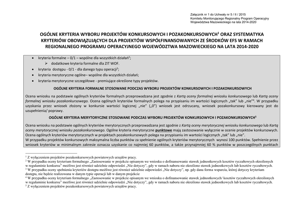 Załącznik nr 1 do Uchwały nr 5 / II / 2015 Komitetu Monitorującego Regionalny Program Operacyjny Województwa Mazowieckiego na lata 2014-2020 OGÓLNE KRYTERIA WYBORU PROJEKTÓW KONKURSOWYCH I POZAKONKURSOWYCH1 ORAZ SYSTEMATYKA KRYTERIÓW OBOWIĄZUJĄCYCH DLA PROJEKTÓW WSPÓŁFINANSOWANYCH ZE ŚRODKÓW EFS W RAMACH REGIONALNEGO PROGRAMU OPERACYJNEGO WOJEWÓDZTWA MAZOWIECKIEGO NA LATA 2014-2020 kryteria formalne – 0/1 – wspólne dla wszystkich działań2; dodatkowe kryteria formalne dla ZIT WOF. kryteria dostępu - 0/1 - dla danego typu operacji3; kryteria merytoryczne ogólne– wspólne dla wszystkich działań; kryteria merytoryczne szczegółowe - premiujące określone typy projektów. OGÓLNE KRYTERIA FORMALNE STOSOWANE PODCZAS WYBORU PROJEKTÓW KONKURSOWYCH I POZAKONKURSOWYCH Ocena wniosku na podstawie ogólnych kryteriów formalnych przeprowadzana jest zgodnie z Kartą oceny formalnej wniosku konkursowego lub Kartą oceny formalnej wniosku pozakonkursowego. Ocena ogólnych kryteriów formalnych polega na przypisaniu im wartości logicznych „tak” lub „nie”4. W przypadku uzyskania przez wniosek złożony w konkursie wartości logicznej „nie” („0”) wniosek jest odrzucany, wniosek pozakonkursowy kierowany jest do uzupełnienia/ poprawy. OGÓLNE KRYTERIA MERYTORYCZNE STOSOWANE PODCZAS WYBORU PROJEKTÓW KONKURSOWYCH I POZAKONKURSOWYCH5 Ocena wniosku na podstawie ogólnych kryteriów merytorycznych przeprowadzana jest zgodnie z Kartą oceny merytorycznej wniosku konkursowego lub Kartą oceny merytorycznej wniosku pozakonkursowego. Ogólne kryteria merytoryczne punktowe mają zastosowanie wyłącznie w ocenie projektów konkursowych. Ocena ogólnych kryteriów merytorycznych w projektach pozakonkursowych polega na przypisaniu im wartości logicznych „tak” lub „nie”. W przypadku projektów konkursowych maksymalna liczba punktów za spełnienie ogólnych kryteriów merytorycznych wynosi 100 punktów. Spełnienie przez wniosek kryteriów w minimalnym zakresie oznacza uzyskanie co najmniej 60 punktów, a także przynajmniej 60 % punktów w poszczególnych punktach Z wyłączeniem projektów pozakonkursowych powiatowych urzędów pracy. W przypadku oceny kryterium formalnego „Zastosowanie w projekcie opisanym we wniosku o dofinansowanie stawek jednostkowych kosztów ryczałtowych określonych w regulaminie konkursu” możliwe jest również udzielnie odpowiedzi „Nie dotyczy”, gdy w ramach naboru nie określono stawek jednostkowych lub kosztów ryczałtowych. 3 W przypadku oceny spełnienia kryteriów dostępu możliwe jest również udzielnie odpowiedzi „Nie dotyczy”, np. gdy dana forma wsparcia, której dotyczy kryterium dostępu, nie będzie realizowana w danym typie operacji lub w danym projekcie 4 W przypadku oceny kryterium formalnego „Zastosowanie w projekcie opisanym we wniosku o dofinansowanie stawek jednostkowych/ kosztów ryczałtowych określonych w regulaminie konkursu” możliwe jest również udzielnie odpowiedzi „Nie dotyczy”, gdy w ramach naboru nie określono stawek jednostkowych lub kosztów ryczałtowych. 5 Z wyłączeniem projektów pozakonkursowych powiatowych urzędów pracy. 1 2 (kryteriach) oceny merytorycznej. Uzyskanie powyższego minimum punktowego umożliwia ocenę warunkową projektu. W przypadku projektów pozakonkursowych niespełnienie któregokolwiek z ogólnych kryteriów merytorycznych skutkować będzie skierowaniem wniosku do poprawy lub uzupełnienia. Na etapie oceny merytorycznej projektów konkursowych oceniane będą również szczegółowe kryteria merytoryczne tzw. kryteria premiujące. OGÓLNE KRYTERIA WYBORU PROJEKTÓW (BRZMIENIE KRYTERIÓW, OPIS KRYTERIÓW I ICH ZNACZENIE, ZASTOSOWANIE) Nazwa kryteriów: KRYTERIA FORMALNE Opis znaczenia kryterium Lp. 1. Wniosek o dofinansowanie projektu sporządzono na obowiązującym formularzu dla danego Działania/Poddziałania Wniosek złożono w terminie wskazanym w regulaminie konkursu. 2 3. 4. 6 Brzmienie kryterium Wniosek o dofinansowanie projektu wypełniono w języku polskim. Wnioskodawca wpisuje się w typ Beneficjenta określony w Regionalnym Programie Operacyjnym Województwa Mazowieckiego 2014-2020 oraz w Szczegółowym Opisie Osi Zastosowanie Opis kryterium Wniosek o dofinansowanie projektu sporządzony przy użyciu Generatora Wniosków dostępnego na stronie internetowej instytucji ogłaszającej konkurs. Wzór wniosku obowiązujący dla danego Działania/Poddziałania6. Termin (tj. data i godzina) na złożenie wniosku zostanie określony w regulaminie konkursu. Złożenie wniosku przed rozpoczęciem, jak i po upływie terminu będzie równoznaczne z niespełnieniem kryterium. Wszystkie wymagane pola Wniosku o dofinansowanie wypełniono treścią dającą się interpretować znaczeniowo, zapisaną w języku polskim Kategoria Wnioskodawcy oraz Partnera/Partnerów jest zgodna z listą beneficjentów dla danego Działania/Poddziałania, określoną w Regionalnym Programie Operacyjnym Województwa Mazowieckiego 2014-2020 oraz w SZOOP RPO WM W przypadku projektów konkursowych spełnienie kryterium jest konieczne do przyznania dofinansowania. Projekty niespełniające któregokolwiek z kryteriów formalnych są odrzucane na etapie oceny formalnej. W przypadku projektów pozakonkursowych projekty niespełniające któregokolwiek z kryteriów formalnych kierowane są do poprawy lub uzupełnienia. Projekty konkursowe Projekty pozakonkurs owe X X X Kryterium wynika bezpośrednio z przepisów prawa powszechnie obowiązując ego TAK/NIE NIE NIE X X NIE X X NIE Kryterium uzależnione od funkcjonalności LSI. W przypadku obowiązywania tylko i wyłącznie wersji elektronicznej wniosku kryterium zostanie usunięte. 5. 6. 7. 8. Priorytetowych RPO 2014-2020 i Regulaminie Konkursu. i/lub Regulaminie Konkursu. Wnioskodawca nie podlega wykluczeniu związanemu z zakazem udzielania dofinansowania podmiotom wykluczonym lub nie orzeczono wobec niego zakazu dostępu do śr