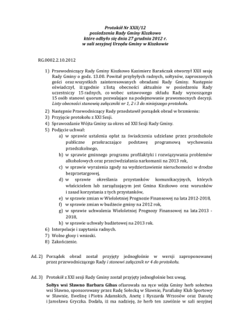 Protokół Nr XXII/12 posiedzenia Rady Gminy Kiszkowo które odbyło