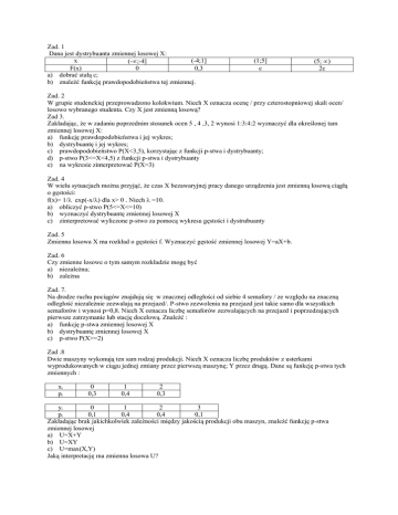 Zad. 1 Dana jest dystrybuanta zmiennej losowej X: x (-4;1] (-∝;-4] F(x) 0 0,3 a) dobrać stałą c; b) znaleźć funkcję prawdopodobieństwa tej zmiennej. (1;5] c (5; ∝) 2c Zad. 2 W grupie studenckiej przeprowadzono kolokwium. Niech X oznacza ocenę / przy czterostopniowej skali ocen/ losowo wybranego studenta. Czy X jest zmienną losową? Zad 3. Zakładając, że w zadaniu poprzednim stosunek ocen 5 , 4 ,3, 2 wynosi 1:3:4:2 wyznaczyć dla określonej tam zmiennej losowej X: a) funkcję prawdopodobieństwa i jej wykres; b) dystrybuantę i jej wykres; c) prawdopodobieństwo P(X<3,5), korzystając z funkcji p-stwa i dystrybuanty; d) p-stwo P(3<=X<4,5) z funkcji p-stwa i dystrybuanty e) na wykresie zinterpretować P(X=3) Zad. 4 W wielu sytuacjach można przyjąć, że czas X bezawaryjnej pracy danego urządzenia jest zmienną losową ciągłą o gęstości: f(x)= 1/λ exp(-x/λ) dla x> 0 . Niech λ =10. a) obliczyć p-stwo P(5<=X<=10) b) wyznaczyć dystrybuantę zmiennej losowej X c) zinterpretować wyliczone p-stwo za pomocą wykresu gęstości i dystrubuanty Zad. 5 Zmienna losowa X ma rozkład o gęstości f. Wyznaczyć gęstość zmiennej losowej Y=aX+b. Zad. 6 Czy zmienne losowe o tym samym rozkładzie mogę być a) niezależna; b) zależna Zad. 7. Na drodze ruchu pociągów znajdują się w znacznej odległości od siebie 4 semafory / ze względu na znaczną odległość niezależnie zezwalają na przejazd/. P-stwo zezwolenia na przejazd jest takie samo dla wszystkich semaforów i wynosi p=0,8. Niech X oznacza liczbę semaforów zezwalających na przejazd i poprzedzających pierwsze zatrzymanie lub stację docelową. Znaleźć : a) funkcję p-stwa zmiennej losowej X b) dystrybuantę zmiennej losowej X c) p-stwo P(X>=2) Zad .8 Dwie maszyny wykonują ten sam rodzaj produkcji. Niech X oznacza liczbę produktów z usterkami wyprodukowanych w ciągu jednej zmiany przez pierwszą maszynę; Y przez drugą. Dane są funkcję p-stwa tych zmiennych : xi pi 0 0,3 1 0,4 2 0,3 yi 0 1 2 3 pi 0,1 0,4 0,4 0,1 Zakładając brak jakichkolwiek zależności między jakością produkcji obu maszyn, znaleźć funkcję p-stwa zmiennej losowej a) U=X+Y b) U=XY c) U=max(X,Y) Jaką interpretację ma zmienna losowa U?